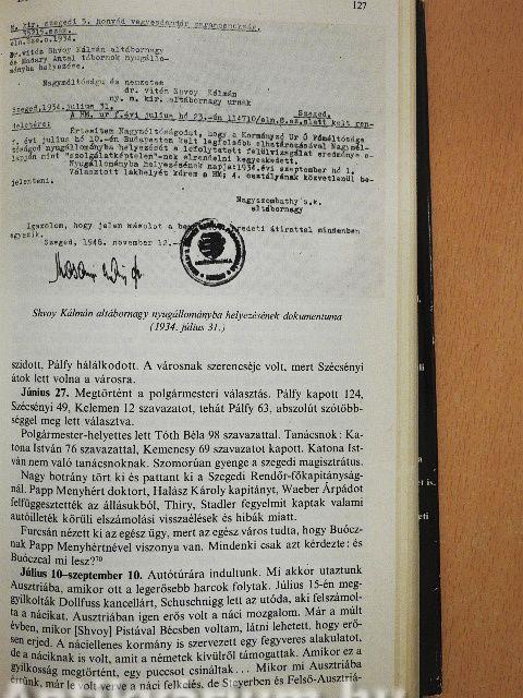 Shvoy Kálmán horthysta altábornagy és politikus titkos, nem a nyilvánosság számára készült naplójának és emlékiratának közreadásával olyan történeti értéket képviselő anyagot nyújtunk át az olvasónak, amelynek forgatása hozzájárulhat az ellenforradalmi korszak történetének árnyaltabb megismeréséhez. A napló és emlékirat szerzője a jelzett időszakban fontos tisztségeket töltött be, közelről ismerte a korszak vezetőit, bizalmukat bírta. Shvoy Kálmán 1881. február 12-én született Budapesten. 1899-ben fejezte be tanulmányait a Ludovika Akadémián. Végigharcolta az első világháborút, 1918 végén érkezett vissza Szegedre. Itt először a Katonatanács vezetője volt, majd 1919 júniusától a forradalom ellen szervezkedő nemzeti hadsereg vezérkari főnöke. Gyorsan emelkedett beosztásaiban. 1922-ben Budapesten a vezérkari főnök szárnysegéde, majd 1923-tól a honvédfőparancsnok vezérkari főnöke lett. 1926-ban nevezték ki tábornokká. 1930-ban a szegedi vegyesdandár parancsnoki tisztét kapja. 1931-ben altábornagyi rangot. 1934 hozta a törést katonai pályafutásában. Az első világháborúban elesett zsidó katonák emlékművének felavatásánál mondott beszéde miatt nyugállományba helyezték. Ekkor kezdett bekapcsolódni a politikai életbe. 1935 januárjában a kormánypárt szegedi szervezetének elnökévé választották, s még ugyanebben az évben országgyűlési képviselővé. 1936-ban lett a kormánypárt Véderő Bizottságának elnöke, a kormánypárt vezetőségének tagja. Mint politikus először Gömbös híve, aztán csak Gömbös halála akadályozza meg, hogy szembeforduljon politikájával. Részt vesz Imrédy miniszterelnök megbuktatásában a kormánypárt szakadását előidéző disszidens csoport tagjaként. Ettől kezdve szembefordul mind a kormánypárttal, mind az egyre inkább előretörő "fajvédő", jobboldali és nyilas irányzatokkal. Az 1939-es választásokon már a Kisgazdapárt jelöltjeként indul, de nem sikerül bejutnia a parlamentbe, s ettől kezdve kiterjedt politikai hajsza indul ellene. A nyilasok "közismert baloldali kapcsolatai" miatt internálják, internáltként éli át a háború utolsó hónapjait.