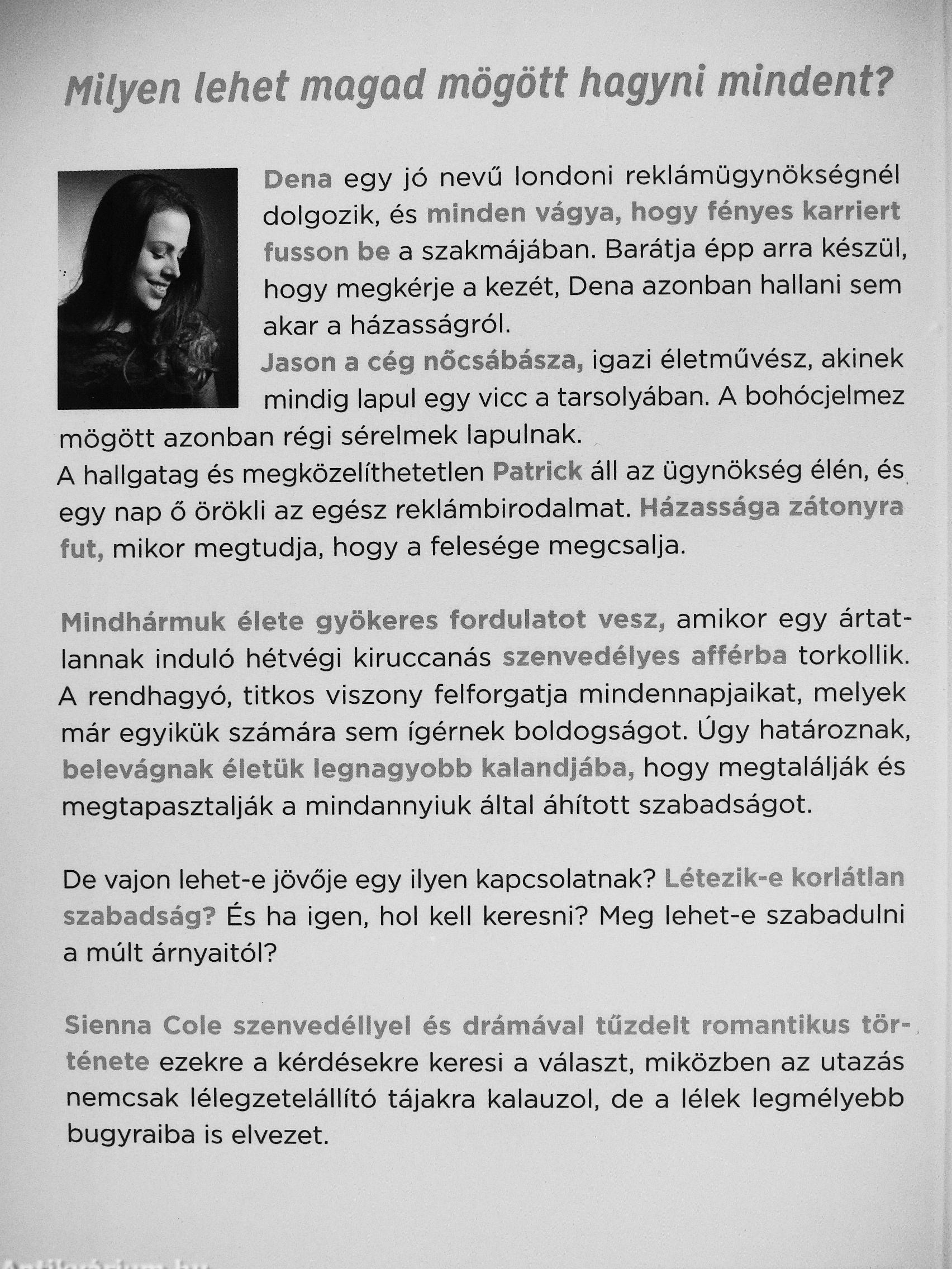 Sienna Colé szenvedéllyel és drámával tűzdelt romantikus története ezekre a kérdésekre keresi a választ, miközben az utazás nemcsak lélegzetelállító tájakra kalauzol, de a lélek legmélyebb bugyraiba is elvezet.