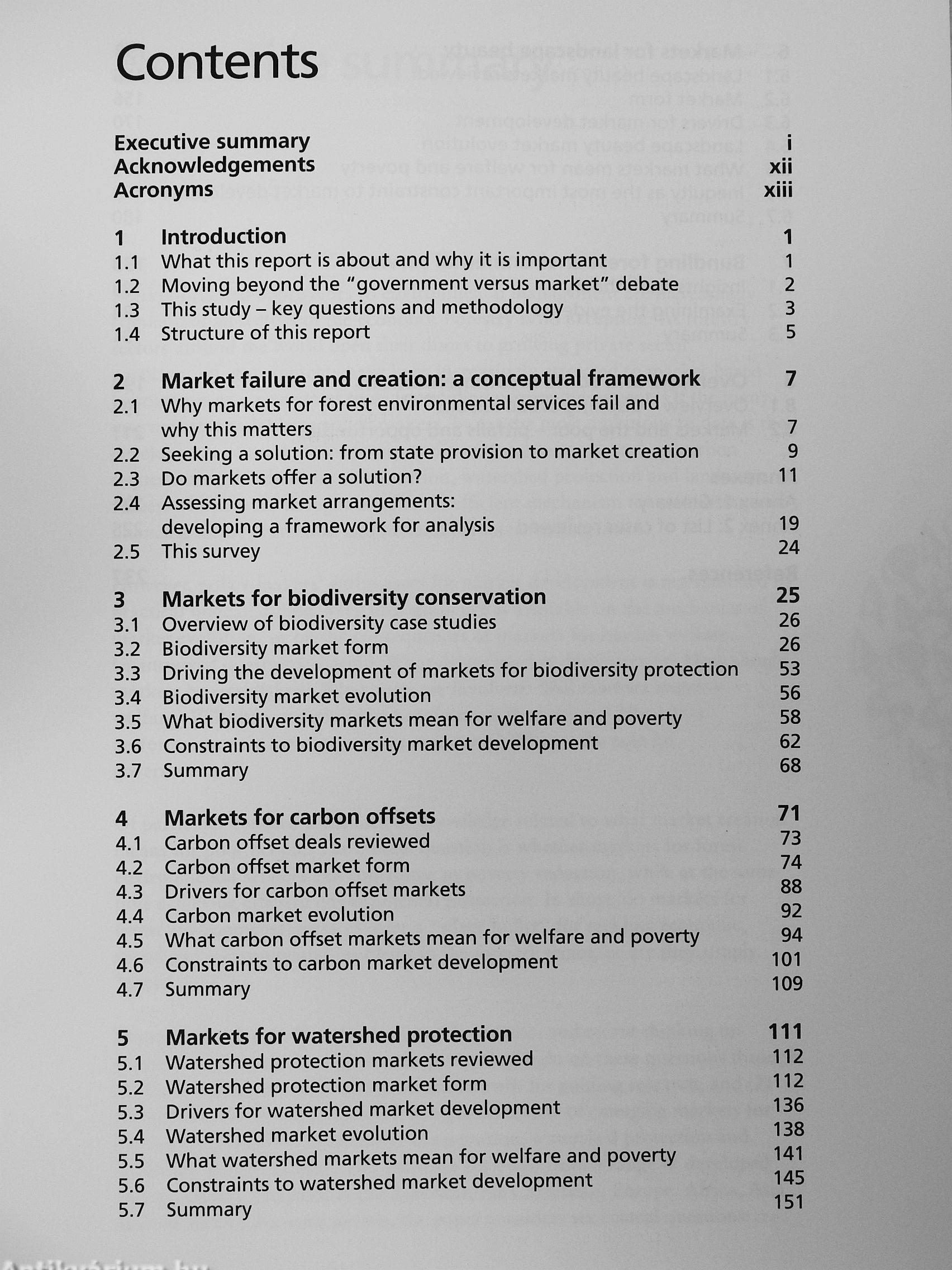 In such times of change, it is difficult to stand back and take stock. Yet, it is during such times that guidance is most needed. Unanswered questions abound. What drives market development? How should markets be established? What costs are involved? Will markets improve welfare? Will some stakeholders benefit more than others? How does performance vary between market structures? What is the role for governments? In the rush to introduce market-based solutions to environmental problems, a particular concern is how markets are impacting on poorer groups.