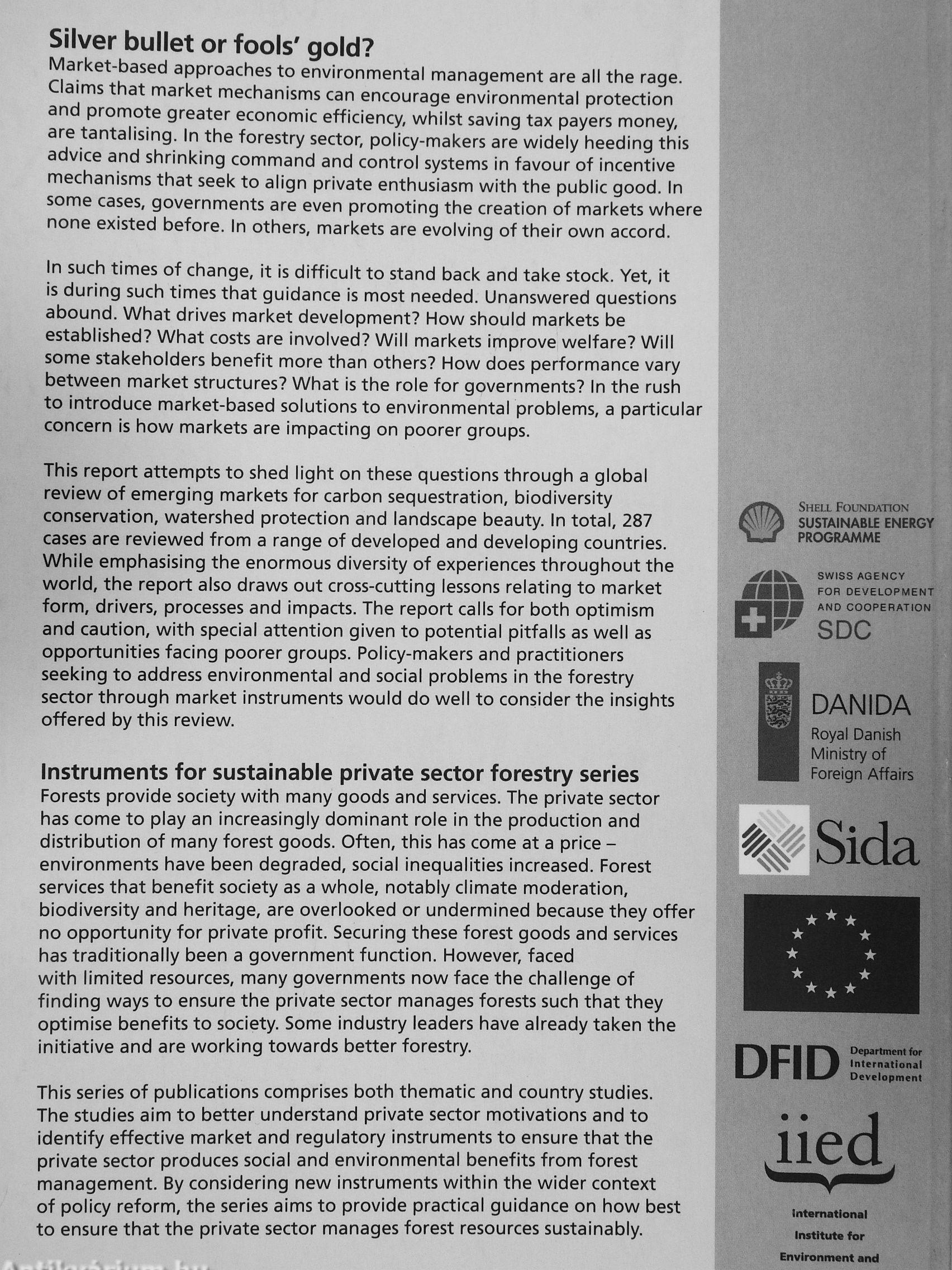 Market-based approaches to environmental management are all the rage. Claims that market mechanisms can encourage environmental protection and promote greater economic efficiency, whilst saving tax payers money, are tantalising. In the forestry sector, policy-makers are widely heeding this advice and shrinking command and control systems in favour of incentive mechanisms that seek to align private enthusiasm with the public good. In some cases, governments are even promoting the creation of markets where none existed before. In others, markets are evolving of their own accord.