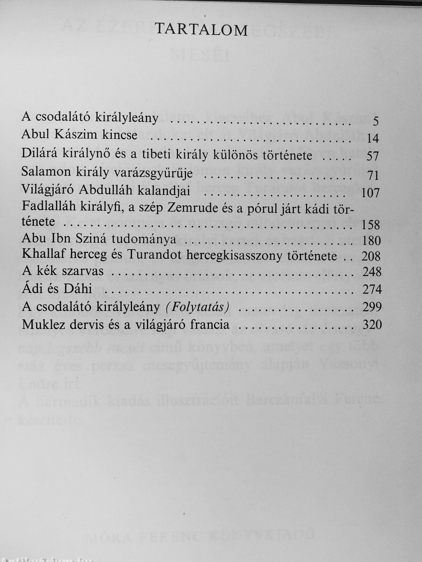 | Megjegyzés: | Fekete-fehér és színes illusztrációkkal. Ez a könyv az Ezeregynap című perzsa gyűjtemény meséinek szabad feldolgozása. Harmadik, felújított kiadás. |