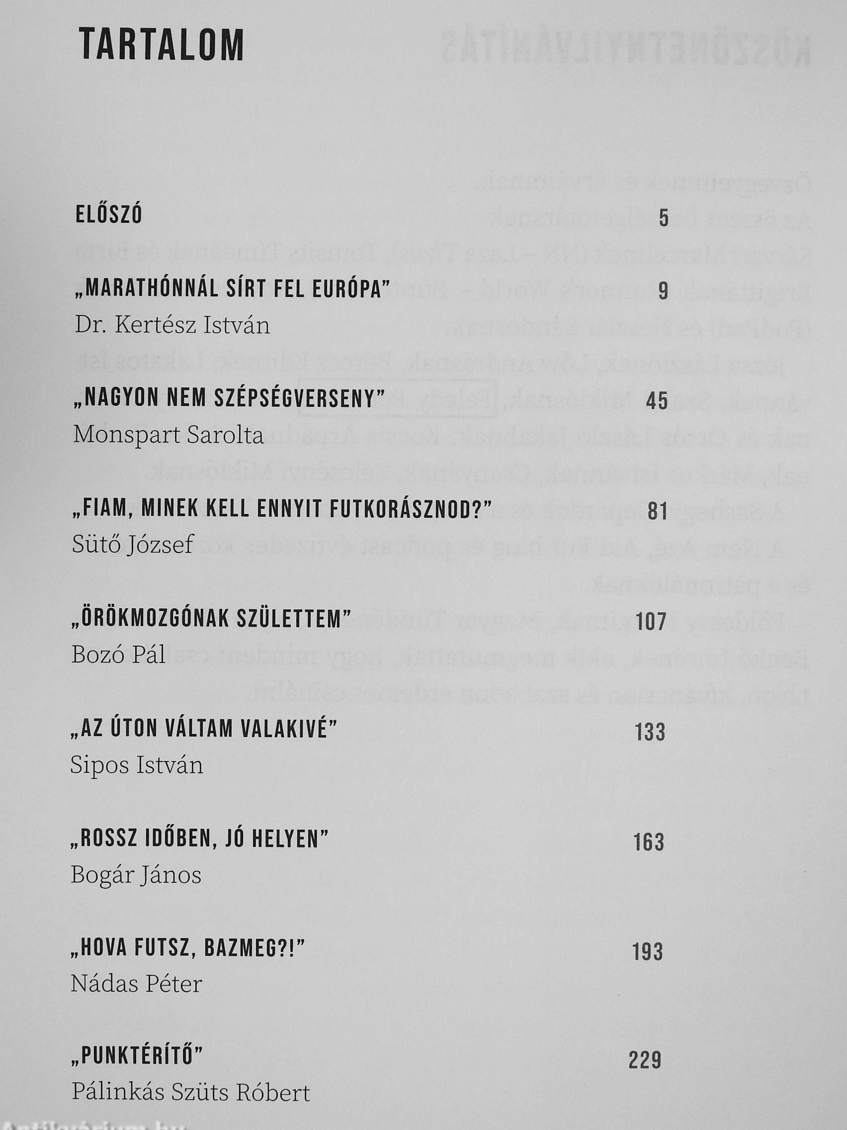 A könyvben 22, az élet változatos területein munkálkodó személyiség tűnik fel, akiket a futás köt össze. Ez a tényszerű, egyszerű, korrekt tevékenység tükröt tart elénk, és képes arra, hogy a maga valójában mutassa meg az embert az imázs mögött.