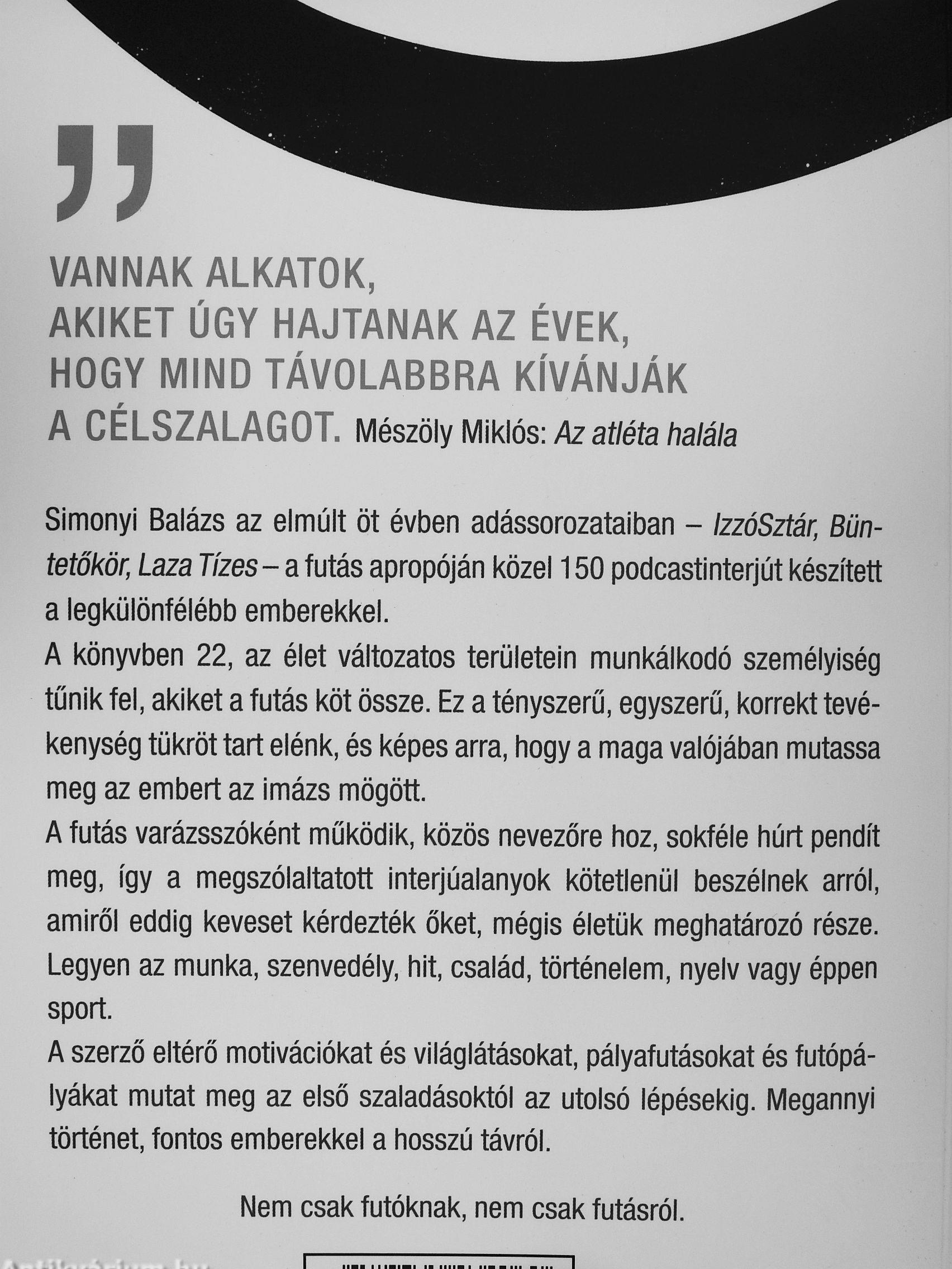 A szerző eltérő motivációkat és világlátásokat, pályafutásokat és futópályákat mutat meg az első szaladásoktól az utolsó lépésekig. Megannyi történet, fontos emberekkel a hosszú távról.
