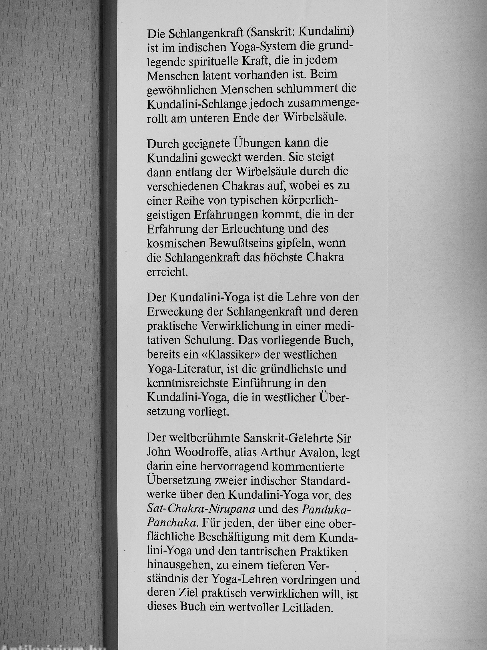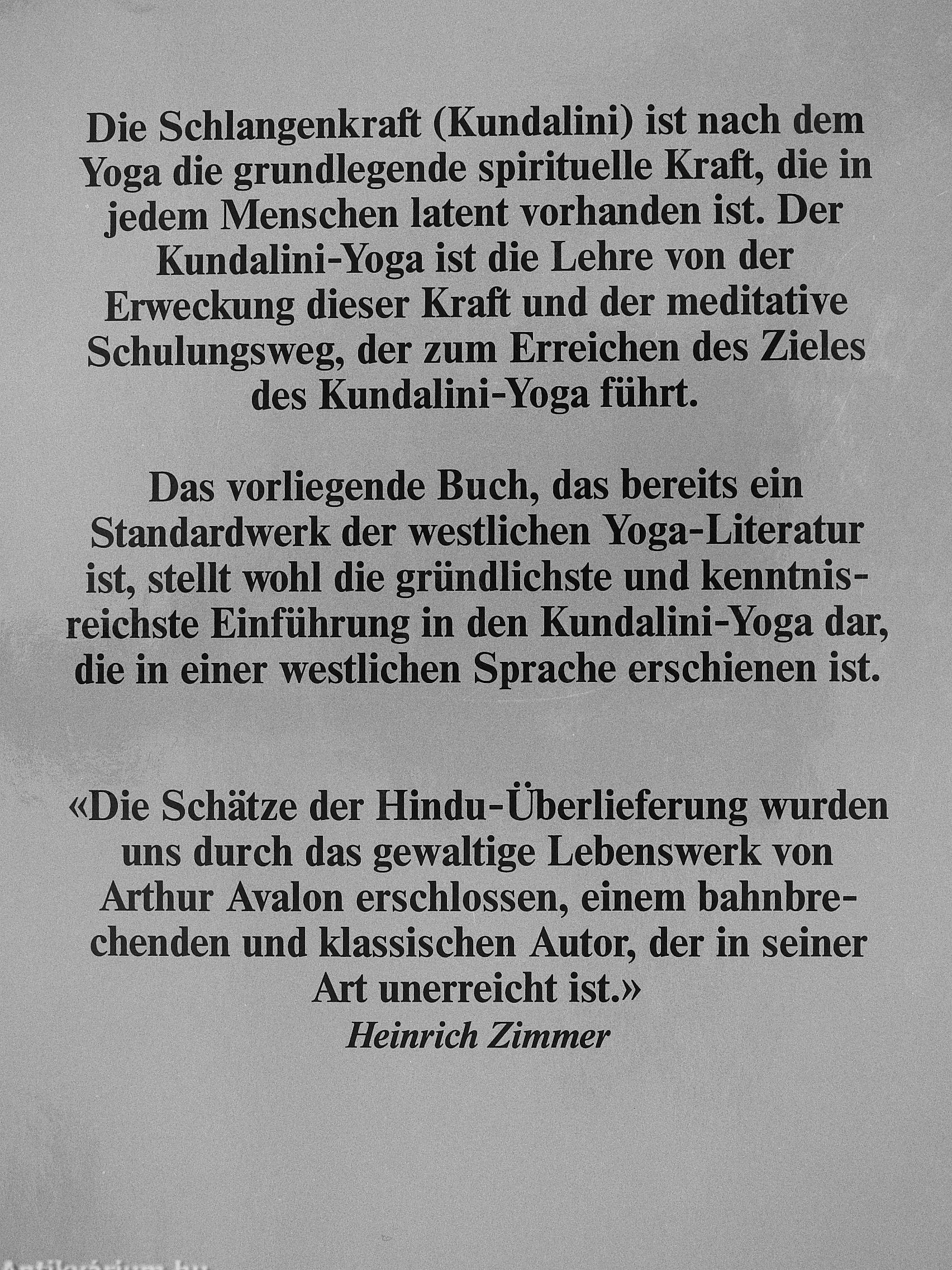Das vorliegende Buch, das bereits ein Standardwerk der westlichen Yoga-Literatur ist, stellt wohl die gründlichste und kenntnisreichste Einführung in den Kundalini-Yoga dar, die in einer westlichen Sprache erschienen ist.