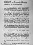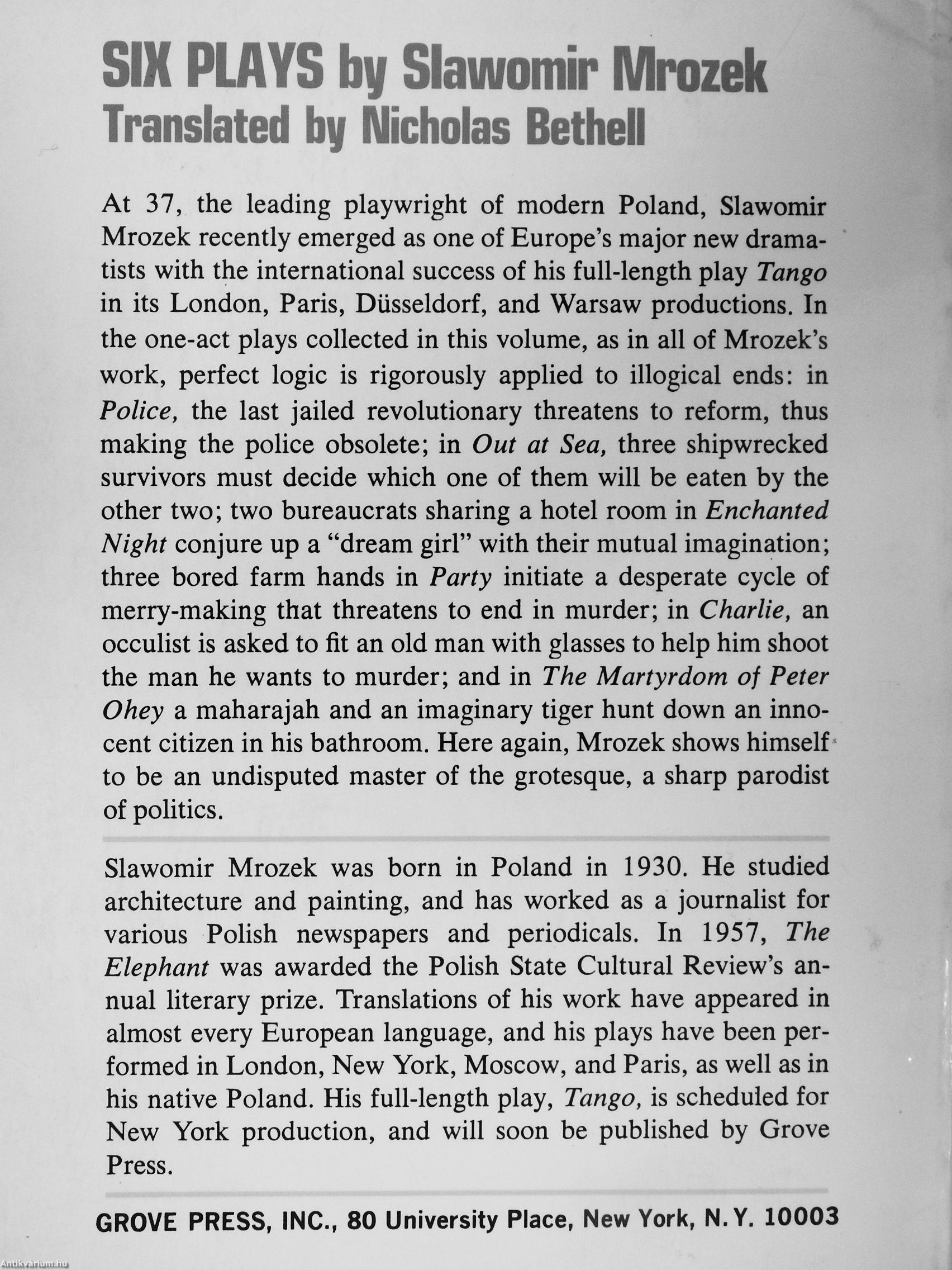 Slawomir Mrozek was born in Poland in 1930. He studied architecture and painting, and has worked as a journalist for various Polish newspapers and periodicals. In 1957, The Elephant was awarded the Polish State Cultural Review's annual literary prize. Translations of his work have appeared in almost every European language, and his plays have been performed in London, New York, Moscow, and Paris, as well as in his native Poland. His full-length play. Tango, is scheduled for New York production, and will soon be published by Grove Press.