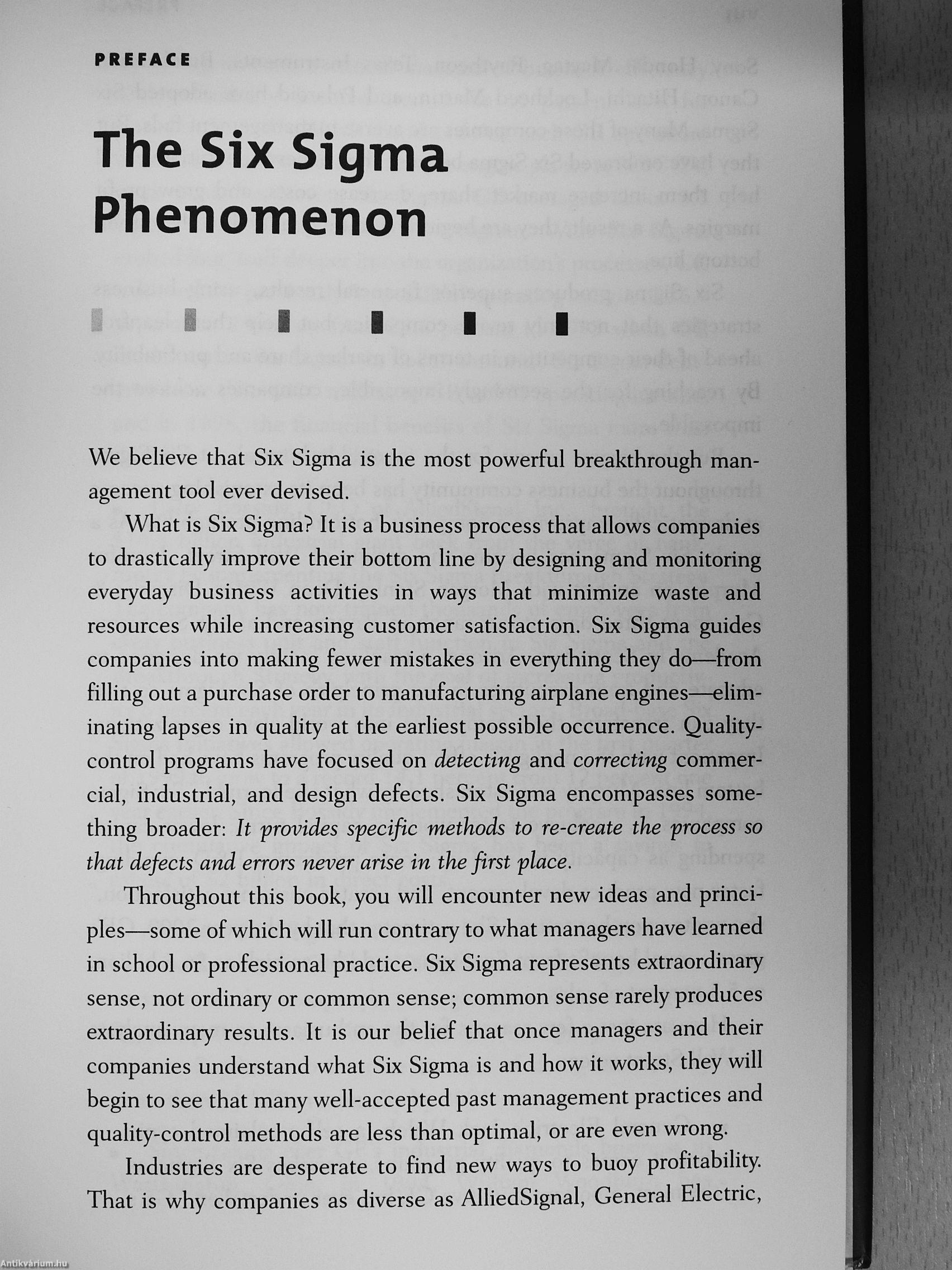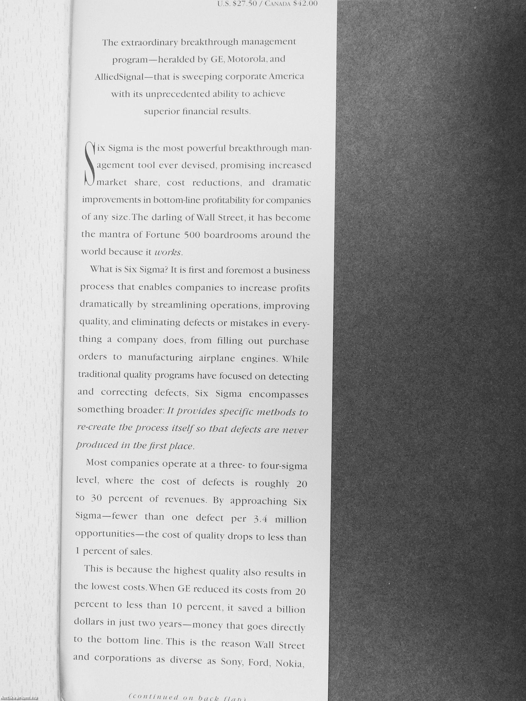 ix Sigma is ihe most powerful breakthrough management tool ever devised, promising increased market share, cost reductions, and dramatic improN cnicnts in bottom-line prolitabilit) for companies of any size.The darling of Wall Street, it has become the manira of I'ortLine 500 boardrooms around the world because il works.