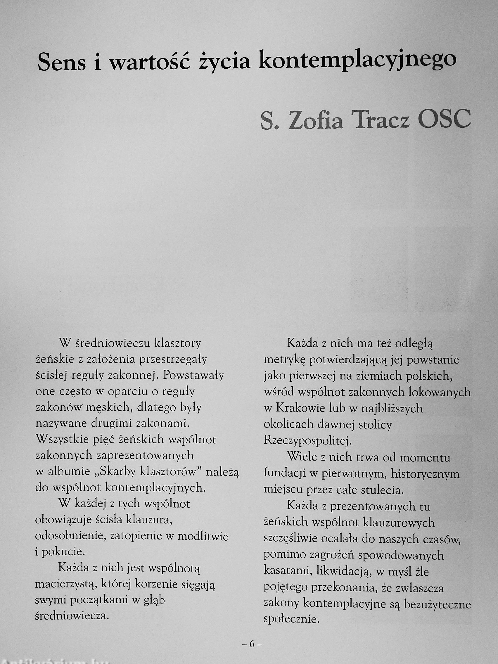 Skarby - wspaniale dziek sztuki, przedmioty kultu wykonane r^kami genialnych artystów, gromadzone przez dlugie wieki w zabytkowych wn^trzach za murami zakonnych wspólnot. Ale takze skarby jeszcze wi^ksze! - to bezcenne wartosci duchowe, które zawiera zycie poswi^cone calkowicie Bogu, modlitwie, kontemplacji rzeczy Bozych oraz pracy dia dobra zakonnej wspólnoty.