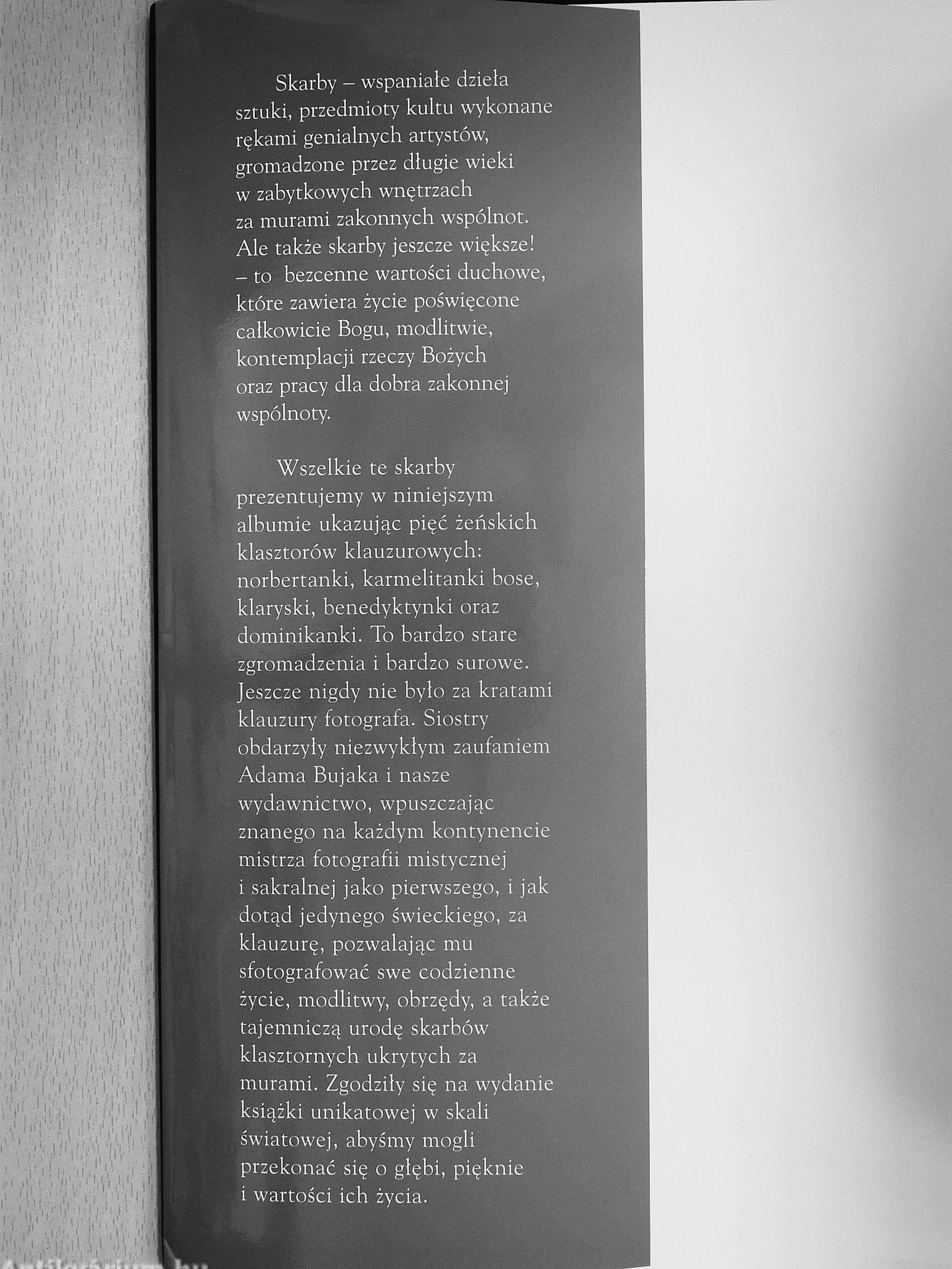 Wszelkie te skarby prezentujemy w niniejszym albumie ukazujgc pi?c zenskich klasztorów klauzurowych: norbertanki, karmelitanki bose, klaryski, benedyktynki oraz dominikanki. To bardzo stare zgromadzenia i bardzo surowe. Jeszcze nigdy nie bylo za kratami klauzury fotografa. Siostry obdarzyly niezwyklym zaufaniem Adama Bujaka i nasze wydawnictwo, wpuszczajqc znanego na kazdym kontynencie mistrza fotografii mistycznej i sakralnej jako pierwszego, i jak dot^d jedynego swieckiego, za klauzury, pozwalaj^c mu sfotografowac swe codzienne zycie, modlitwy, obrz^dy, a takze tajemniczq urod? skarbów klasztornych ukrytych za murami....