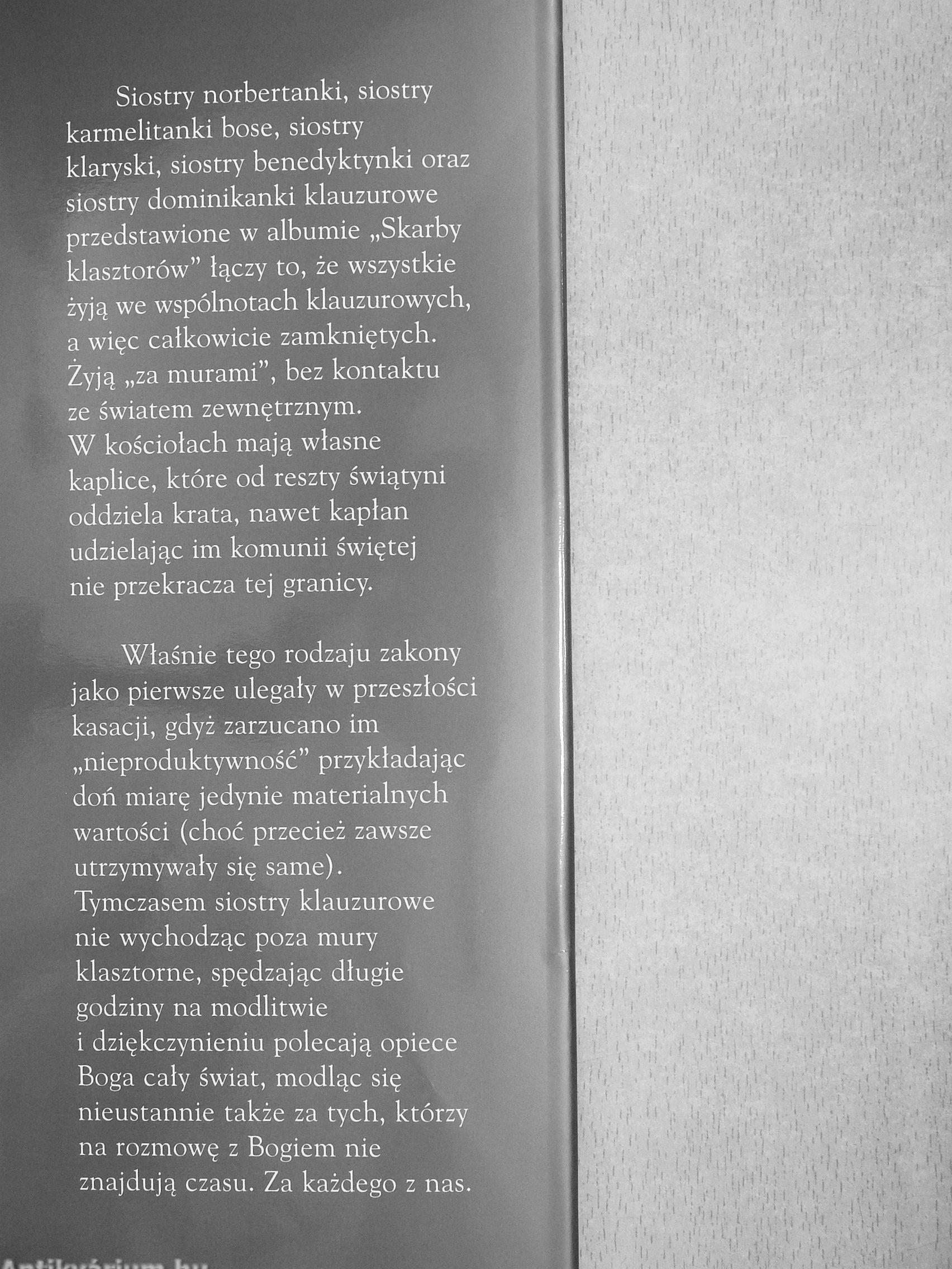 Siostry norbertanki, siostry karmelitanki bose, siostry klaryski, siostry benedyktynki oraz siostry dominikanki klauzurowe przedstawione w albumie „Skarby klasztorów" l^czy to, ze wszystkie zyjq we wspólnotach klauzurowych, a wi^c calkowicie zamkni^tych. Zyj^ „za murami", bez kontaktu ze swiatem zewn^trznym. W kosciolach majq wlasne kaplice, które od reszty swi^tyni oddziela krata, nawet kaplan udzielaj^c im komunii swi^tej nie przekracza tej granicy.