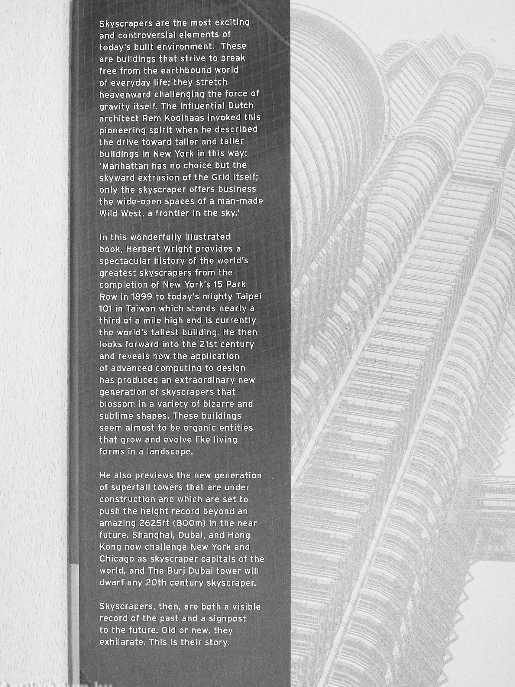 Skyscrapers are the most exciting and controversial elements of today's built environment. These are buildings that strive to break free from the earthbound world of everyday life; they stretch heavenviiard challenging the force of gravity itself. The influential Dutch architect Rem Koolhaas invoked this pioneering spirit when he described the drive toward taller and taller buildings in New York in this way: 'Ivlanhattan has no choice but the skyward extrusion of the Grid itself; only the skyscraper offers business the wide-open spaces of a man-made Wild West, a frontier in the sky.'