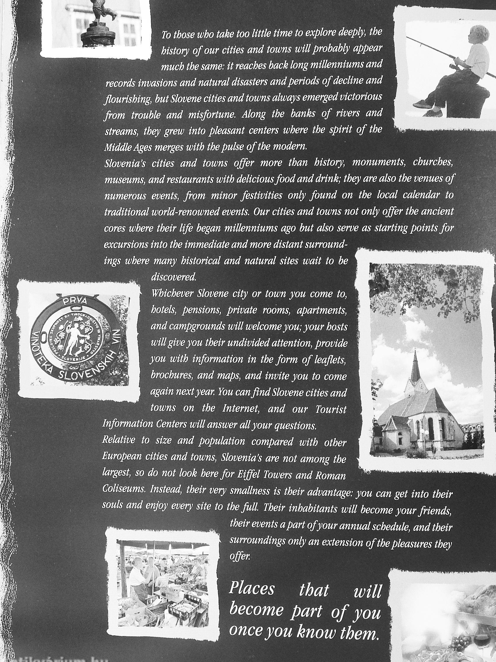 You can merely stroll their main squares and narrow cobbled streets and see tine treasures they hide in passing, or you can become absorbed in them. Every Slovene city and town will open its soul to you and tell its stories. Each house, whether already renovated or still waiting to regain its past glory, has a story, as does every monument, every bridge, and in some places, every stone. You can travel back in time in numerous museums, galleries, and castles; you can feel the pulse of the city in lively coffee shops and bars, attractive restaurants, and specialized stores; and you can get to know the city when you meet its people, friendly people more than willing to give you directions with a smile and a gesture of the arm or show you on a map and tell you what to see, where to find great food, and when to return when things are more lively.