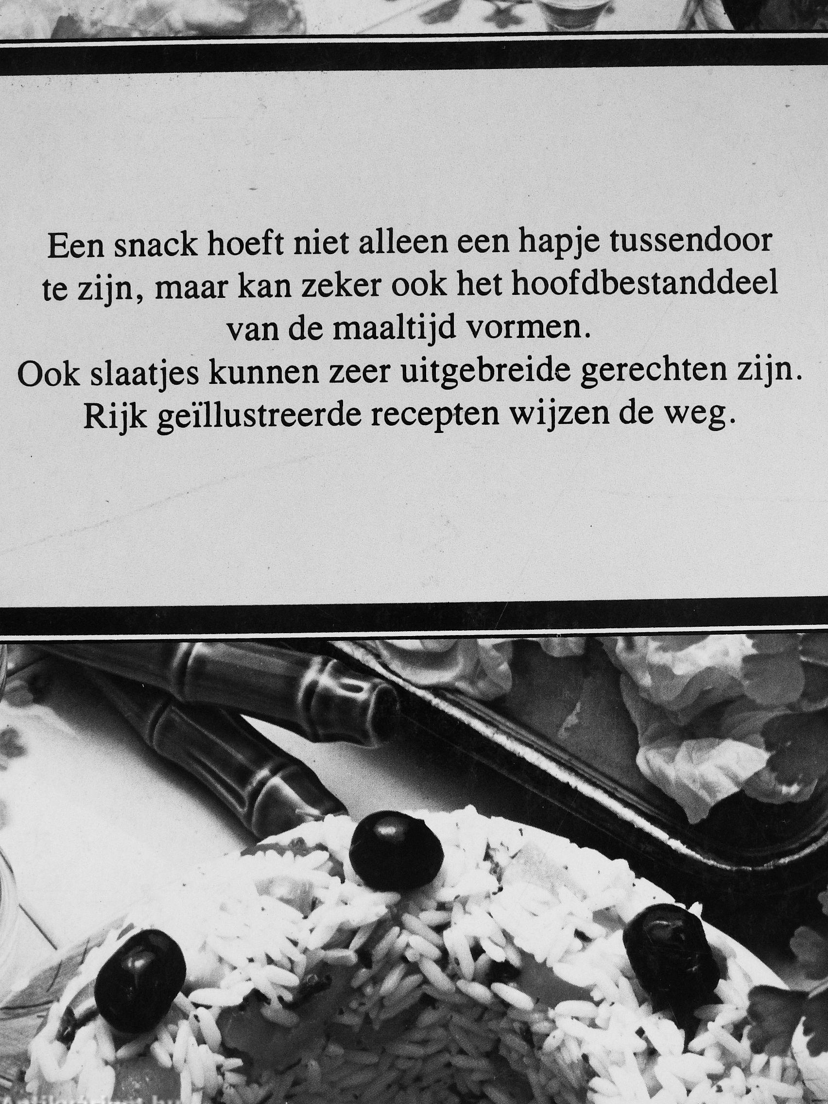 Een snack hoeft niet alleen een hapje tussendoor te zijn, maar kan zeker ook het hoofdbestanddeel van de maaltijd vormen. Ook slaatjes kunnen zeer uitgebreide gerechten zijn. Rijk geillustreerde recepten wijzen de weg.
