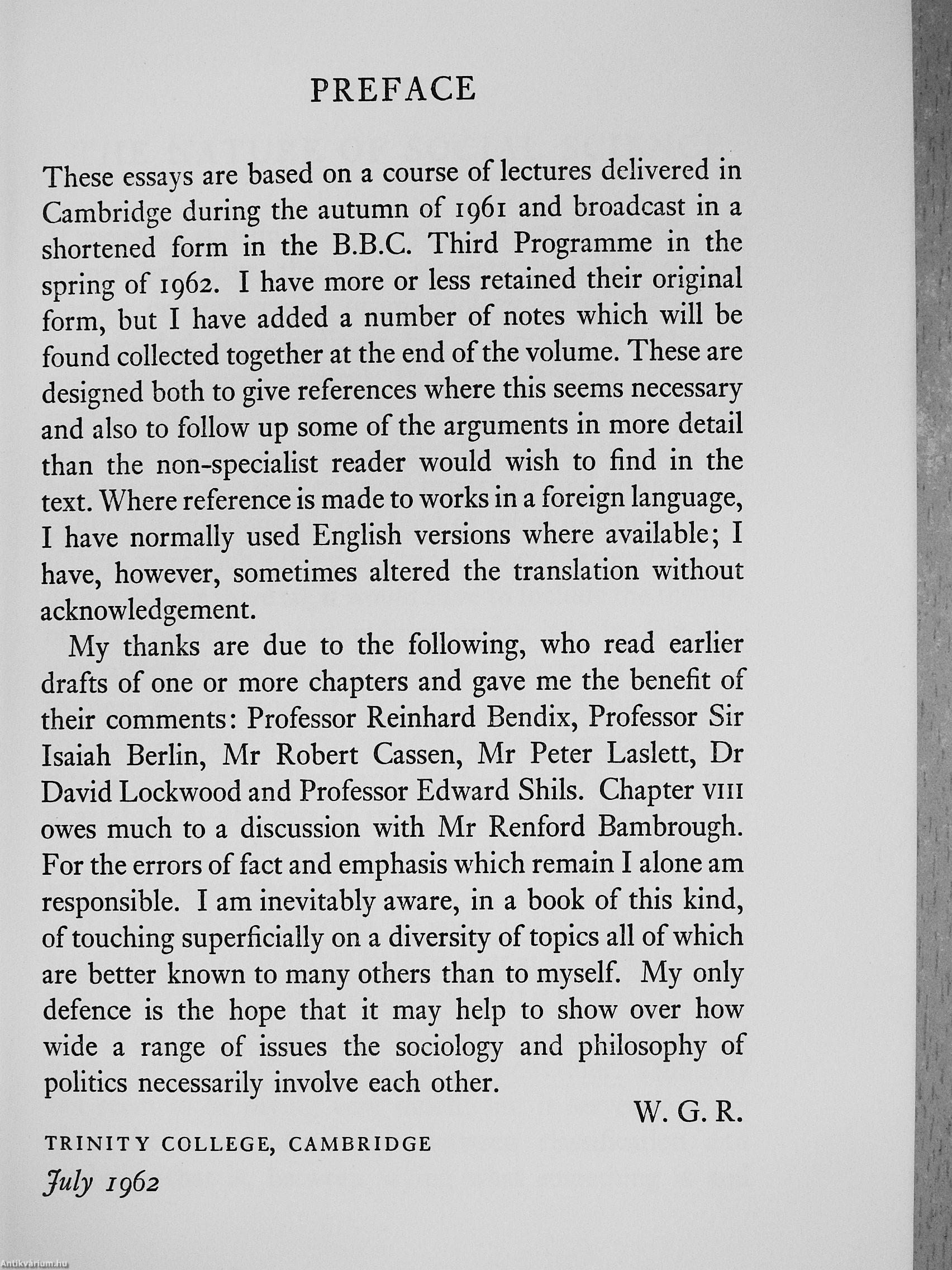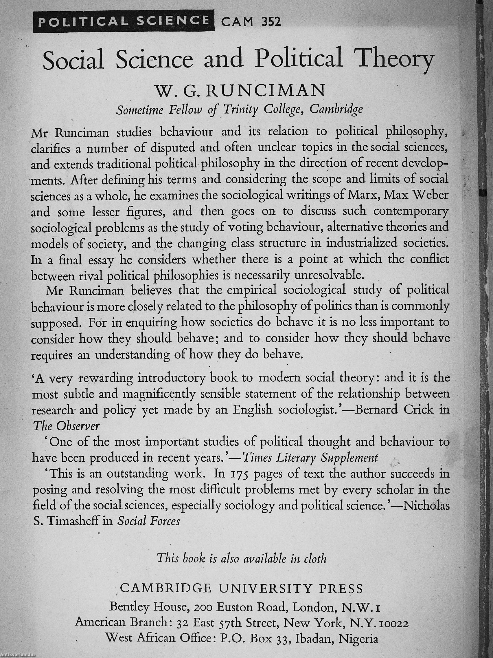 Mr Runciman studies behaviour and its relation to political philosophy, clarifies a number of disputed and often unclear topics in the social sciences, and extends traditional political philosophy in the direction of recent developments. After defining his terms and considering the scope and limits of social sciences as a whole, he examines the sociological writings of Marx, Max Weber and some lesser figures, and then goes on to discuss such contemporary sociological problems as the study of voting behaviour, alternative theories and models of society, and the changing class structure in industrialized societies. In a final essay he considers whether there is a point at which the conflict between rival political philosophies is necessarily unresolvable.