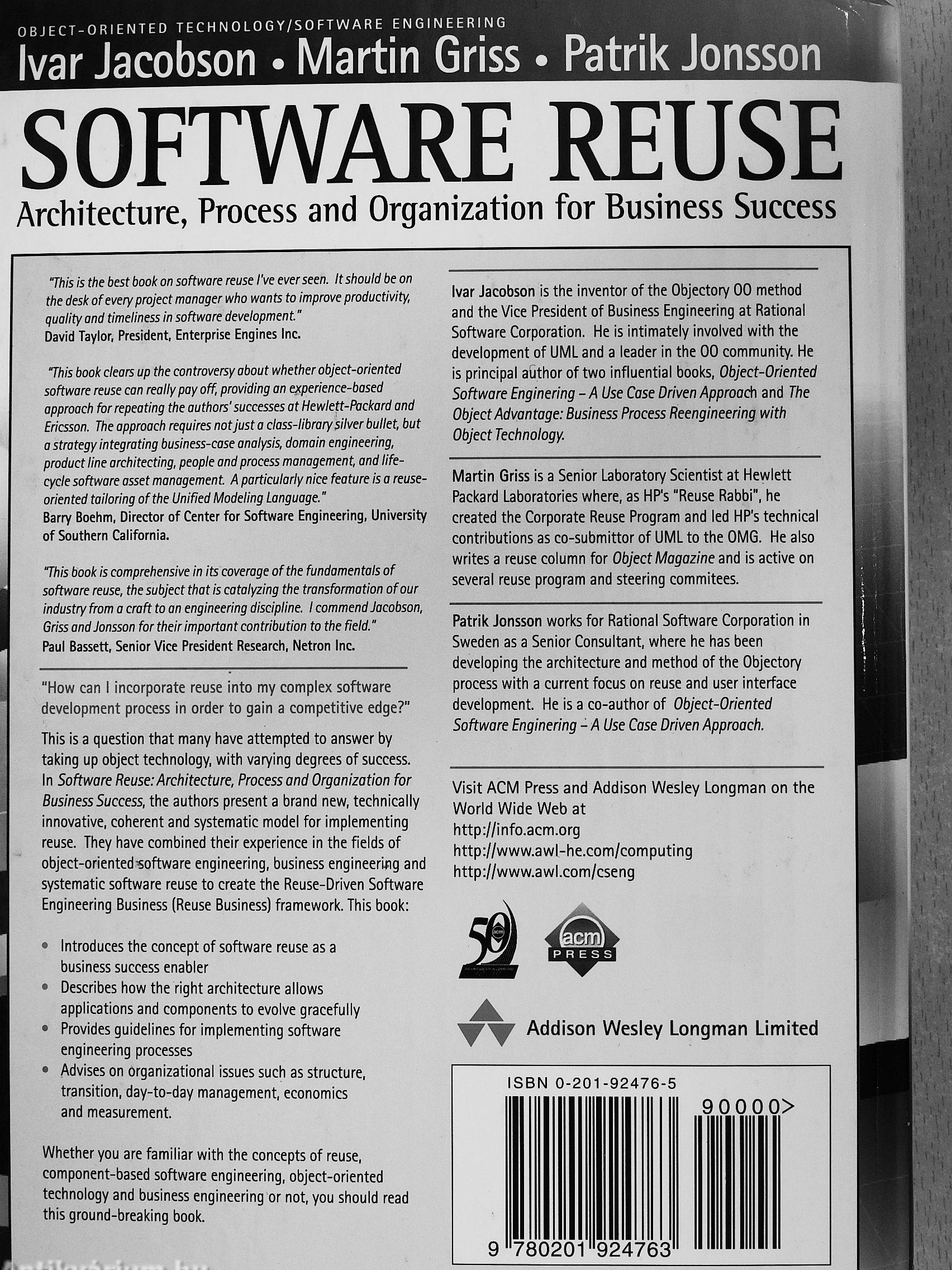 This book is comprehensive in its coverage of the fundamentals of software reuse, the subject that is catalyzing the transformation of our industry from a craft to an engineering discipline. I commend Jacobson, Griss and Jonsson for their important contribution to the field." Paul Bassett, Senior Vice President Research, Netron Inc.