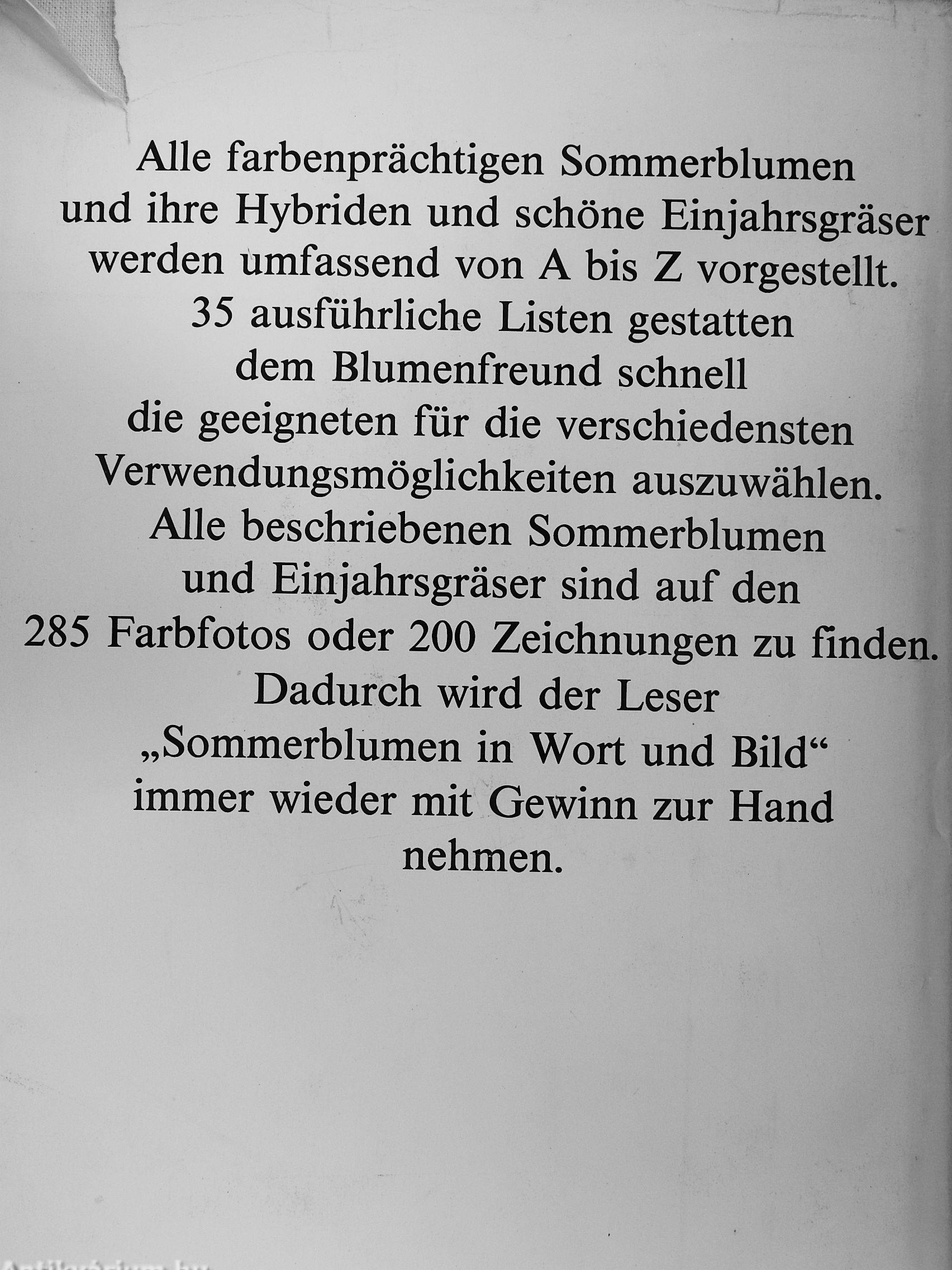 Alle farbenprächtigen Sommerblumen und ihre Hybriden und schöne Einjahrsgräser werden umfassend von A bis Z vorgestellt. 35 ausführliche Listen gestatten dem Blumenfreund schnell die geeigneten für die verschiedensten Verwendungsmöglichkeiten auszuwählen. Alle beschriebenen Sommerblumen und Einjahrsgräser sind auf den 285 Farbfotos oder 200 Zeichnungen zu finden. Dadurch wird der Leser „Sommerblumen in Wort und Bild" immer wieder mit Gewinn zur Hand nehmen.