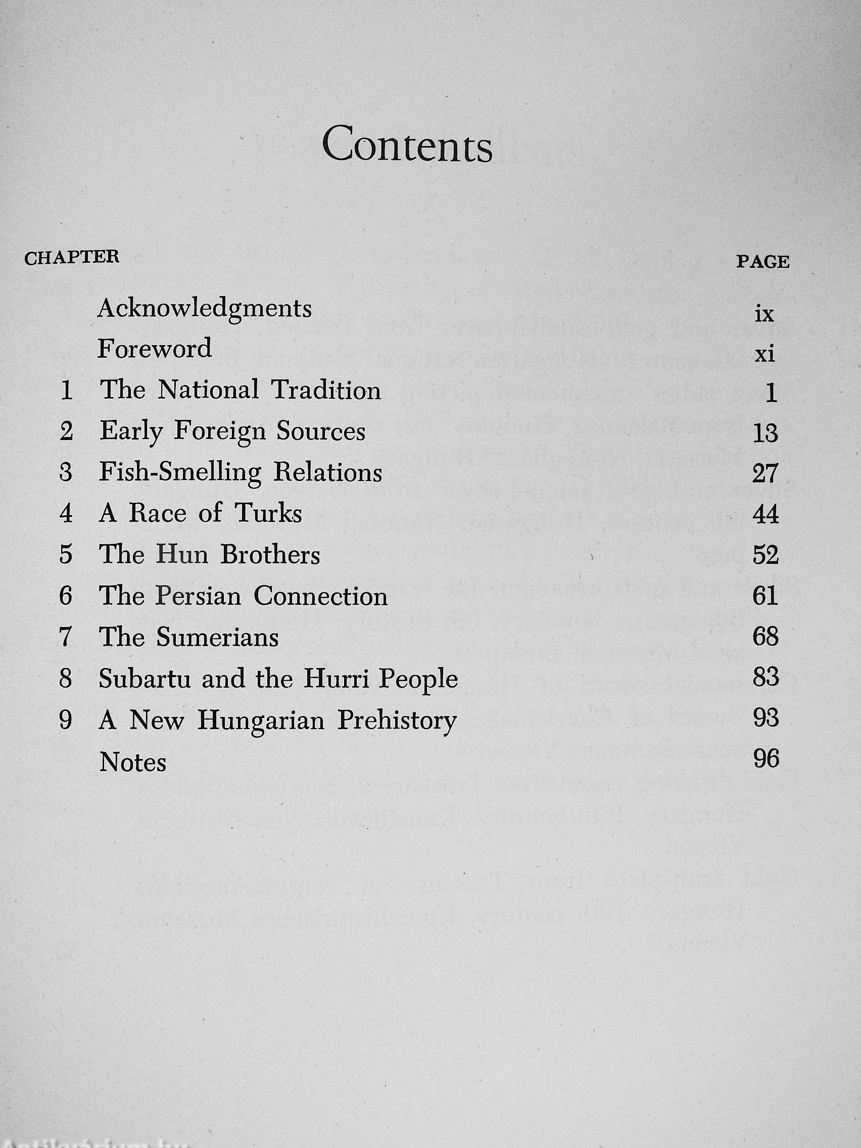 In eight chapters written in a highly readable style yet with scientific precision, the author analyses the Hungarian national tradition, early foreign sources, the ruling theory regarding the origin of the Hungarians, and their connections with Turkic peoples, Huns, Persians, Sumerians, Hur-rians and Subarians. A final chapter summarises the author's conclusions and indicates the way for future research.