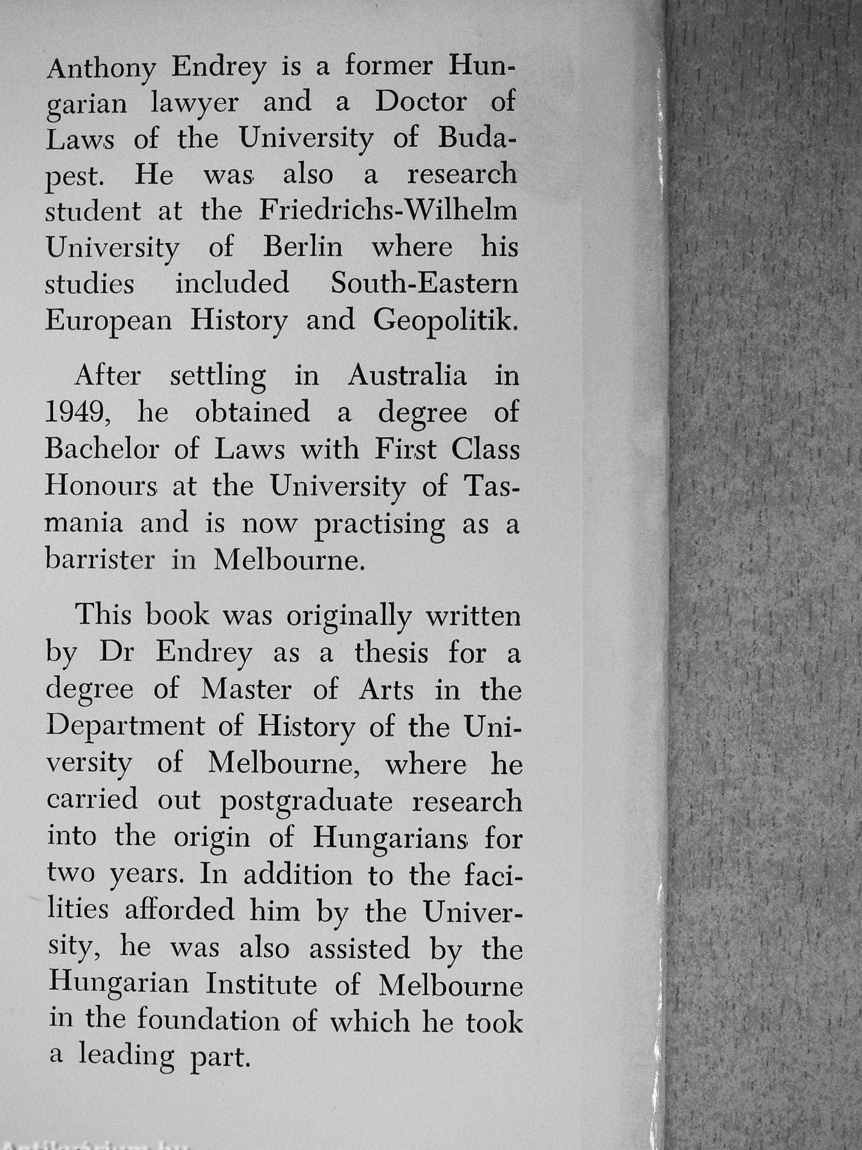 This book was originally written by Dr Endrey as a thesis for a degree of Master of Arts in the Department of History of the University of Melbourne, where he carried out postgraduate research into the origin of Hungarians for two years. In addition to the facilities afforded him by the University, he was also assisted by the Hungarian Institute of Melbourne in the foundation of which he took a leading part.