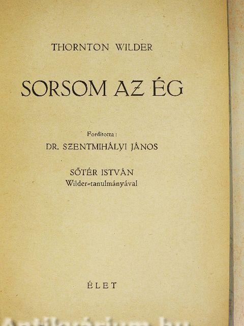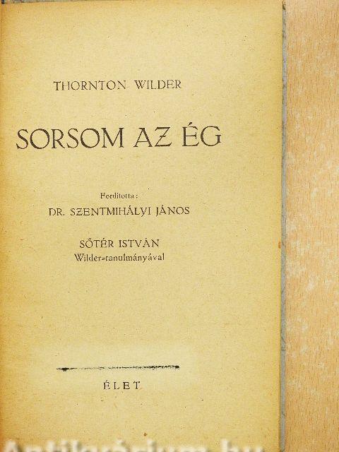 A modern amerikai irodalom egyik legizgalmasabb alakja, egyik úttörő művészete Thornton Wilder. A magyar közönség jól emlékezhetik világhírű darabjának, az "A mi kisvárosunk"-nak a sikerére. Ez a darab szakított a színpadi technika hagyományaival s a drámai ábrázolás szokásos módjaival, mélyebben és közvetlenebbül ragadta meg s állította elénk a teljes embert s a teljes emberi sorsot. A teljes emberit, tehát nemcsak a testit, hanem a lelkit is, nemcsak a természetest, hanem a természetfölöttit is. Ugyanez az igény jellemzi Wilder világhírű regényét, a "Szent Lajos király hídját"-t s ugyanez jellemzi a Sorsom az ég" izgalmas és merész epikáját. Végiggondolni és végigélni a dolgokat, teljesen vállalni világnézetünket: ehhez olyan erő kell s olyan bátorság, mely minduntalan összeütközésbe hoz a társadalommal, s amely, - mert - minduntalan fonákká válhatik. De fonákságaiban is hősies, esendőségében is emelkedett. A "Sorsom az ég" páratlan humorú s megrendítően mély regény, melyben egy ragyogó, fölényes művész nyúl hozzá az életnek ezekhez a bonyolult, nagy kérdéseihez.