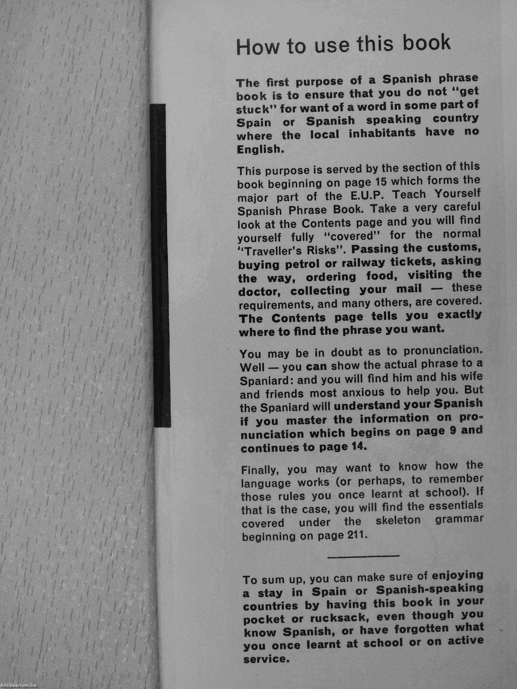 To sum up, you can make sure of enfoying a stay in Spain or Spanish-speaking countries by having this book in your pocket or rucksack, even though you know Spanish, or have forgotten what you once learnt at school or on active service.
