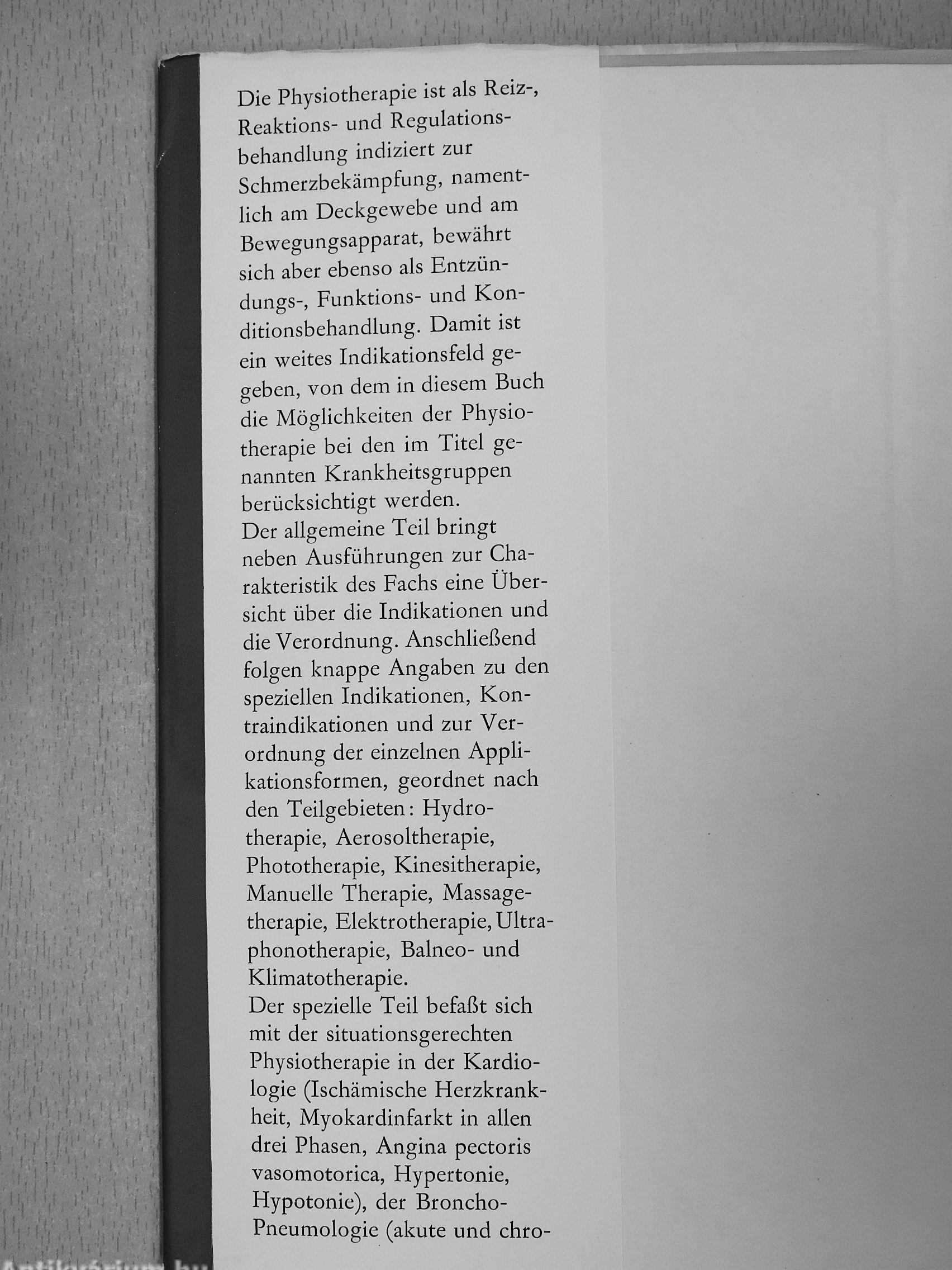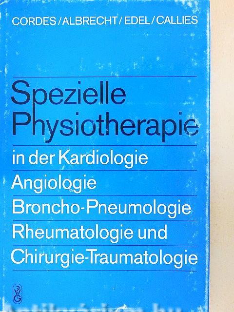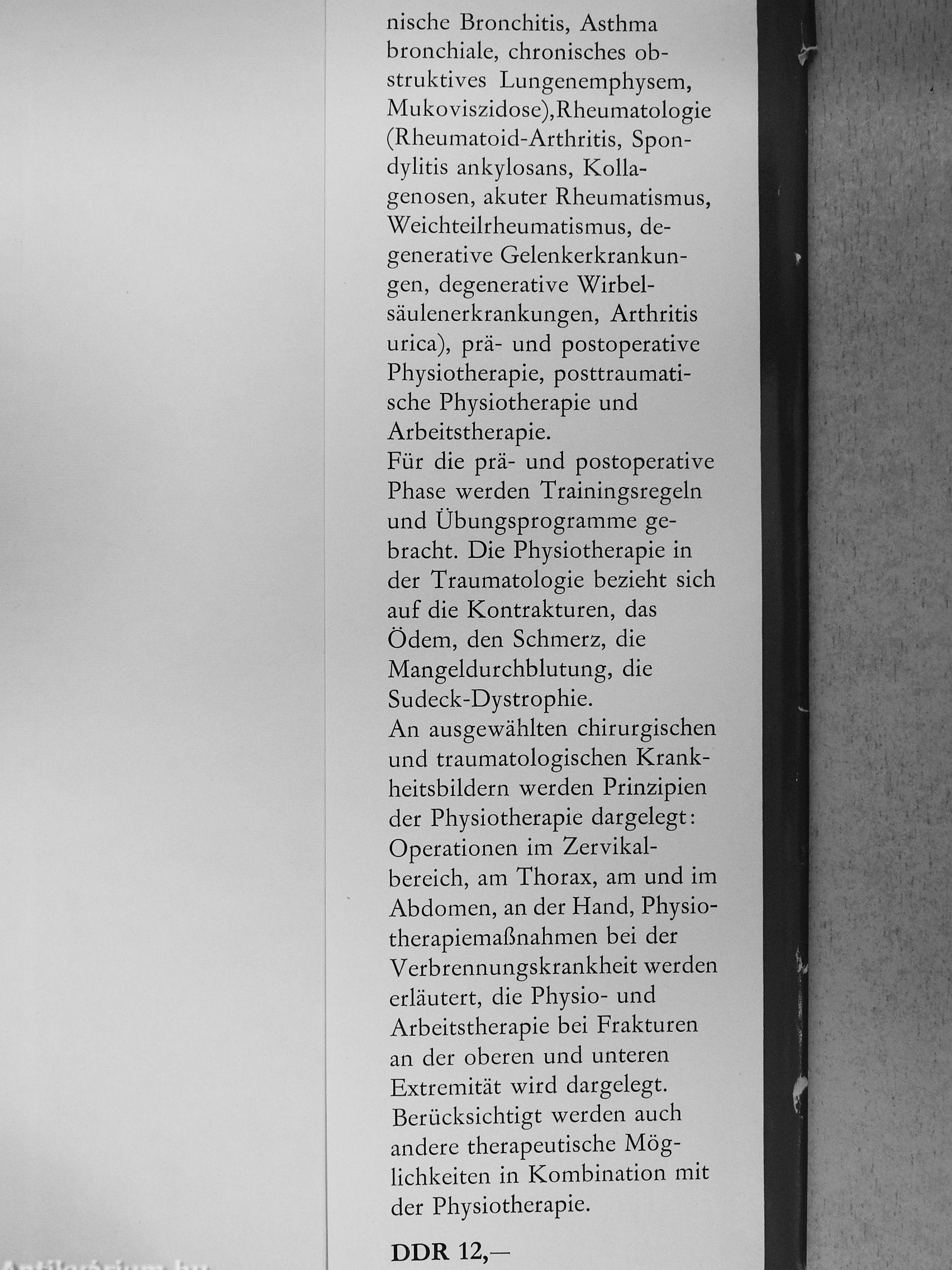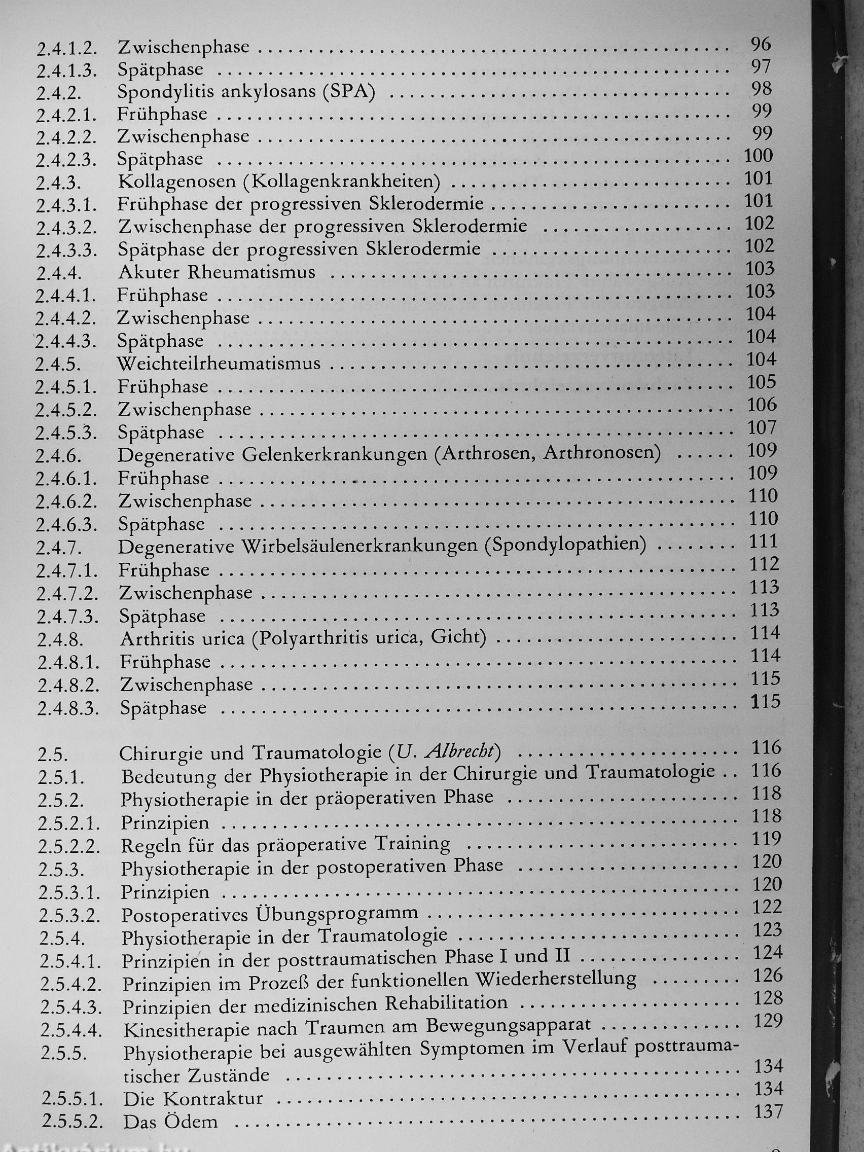 nische Bronchitis, Asthma bronchiale, chronisches obstruktives Lungenemphysem, Mukoviszidose),Rheumatologie (Rheumatoid-Arthritis, Spondylitis ankylosans, Kollagenosen, akuter Rheumatismus, Weichteilrheumatismus, degenerative Gelenkerkrankungen, degenerative Wirbelsäulenerkrankungen, Arthritis urica), prä- und postoperative Physiotherapie, posttraumatische Physiotherapie und Arbeitstherapie. Für die prä- und postoperative Phase werden Trainingsregeln und Übungsprogramme gebracht. Die Physiotherapie in der Traumatologie bezieht sich auf die Kontrakturen, das Ödem, den Schmerz, die Mangeldurchblutung, die Sudeck-Dystrophie. An ausgewählten chirurgischen und traumatologischen Krankheitsbildern werden Prinzipien der Physiotherapie dargelegt: Operationen im Zervikalbereich, am Thorax, am und im Abdomen, an der Hand, Physiotherapiemaßnahmen bei der Verbrennungskrankheit werden erläutert, die Physio- und Arbeitstherapie bei Frakturen an der oberen und unteren Extremität wird dargelegt. Berücksichtigt werden auch andere therapeutische Möglichkeiten in Kombination mit der Physiotherapie.