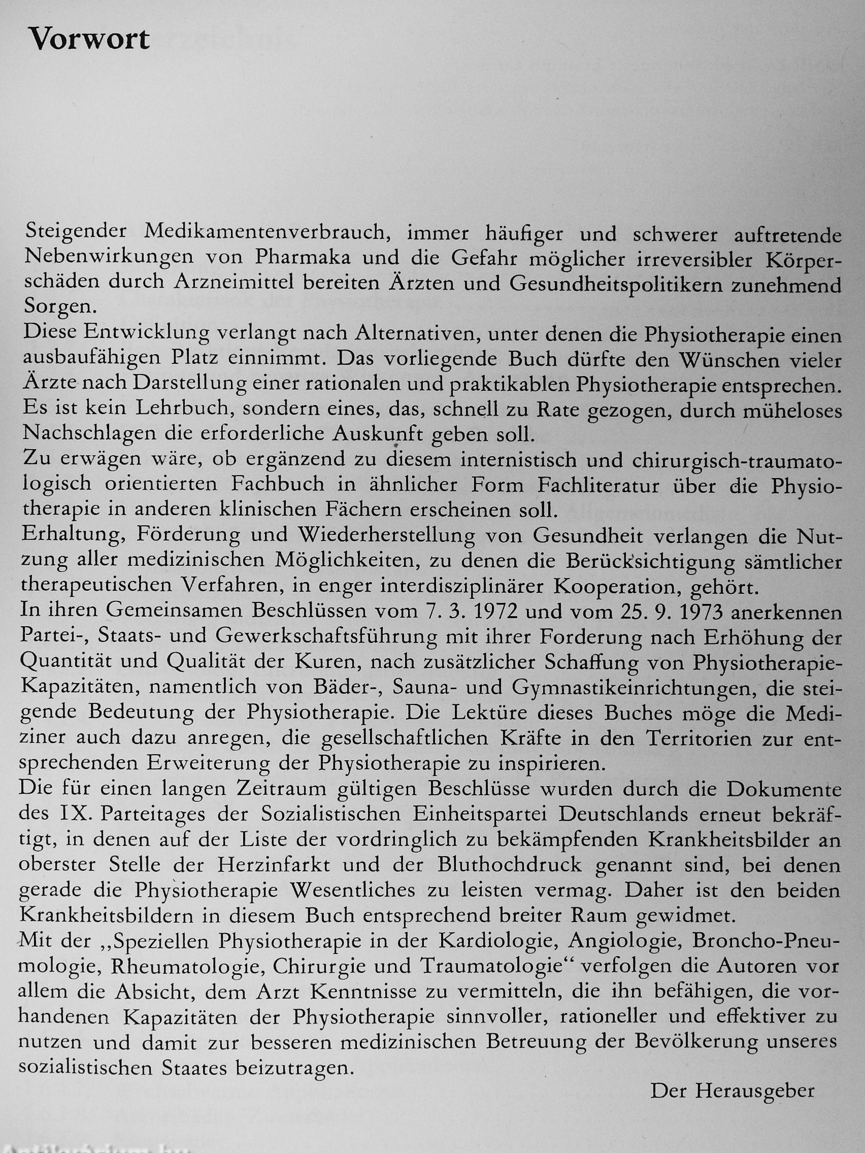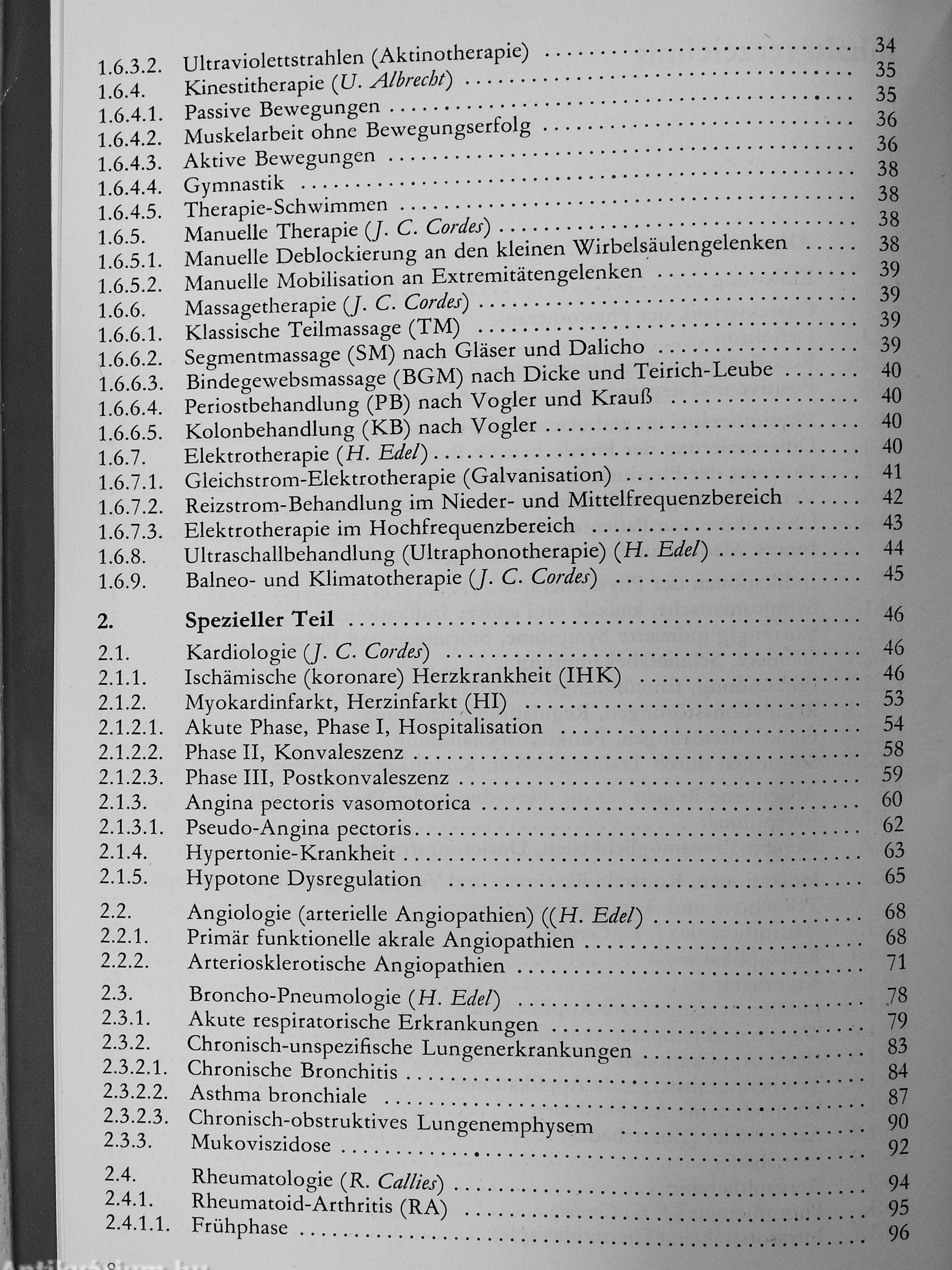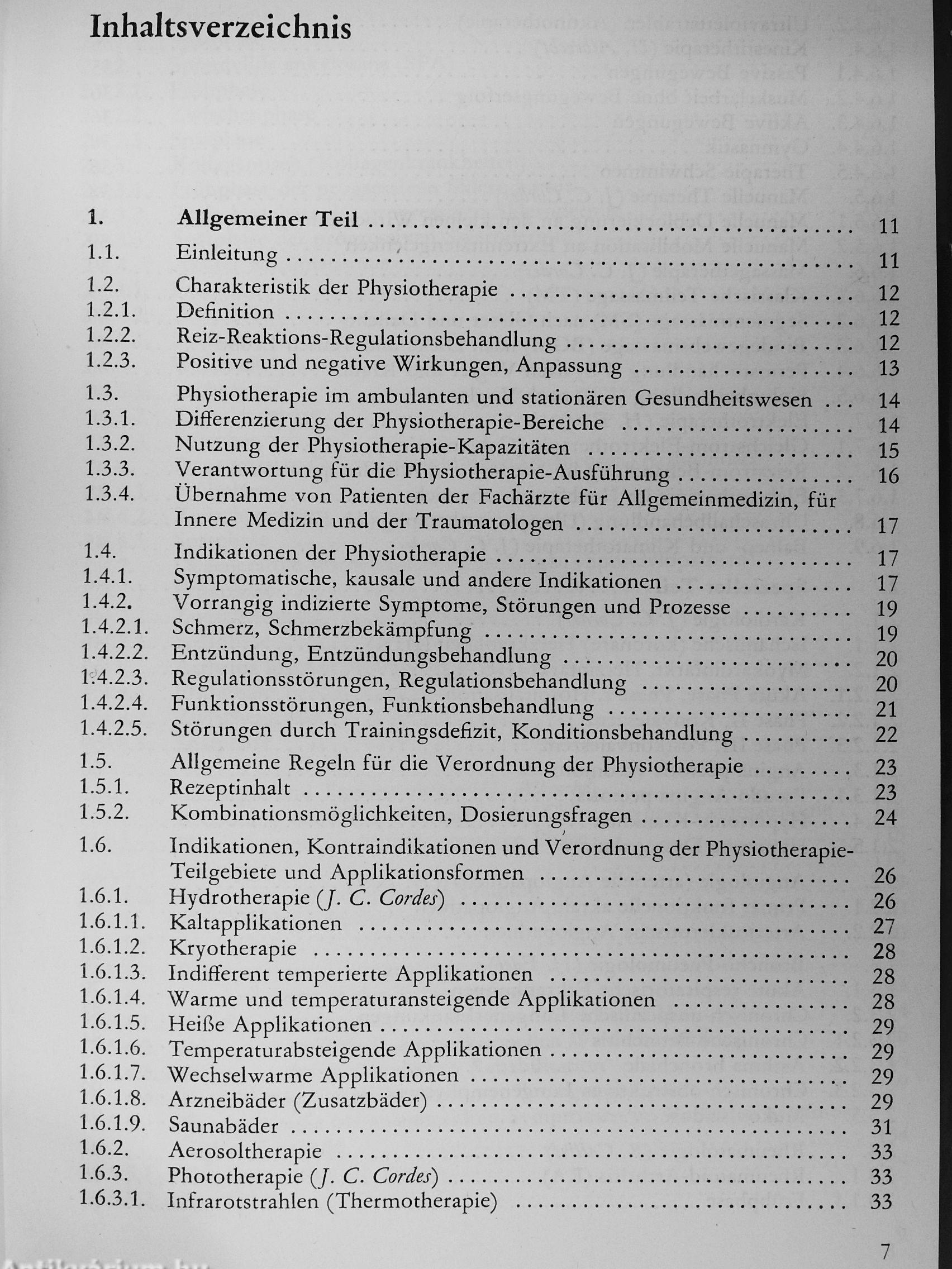 nische Bronchitis, Asthma bronchiale, chronisches obstruktives Lungenemphysem, Mukoviszidose),Rheumatologie (Rheumatoid-Arthritis, Spondylitis ankylosans, Kollagenosen, akuter Rheumatismus, Weichteilrheumatismus, degenerative Gelenkerkrankungen, degenerative Wirbelsäulenerkrankungen, Arthritis urica), prä- und postoperative Physiotherapie, posttraumatische Physiotherapie und Arbeitstherapie. Für die prä- und postoperative Phase werden Trainingsregeln und Übungsprogramme gebracht. Die Physiotherapie in der Traumatologie bezieht sich auf die Kontrakturen, das Ödem, den Schmerz, die Mangeldurchblutung, die Sudeck-Dystrophie. An ausgewählten chirurgischen und traumatologischen Krankheitsbildern werden Prinzipien der Physiotherapie dargelegt: Operationen im Zervikalbereich, am Thorax, am und im Abdomen, an der Hand, Physiotherapiemaßnahmen bei der Verbrennungskrankheit werden erläutert, die Physio- und Arbeitstherapie bei Frakturen an der oberen und unteren Extremität wird dargelegt. Berücksichtigt werden auch andere therapeutische Möglichkeiten in Kombination mit der Physiotherapie.