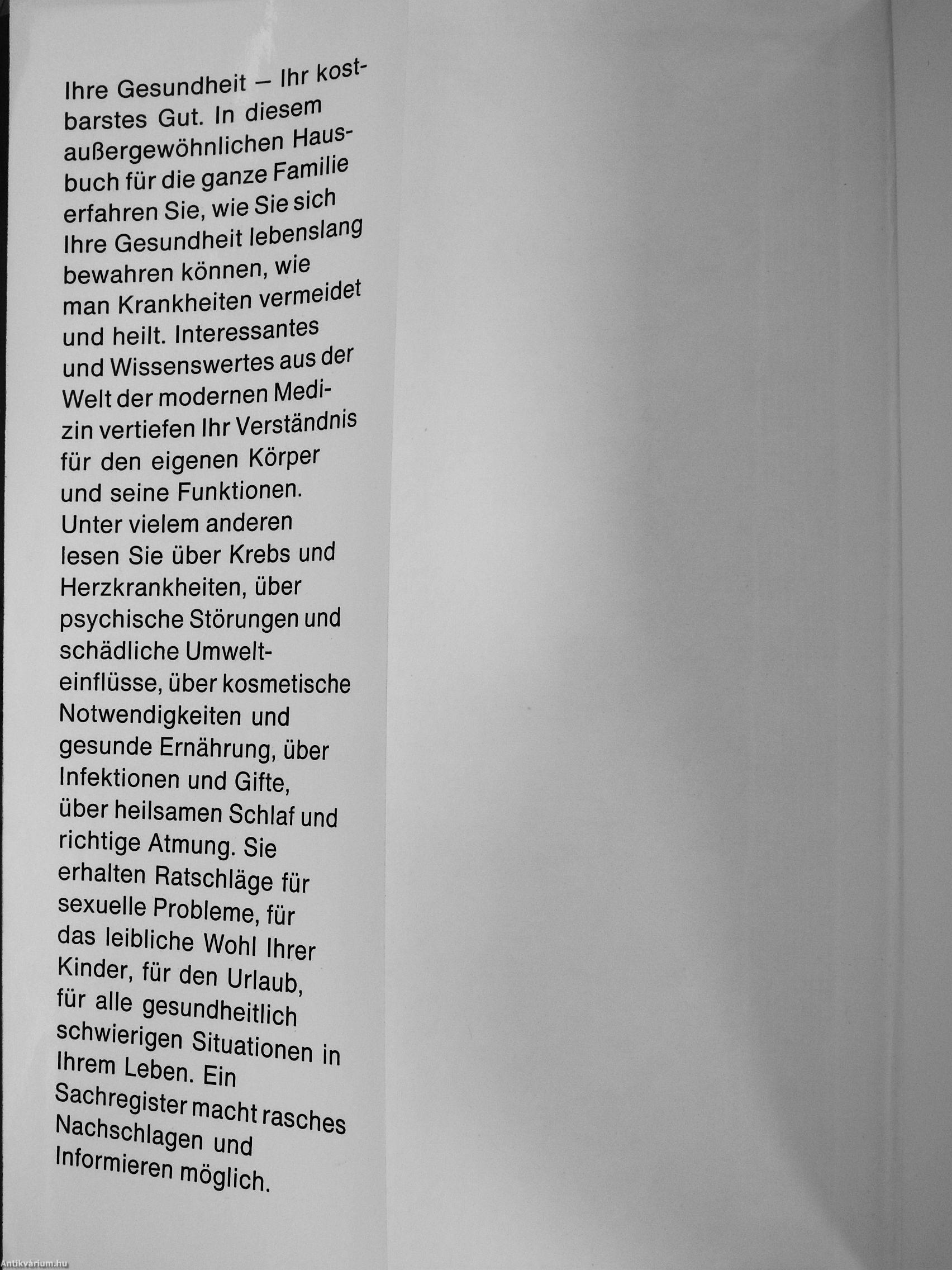 Ihre Gesundheit - Ihr kostbarstes Gut. In diesem außergewöhnlichen Hausbuch für die ganze Familie erfahren Sie, wie Sie sich Ihre Gesundheit lebenslang bewahren können, wie man Krankheiten vermeidet und heilt. Interessantes und Wissenswertes aus der Welt der modernen Medizin vertiefen Ihr Verständnis für den eigenen Körper und seine Funktionen. Unter vielem anderen lesen Sie über Krebs und Herzkrankheiten, über psychische Störungen und schädliche Umwelteinflüsse, über kosmetische Notwendigkeiten und gesunde Ernährung, über Infektionen und Gifte, über heilsamen Schlaf und richtige Atmung. Sie erhalten Ratschläge für sexuelle Probleme, für das leibliche Wohl Ihrer Kinder, für den Urlaub, für alle gesundheitlich schwierigen Situationen in Ihrem Leben. Ein Sachregister macht rasches Nachschlagen und Informieren möglich.