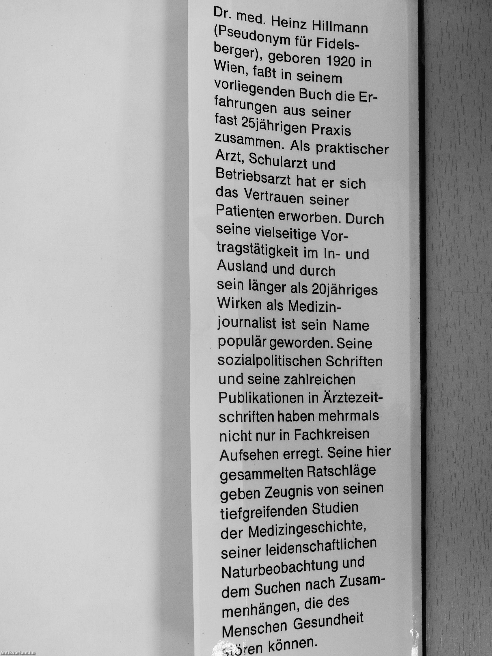 Dr. med. Heinz Hillmann (Pseudonym für Fidels-berger), geboren 1920 in Wien, faßt in seinenn vorliegenden Buch die Erfahrungen aus seiner fast 25jährigen Praxis zusammen. Als praktischer Arzt, Schularzt und Betriebsarzt hat er sich das Vertrauen seiner Patienten erworben. Durch seine vielseitige Vortragstätigkeit im In- und Ausland und durch sein länger als 20jähriges Wirken als Medizinjournalist ist sein Name populär geworden. Seine sozialpolitischen Schriften und seine zahlreichen Publikationen In Ärztezeitschriften haben mehrmals nicht nur in Fachkreisen Aufsehen erregt. Seine hier gesammelten Ratschläge geben Zeugnis von seinen tiefgreifenden Studien der Medizingeschichte, seiner leidenschaftlichen Naturbeobachtung und dem Suchen nach Zusammenhängen, die des Menschen Gesundheit í,^ören können.