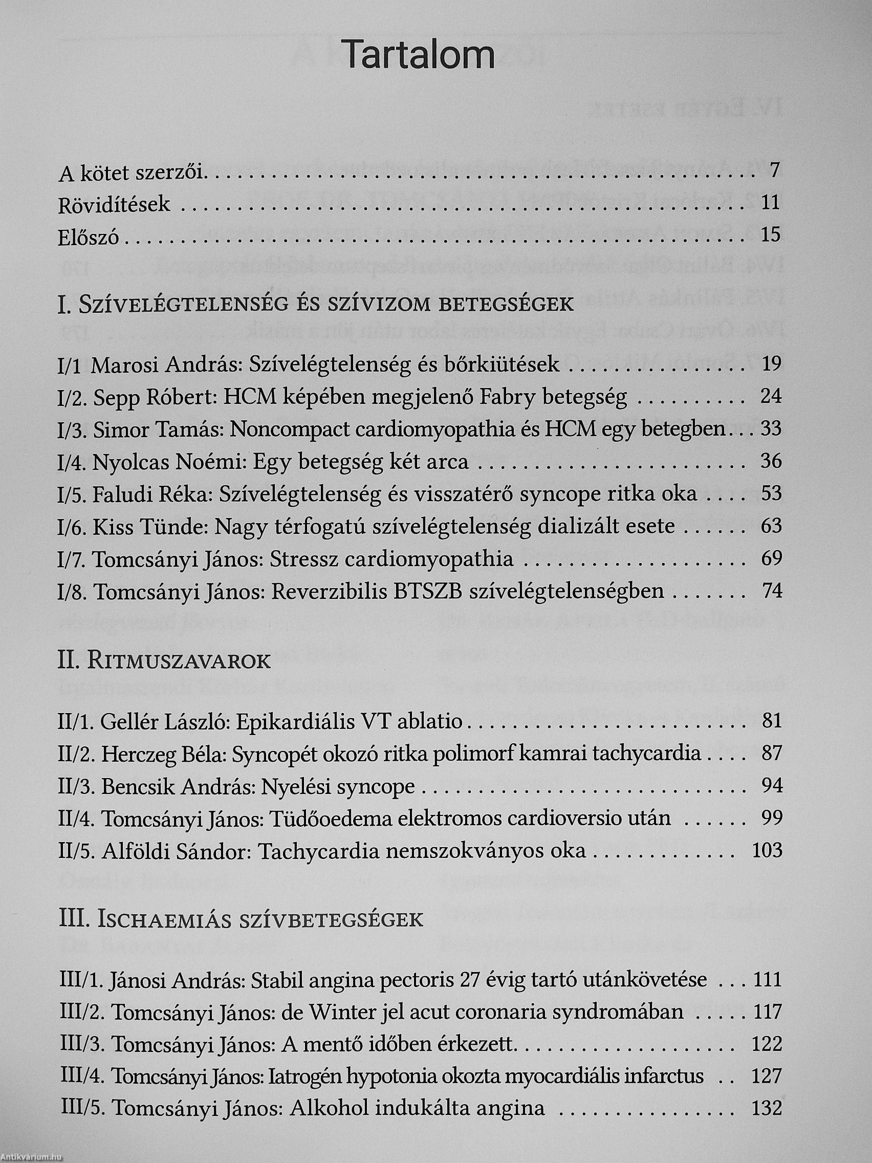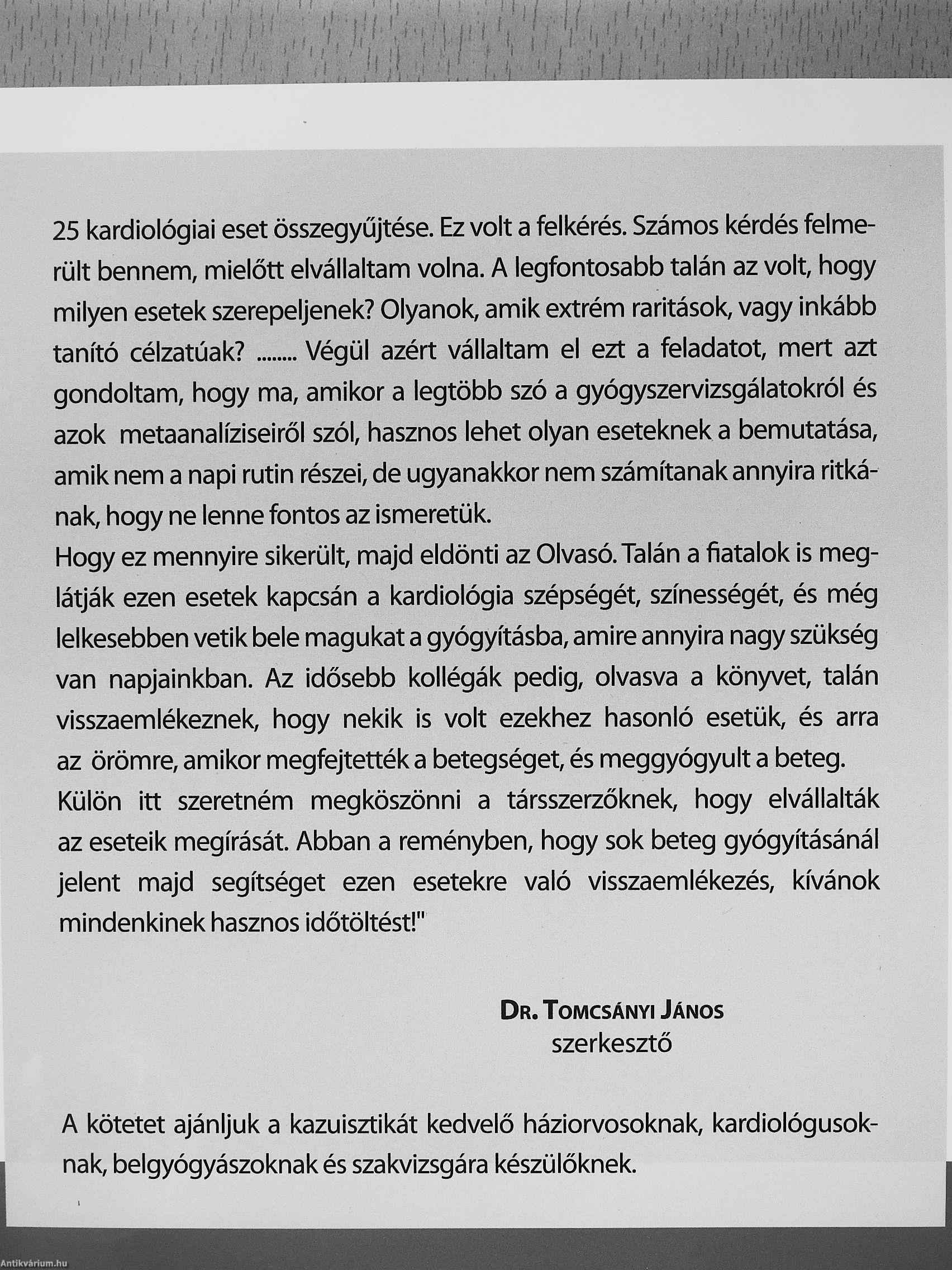 Hogy ez mennyire sikerült, majd eldönti az Olvasó. Talán a fiatalok is meglátják ezen esetek kapcsán a kardiológia szépségét, színességét, és még lelkesebben vetik bele magukat a gyógyításba, amire annyira nagy szükség van napjainkban. Az idősebb kollégák pedig, olvasva a könyvet, talán visszaemlékeznek, hogy nekik is volt ezekhez hasonló esetük, és arra az örömre, amikor megfejtették a betegséget, és meggyógyult a beteg. Külön itt szeretném megköszönni a társszerzőknek, hogy elvállalták az eseteik megírását. Abban a reményben, hogy sok beteg gyógyításánál jelent majd segítséget ezen esetekre való visszaemlékezés, kívánok mindenkinek hasznos időtöltést!"