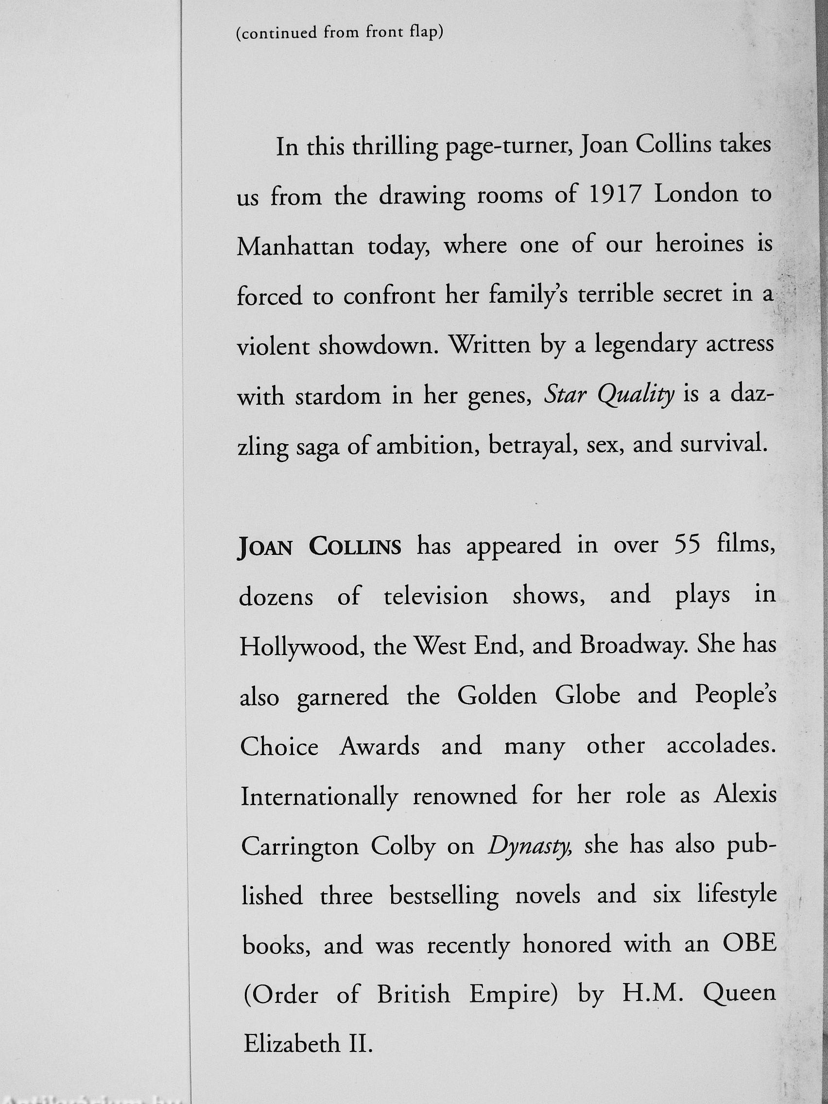 In this thriUing page-turner, Joan Collins takes us from the drawing rooms of 1917 London to Manhattan today, where one of our heroines is forced to confront her family's terrible secret in a violent showdown. Written by a legendary actress with stardom in her genes. Star Quality is a dazzling saga of ambition, betrayal, sex, and survival.