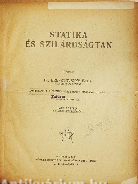 | Megjegyzés: | Fekete-fehér ábrákkal. Kézirat Dr. Bresztovszky Béla műegyetemi ny. r. tanár "Mechanika I. füzet" cimen tartott előadásai nyomdán. Összeállitotta: Imre László okleveles gépészmérnök. |