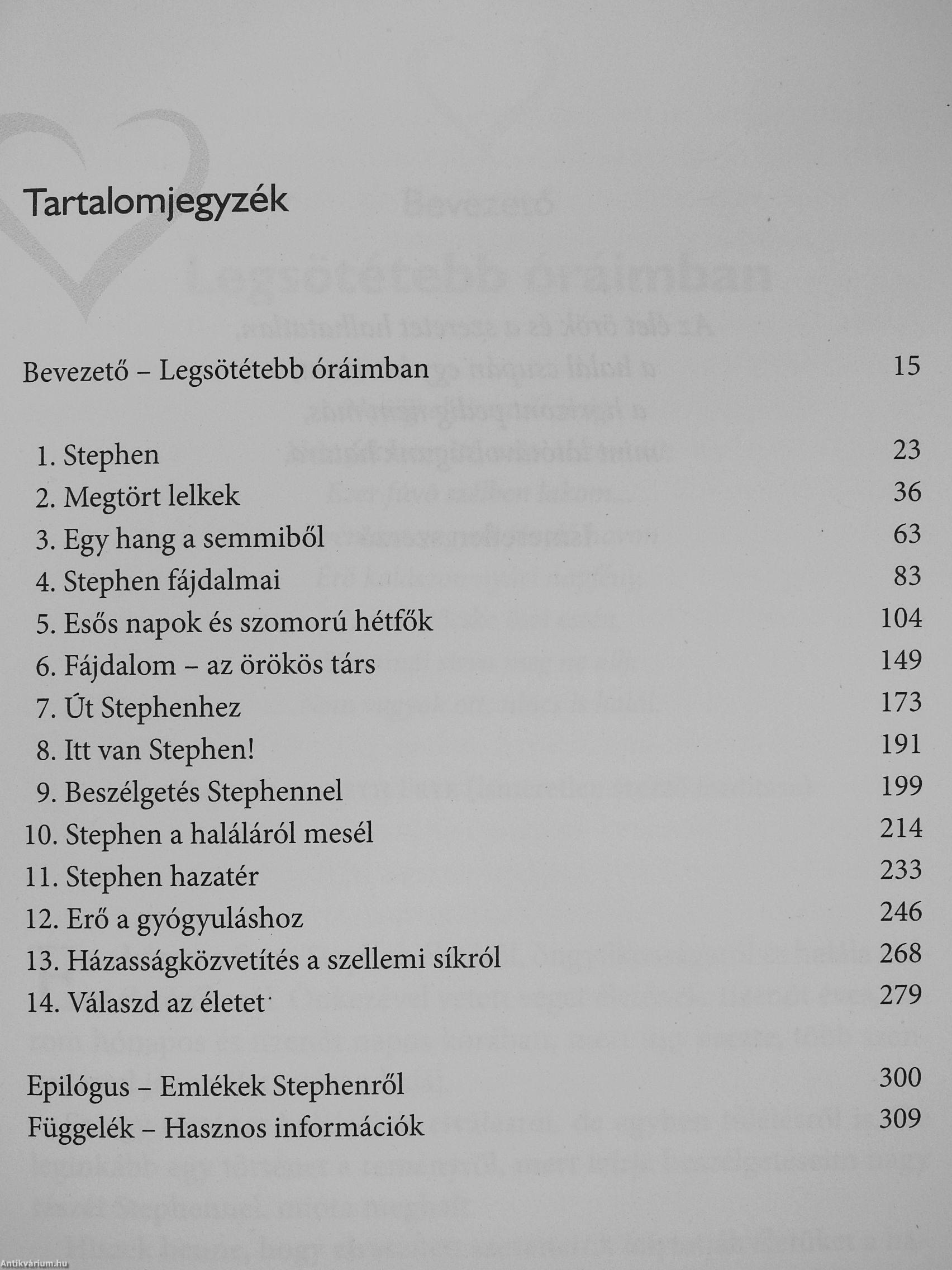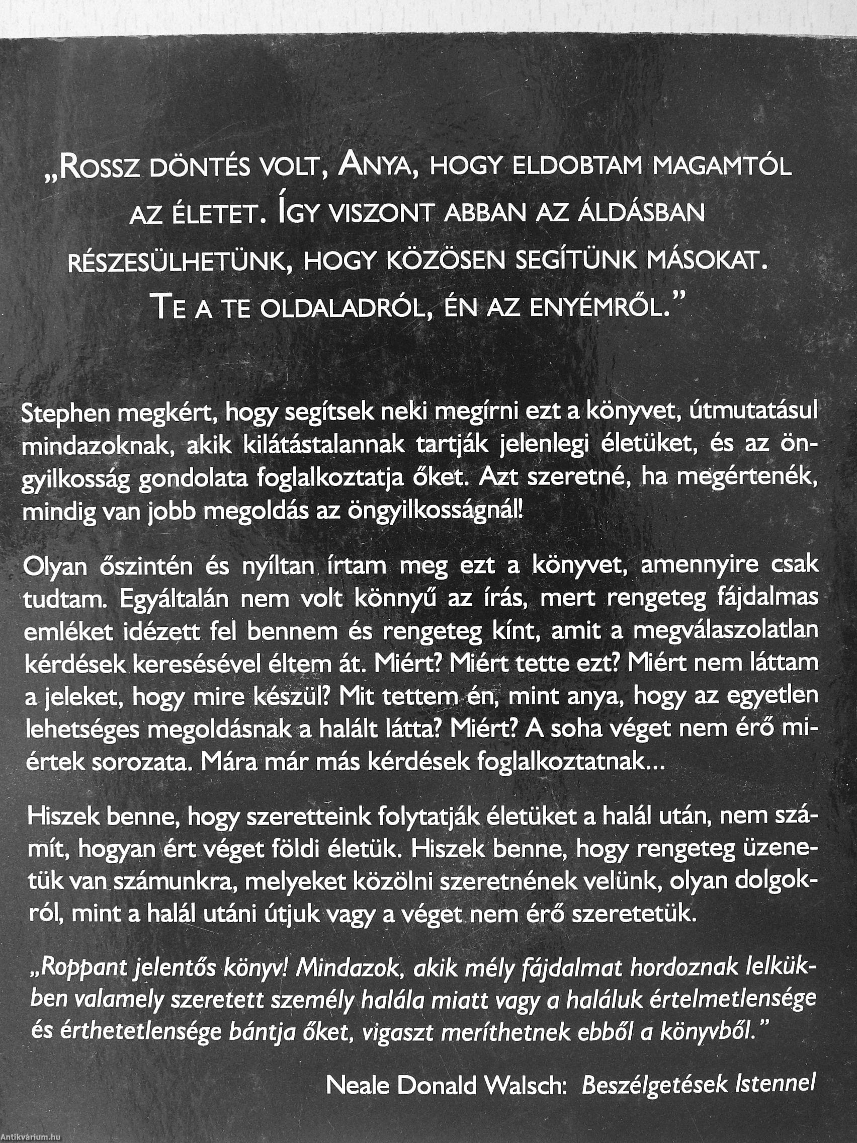 Stephen megkért, hogy segítsek neki megírni ezt a könyvet, útmutatásul mindazoknak, akik kilátástalannak tartják jelenlegi életüket, és az öngyilkosság gondolata foglalkoztatja őket. Azt szeretné, ha megértenék, mindig van jobb megoldás az öngyilkosságnál!
