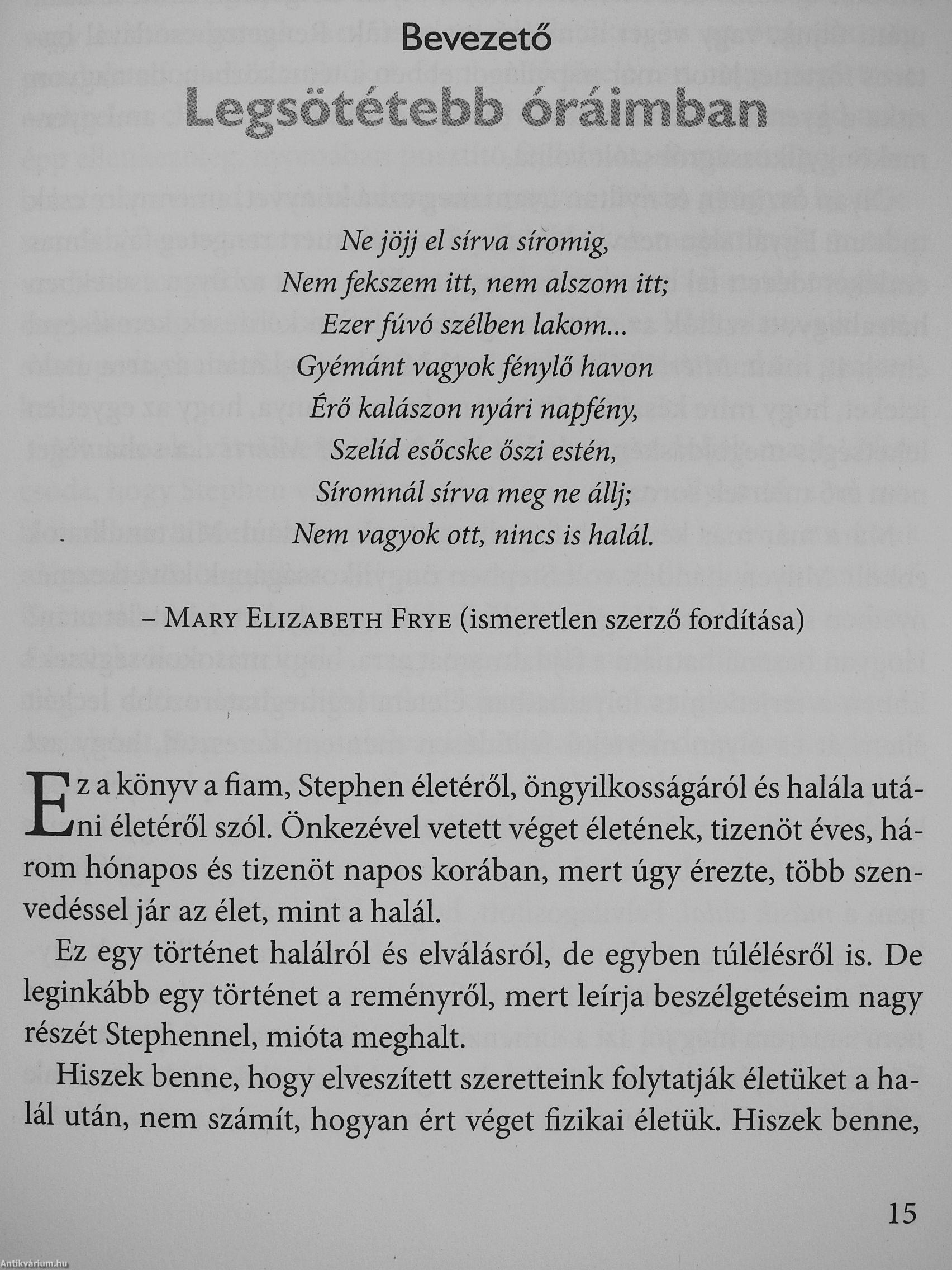 Olyan őszintén és nyíltan írtam meg ezt a könyvet, amennyire csak tudtam. Egyáltalán nem volt könnyű az írás, mert rengeteg fájdalmas emléket idézett fel bennem és rengeteg kínt, amit a megválaszolatlan kérdések keresésével éltem át. Miért? Miiért tette ezt? Miért nem láttam a jeleket, hogy mire készül? Mit tettem én, mint anya, hogy az egyeden lehetséges megoldásnak a halált látta? Miért? A soha véget nem érő miértek sorozata. Mára már más kérdések foglalkoztatnak