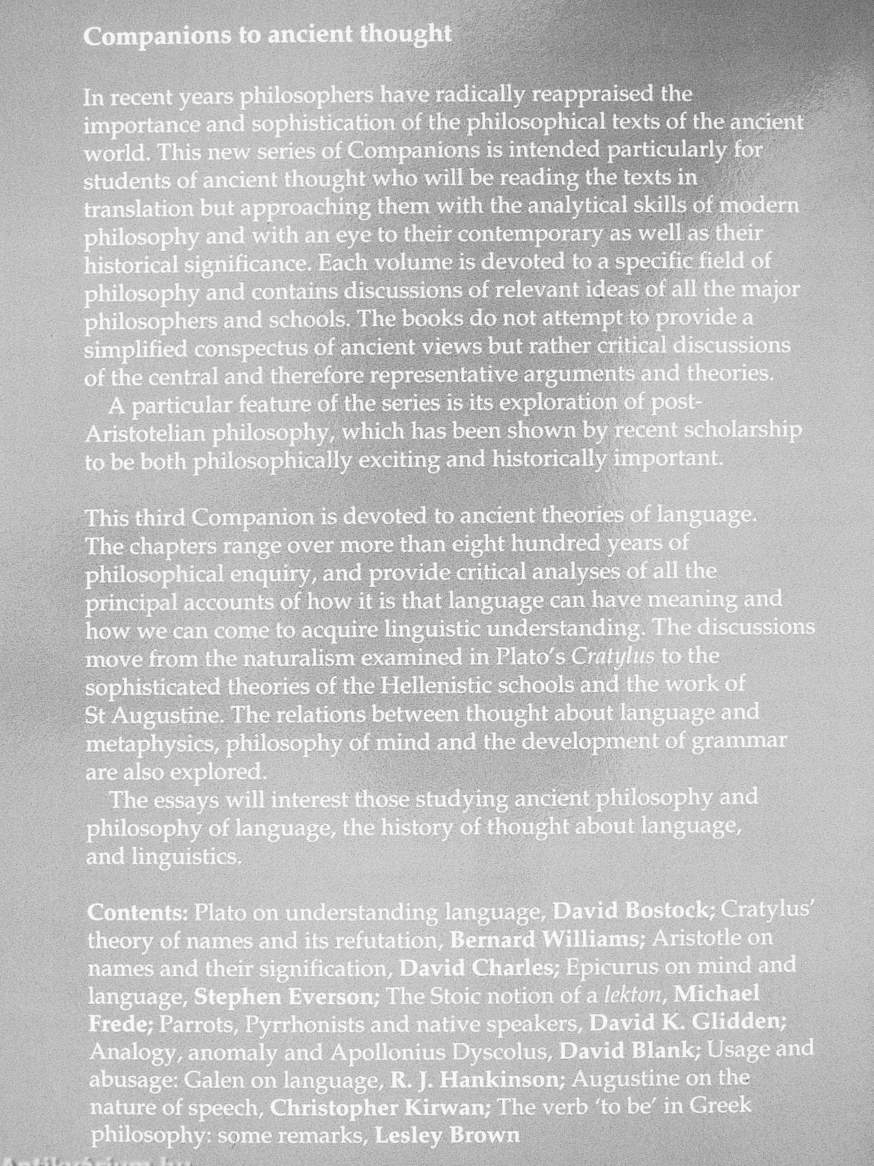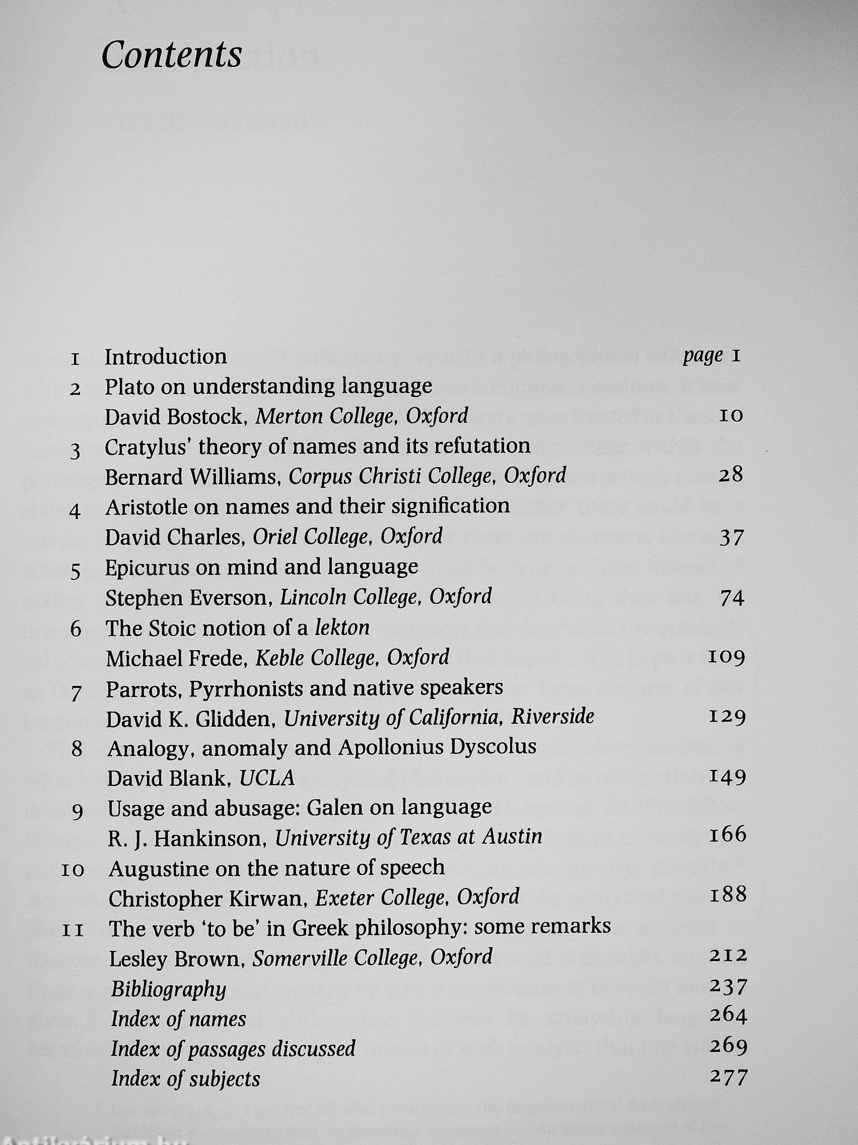 Contents: Plato on understanding language, David Bostock; Cratylus' theory of names and its refutation, Bernard Williams; Aristotle on names and their signification, David Charles; Epicurus on mind and language, Stephen Everson; The Stoic notion of a lekton, Michael Frede; Parrots, Pyrrhonists and native speakers, David K. Glidden; Analogy, anomaly and Apollonius Dyscolus, David Blank; Usage and abusage: Galen on language, R. J. Hankinson; Augustine on the nature of speech, Christopher Kirwan; The verb 'to be' in Greek philosophy: some remarks, Lesley Brown Vissza