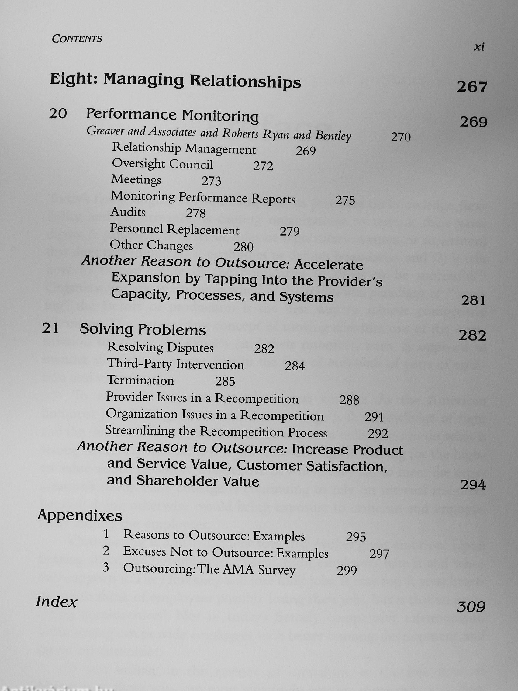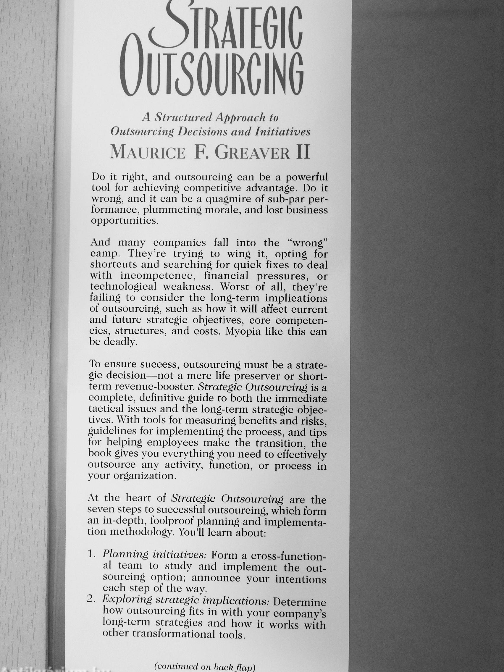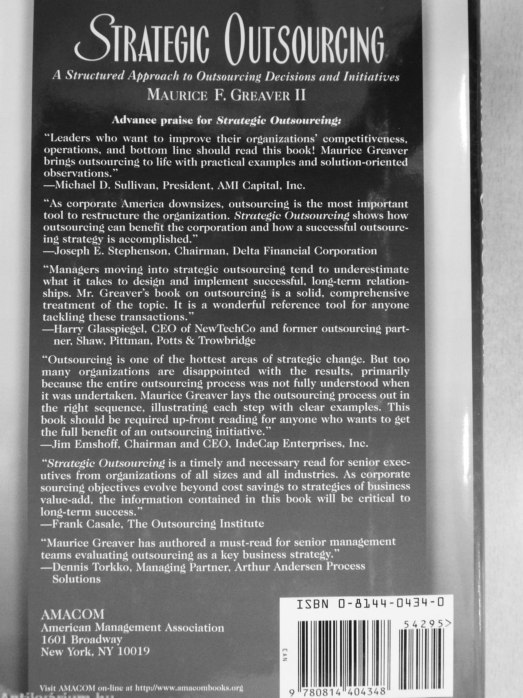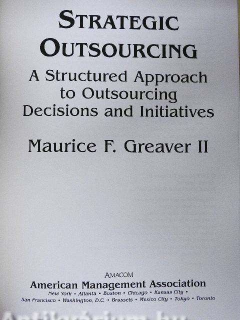 "Outsourcing is one of the hottest areas of strategic change. But too many organizations are disappointed with the results, primarily because the entire outsourcing process was not fully understood when it was undertaken. Maurice Greaver lays the outsourcing process out in the right sequence, illustrating each step with clear examples. This book should be required up-front reading for anyone who wants to get the full benefit of an outsourcing initiative." —^Jim Emshoff, Chairman and CEO, IndeCap Enterprises, Inc.