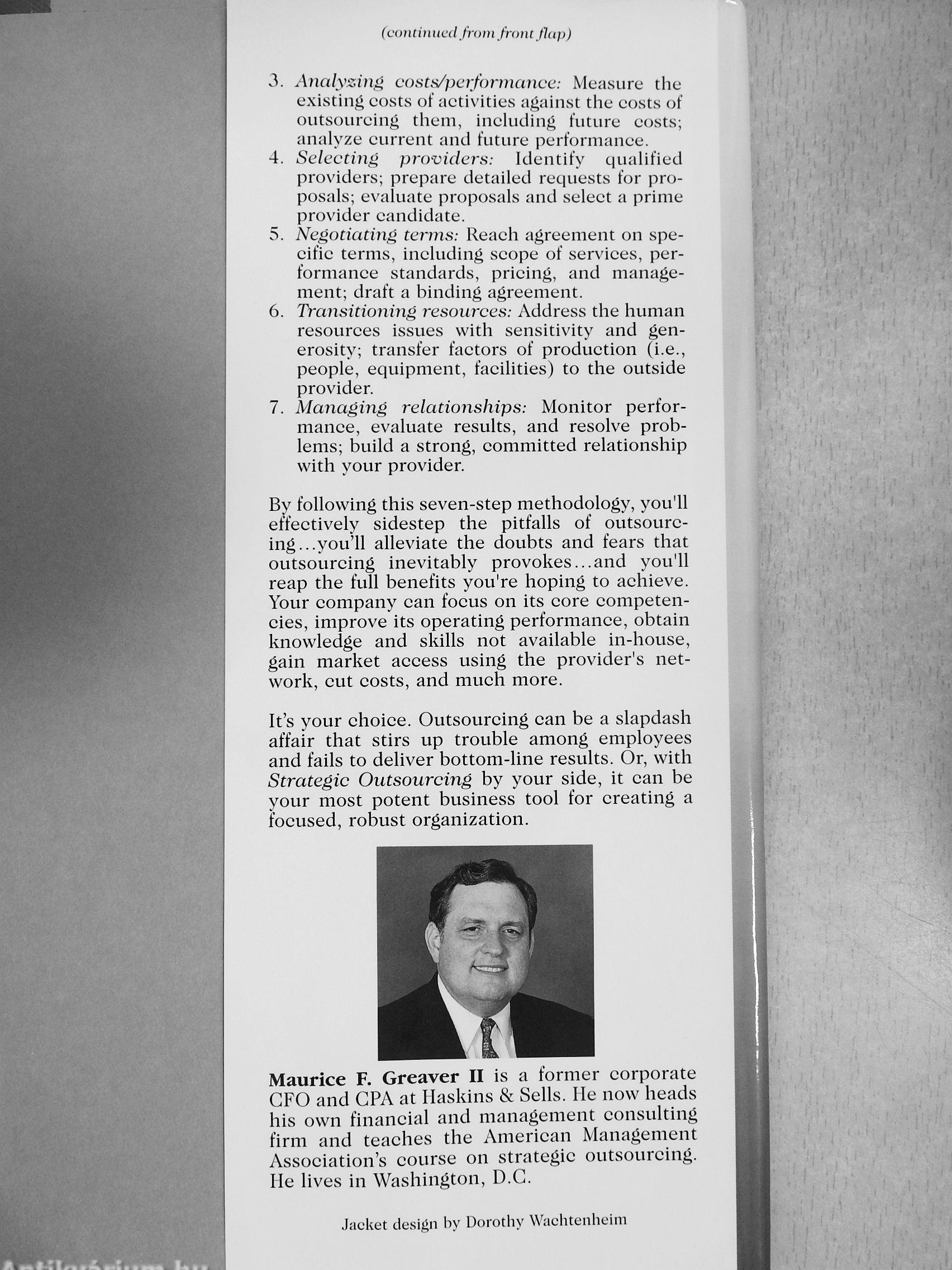 Maurice F. Greaver II is a former corporate GFO and CPA at Ilaskins & Sells. He now heads his own financial and management consulting firm and teaches the American Management Association's course on strategic outsourcing. He lives in Washington, D.G.