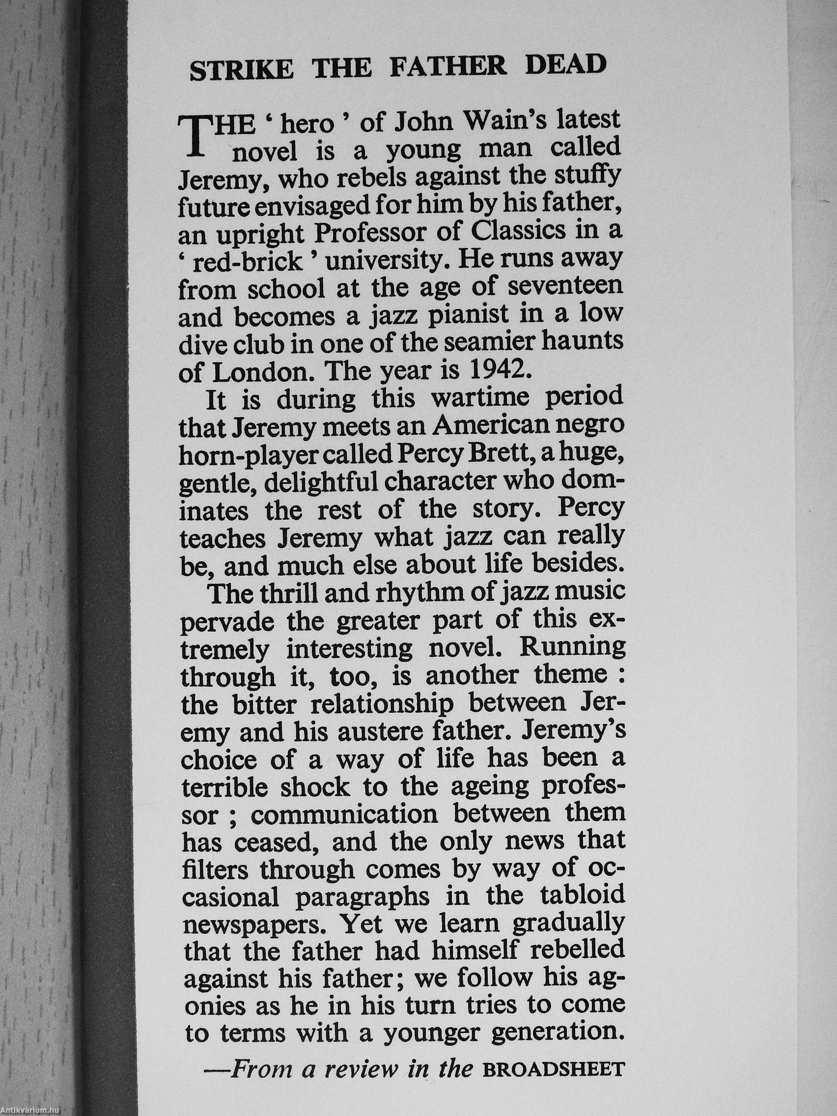 The thrill and rhythm of jazz music pervade the greater part of this extremely interesting novel. Running through it, too, is another theme : the bitter relationship between Jeremy and his austere father. Jeremy's choice of a way of life has been a terrible shock to the ageing professor ; communication between them has ceased, and the only news that filters through comes by way of occasional paragraphs in the tabloid newspapers. Yet we learn gradually that the father had himself rebelled against his father; we follow his agonies as he in his turn tries to come to terms with a younger generation.