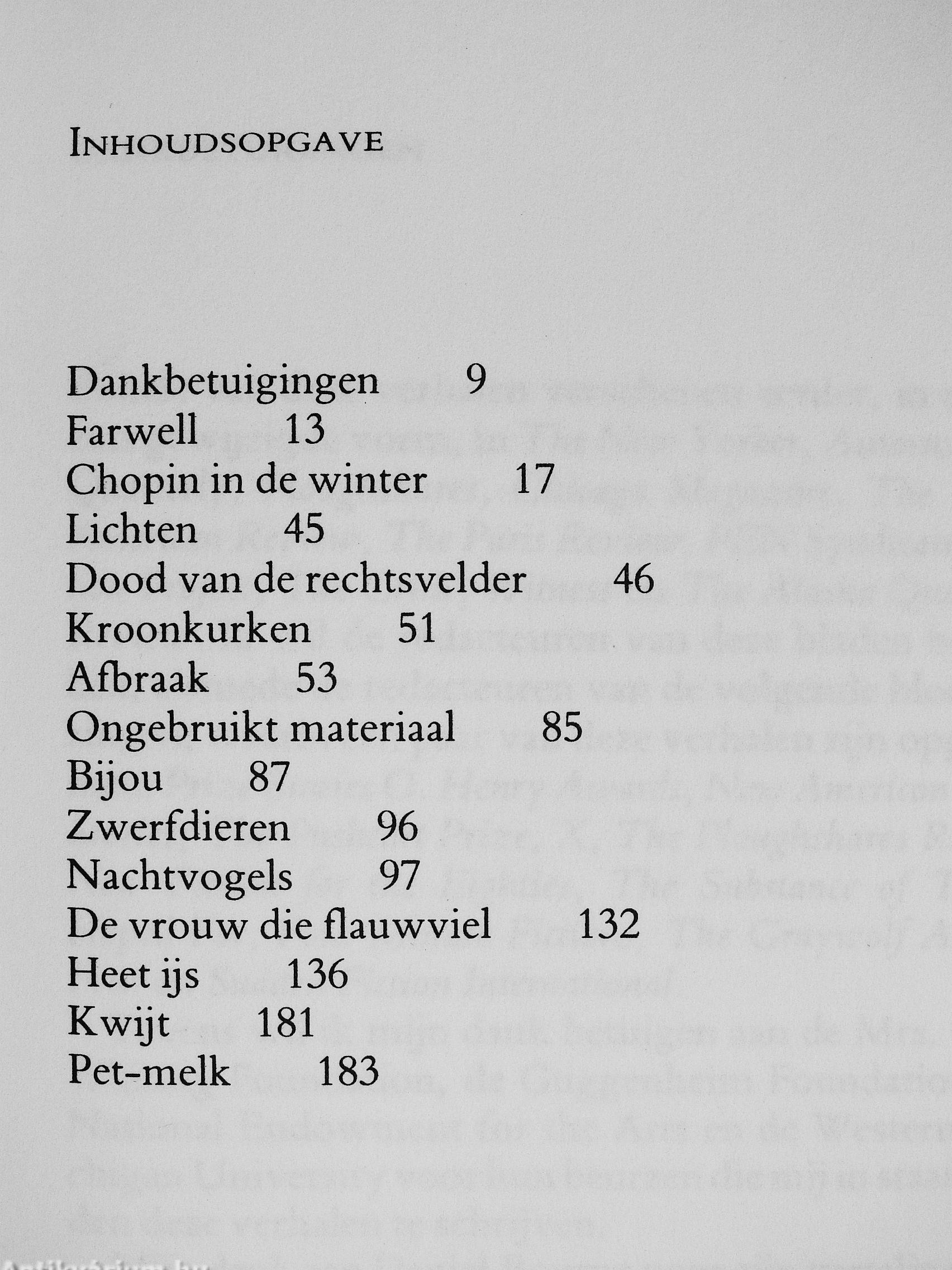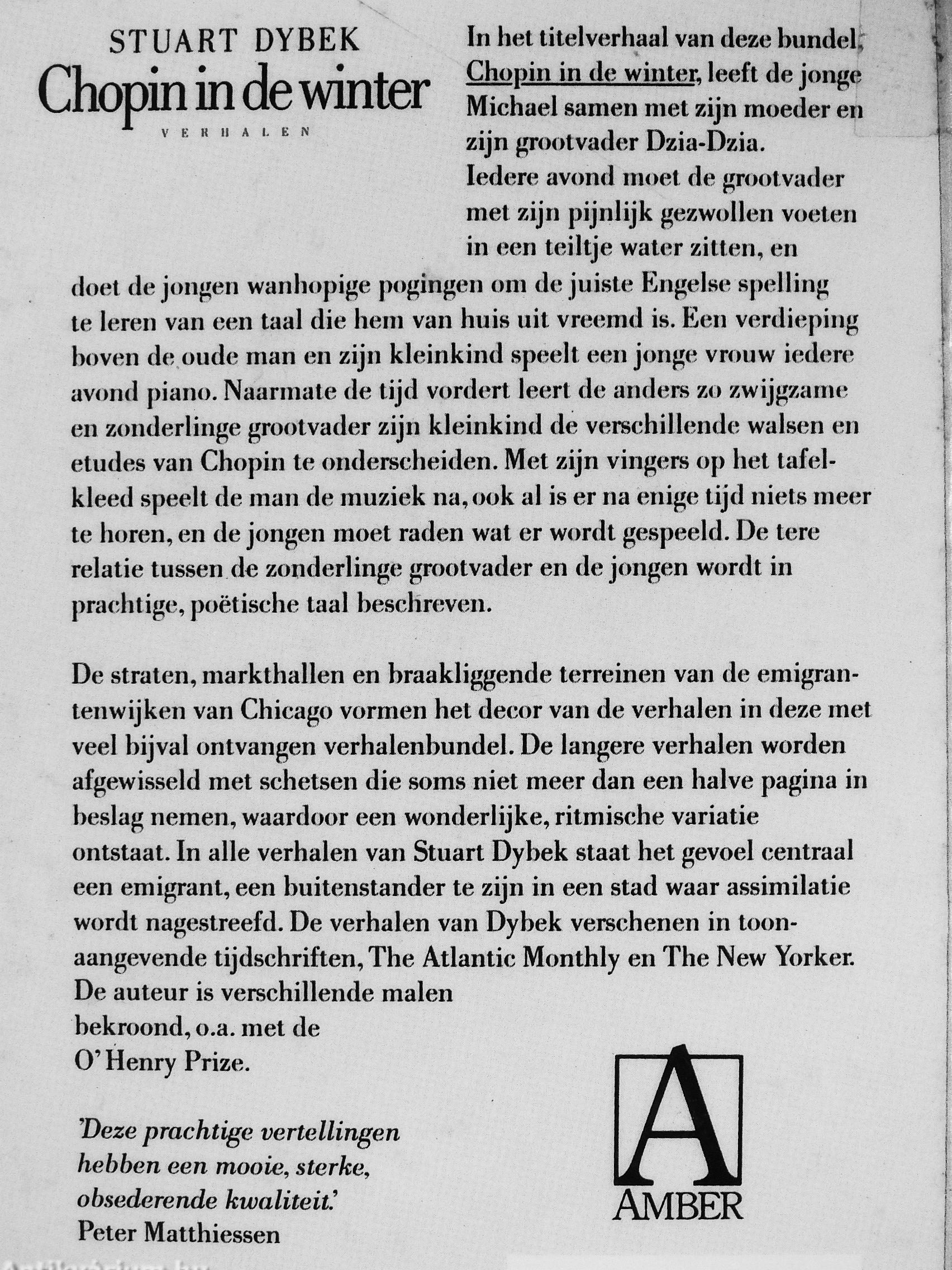 De Straten, marklhallen en braakliggende lerreinen van de emigran-lenwijken van Chicago vormen hei decor van de verbalen in deze met veel bijval onlvangen verhalenbundel. De längere verbalen worden afgewisseld mel schetsen die soms niet meer dan een halve pagina in beslag nemen, waardoor een wonderlijke, rilmisehe variatie ontslaal. In alle verbalen van Sluarl Dybek slaal het gevoel cenlraal een emigranl, een builenslander te zijn in een slad waar assimilalie wordl nageslreefd. De verbalen van Dybek versehenen in toon-aangevende lijdschriflen, The Allanlic Monthly en The New Yorker. De auteur is verschillende malen bekroond, o.a. met de 0'Henry Prize.
