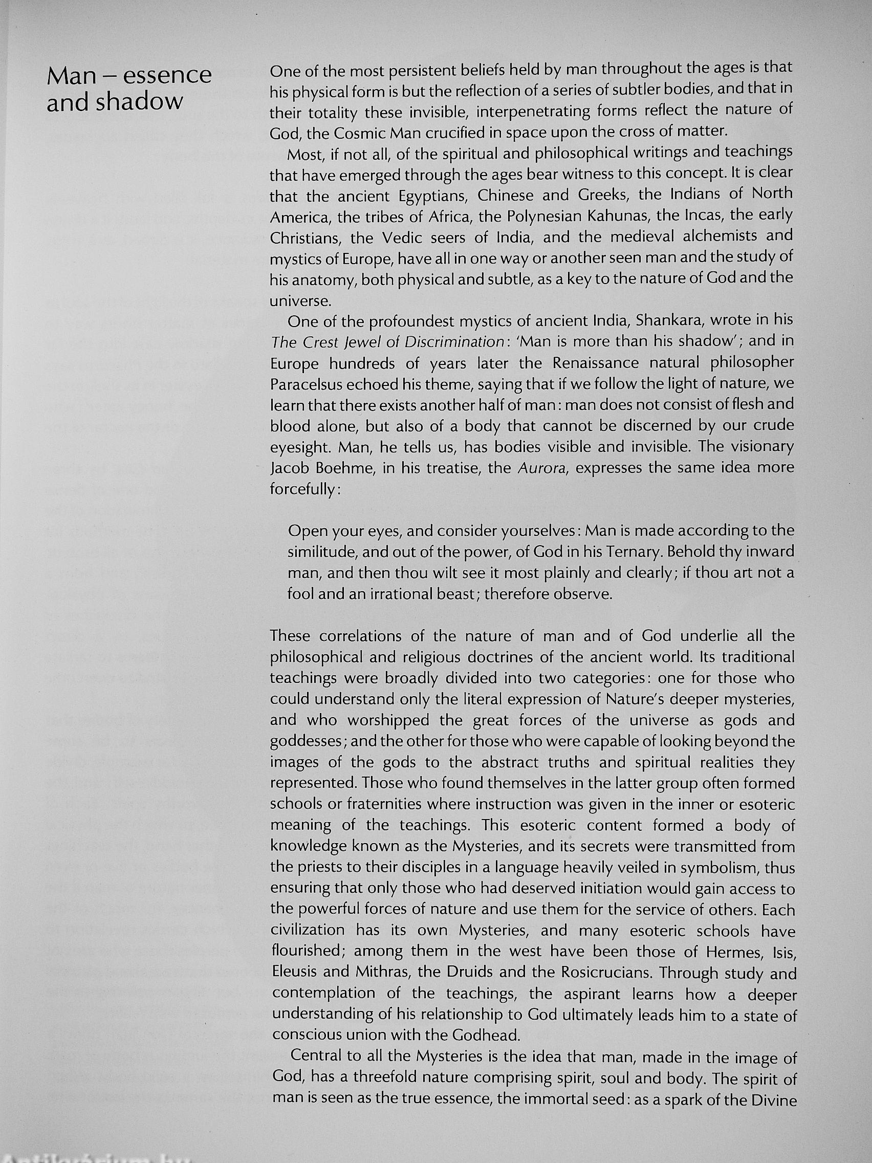 Throughout time man has held the belief that the physical form is a projected image and reflection of his subtle anatomy. The priests and teachers of past traditions and civilizations have taught that man in his totality is a key that will unlock the hidden mysteries of God and the universe. Knowledge of Self, revealed through the disciplines of prayer and meditation, brings with it the power to create, the power to direct and control the forces of nature, guiding them through the channels of the subtle bodies for purposes of self-realization, self-expression and healing. Thus man becomes a conscious co-creator of the universe, a server of the race and an expression of God incarnate.