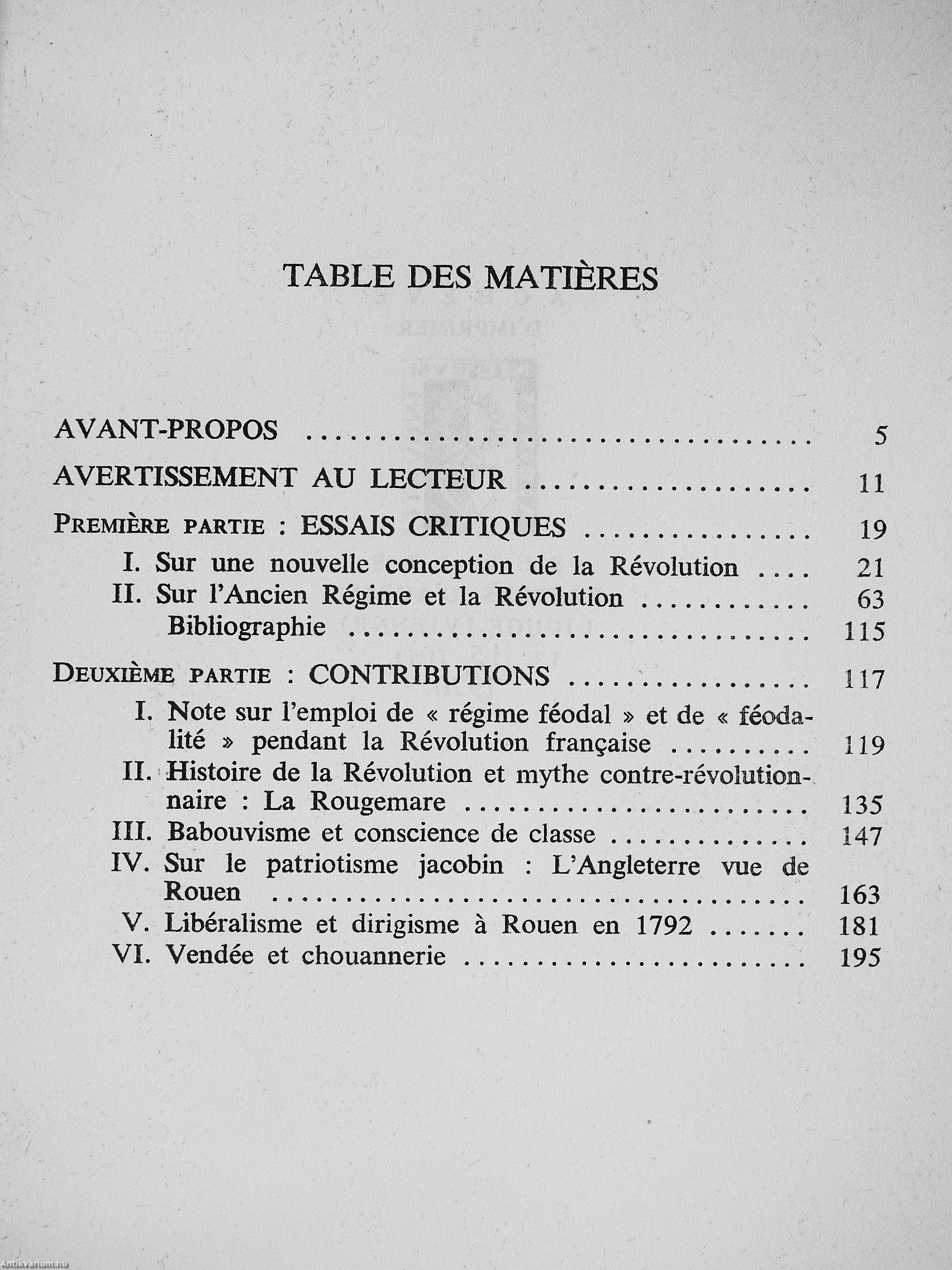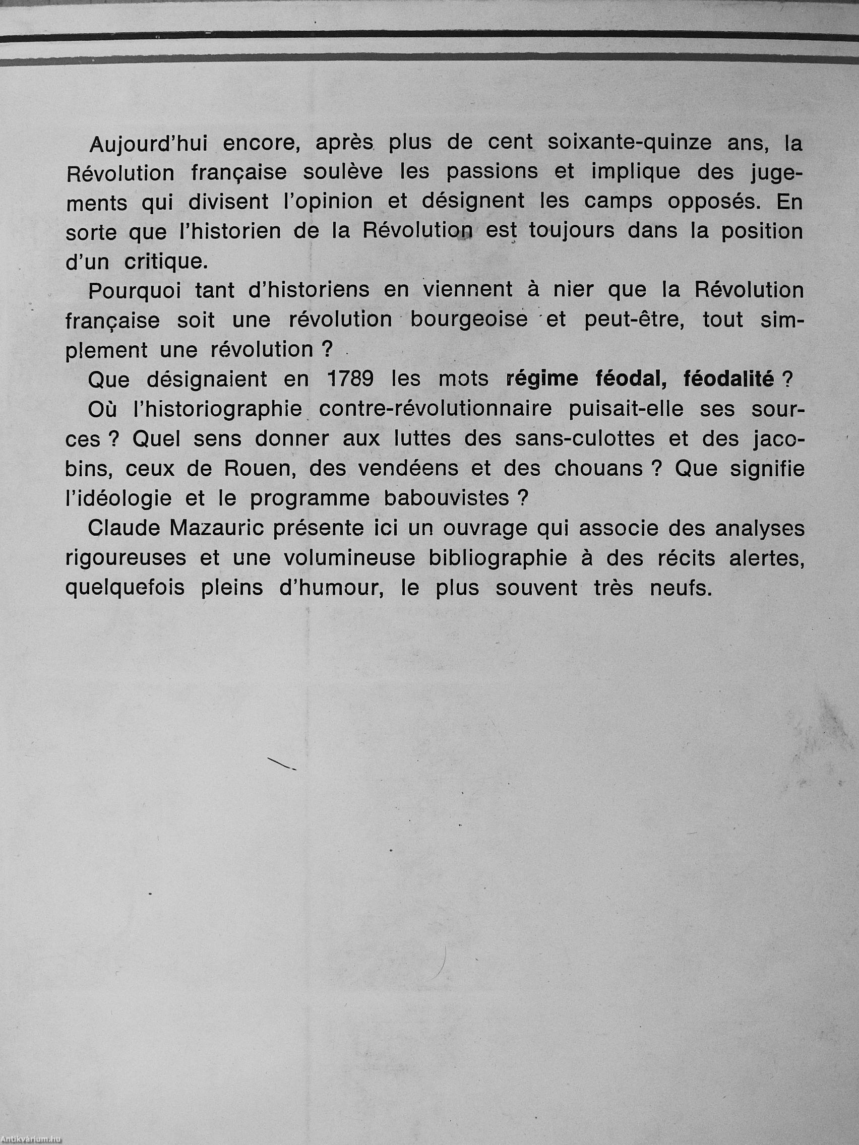 Ou l'historiographie contre-révolutionnaire puisait-elle ses sources ? Que! sens donner aux luttes des sans-culottes et des jacobins, ceux de Rouen, des vendéens et des chouans ? Que signifie l'idéologie et le programme babouvistes ?