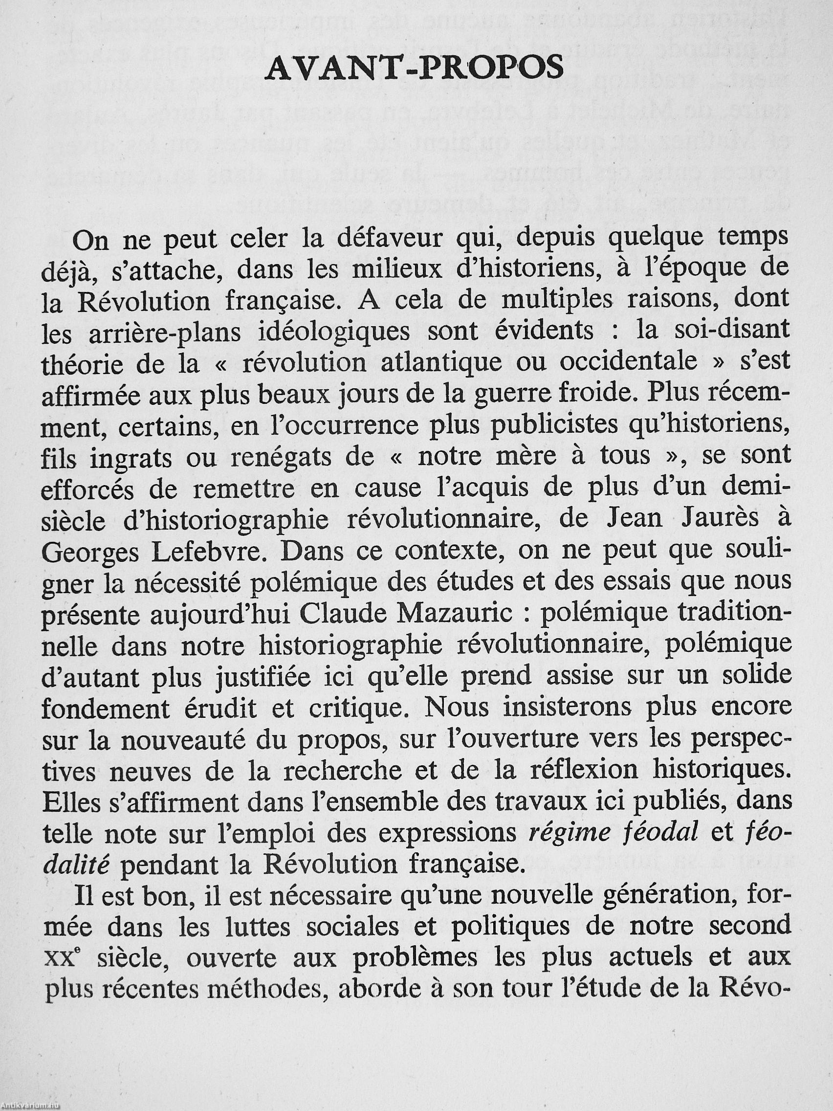 Aujourd'hui encore, apres plus de cent soixante-quinze ans, la Révolution française souleve les passions et implique des jugements qui divisent l'opinion et désignent les camps opposés. En sorte que l'historien de la Révolution est toujours dans la position d'un critique.
