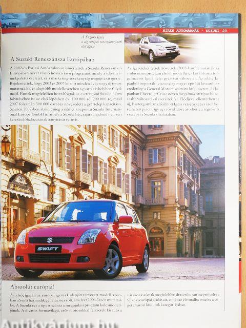 A Híres Autómárkák sorozat első kötetéből a Suzuki múltja, jelene és jövője tárul fel. Az egyik legismertebb japán autógyár története felöleli az egész XX. századot: a szerény szövőszékeket előállító vállalkozásból mára a világ egyik legnagyobb gépjárműgyártó cégcsoportja lett. A jól ismert modellek, az Ignis, a Swift és a Wagon R+ mellett az Alto, a Jimny, a Grand Vitara és olyan különlegességek, mint a Cervo vagy a Fronté 800 részletes bemutatásán kívül a Suzuki kínai, indiai, amerikai és természetesen magyarországi szereplése sem hiányzik. Vissza