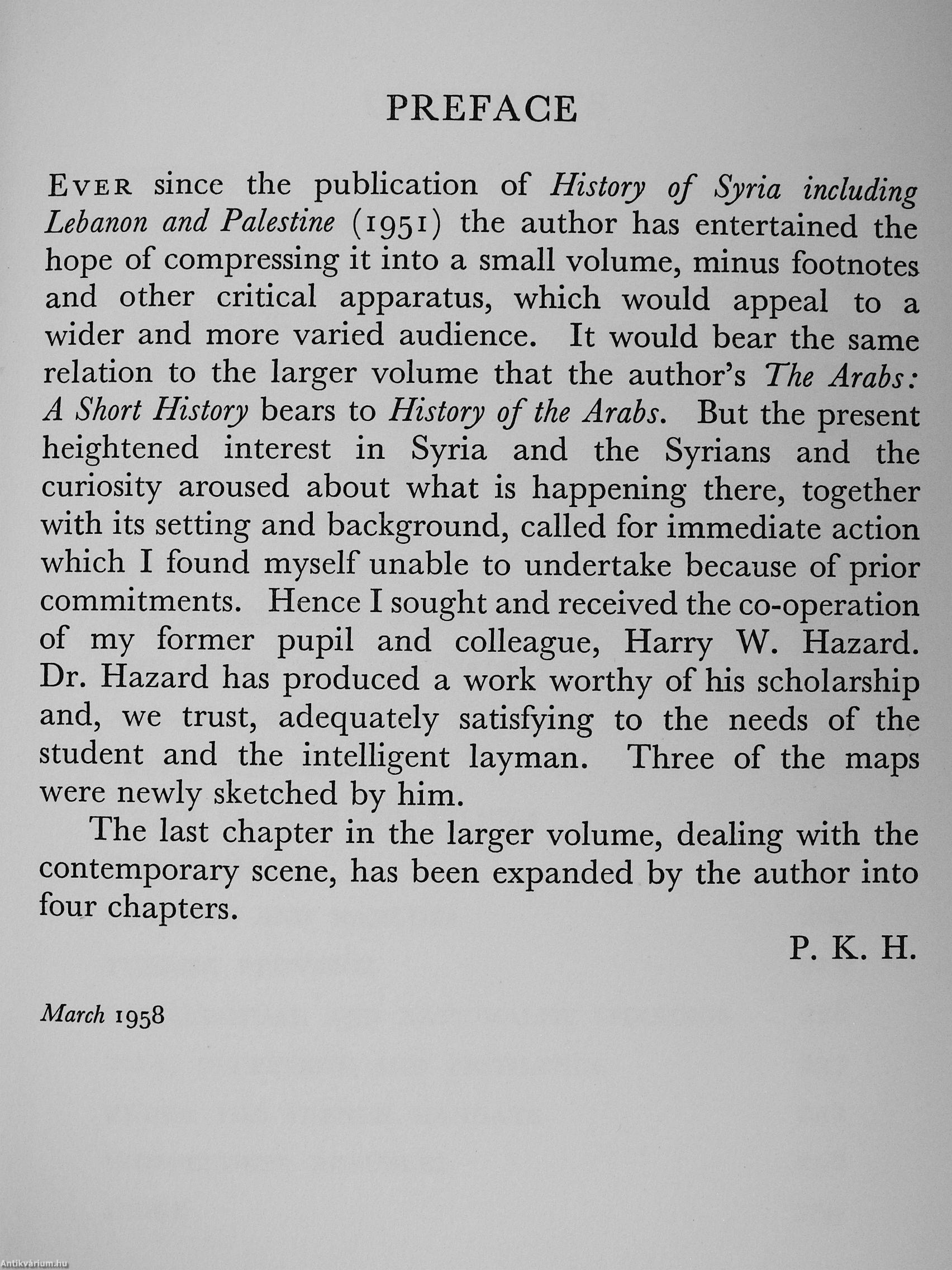 This authoritative book is an abridgement of Professor Hitti's History of Syria, which is now in its second edition. It is intended not so much for the scholar as for the general reader who needs the background knowledge for understanding the issues imder debate today.