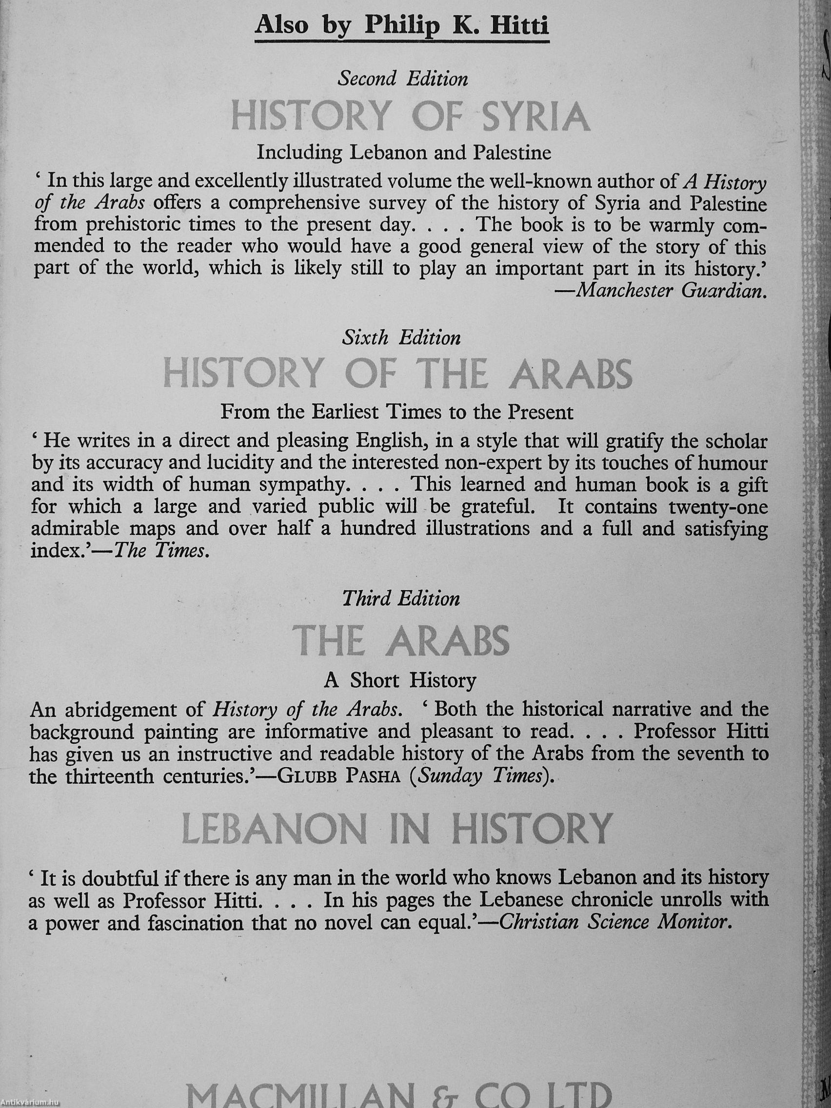 ' It is doubtful if there is any man in the world who knows Lebanon and its history as well as Professor Hitti. In his pages the Lebanese chronicle unrolls with a power and fascination that no novel can equal.'—Christian Science Monitor.