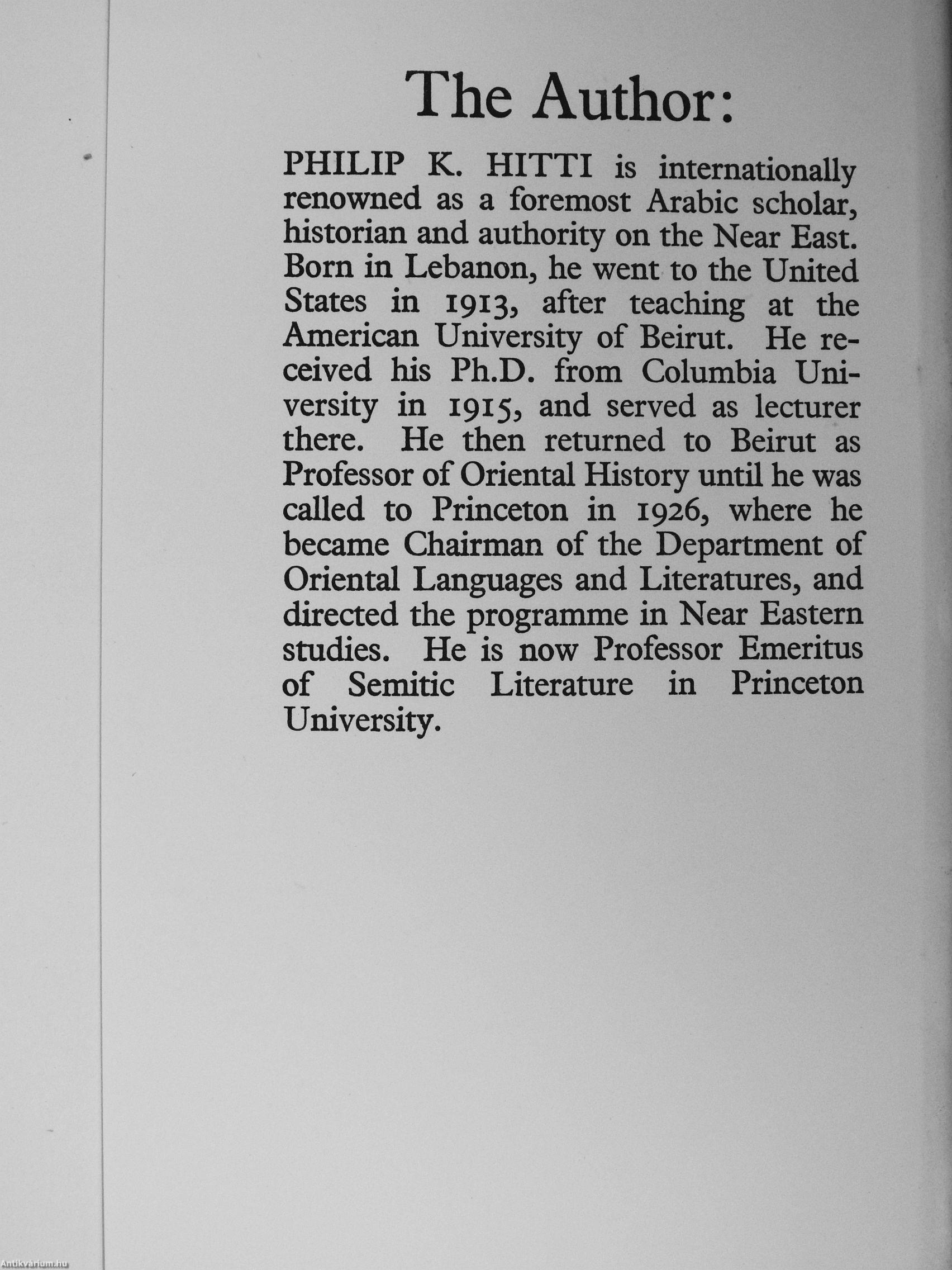 PHILIP K. HITTI is internationaUy renowned as a foremost Arabic scholar, historian and authority on the Near East. Born in Lebanon, he went to the United States in 1913, after teaching at the American University of Beirut. He received his Ph.D. from Columbia University in 1915, and served as lecturer there. He then returned to Beirut as Professor of Oriental History until he was called to Princeton in 1926, where he became Chairman of the Department of Oriental Languages and Literatures, and directed the programme in Near Eastern studies. He is now Professor Emeritus of Semitic Literature in Princeton University.