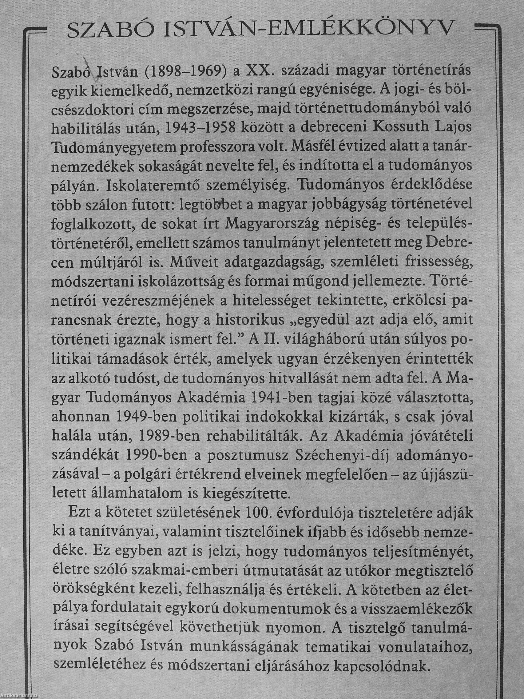 Szabö István (1898-1969) a XX. századi magyar történetírás egyik kiemelkedő, nemzetközi rangú egyénisége. A jogi- és bölcsészdoktori cím megszerzése, majd történettudományból való habilitálás után, 1943-1958 között a debreceni Kossuth Lajos Tudományegyetem professzora volt. Másfél évtized alatt a tanárnemzedékek sokaságát nevelte fel, és indította el a tudományos pályán. Iskolateremtő személyiség. Tudományos érdeklődése több szálon futott: legtöbbet a magyar jobbágyság történetével foglalkozott, de sokat írt Magyarország népiség- és településtörténetéről, emellett számos tanulmányt jelentetett meg Debrecen múltjáról is. Műveit adatgazdagság, szemléleti frissesség, módszertani iskolázottság és formai műgond jellemezte. Történetírói vezéreszméjének a hitelességet tekintette, erkölcsi parancsnak érezte, hogy a historikus „egyedül azt adja elő, amit történeti igaznak ismert fel." AII. világháború után súlyos politikai támadások érték, amelyek ugyan...