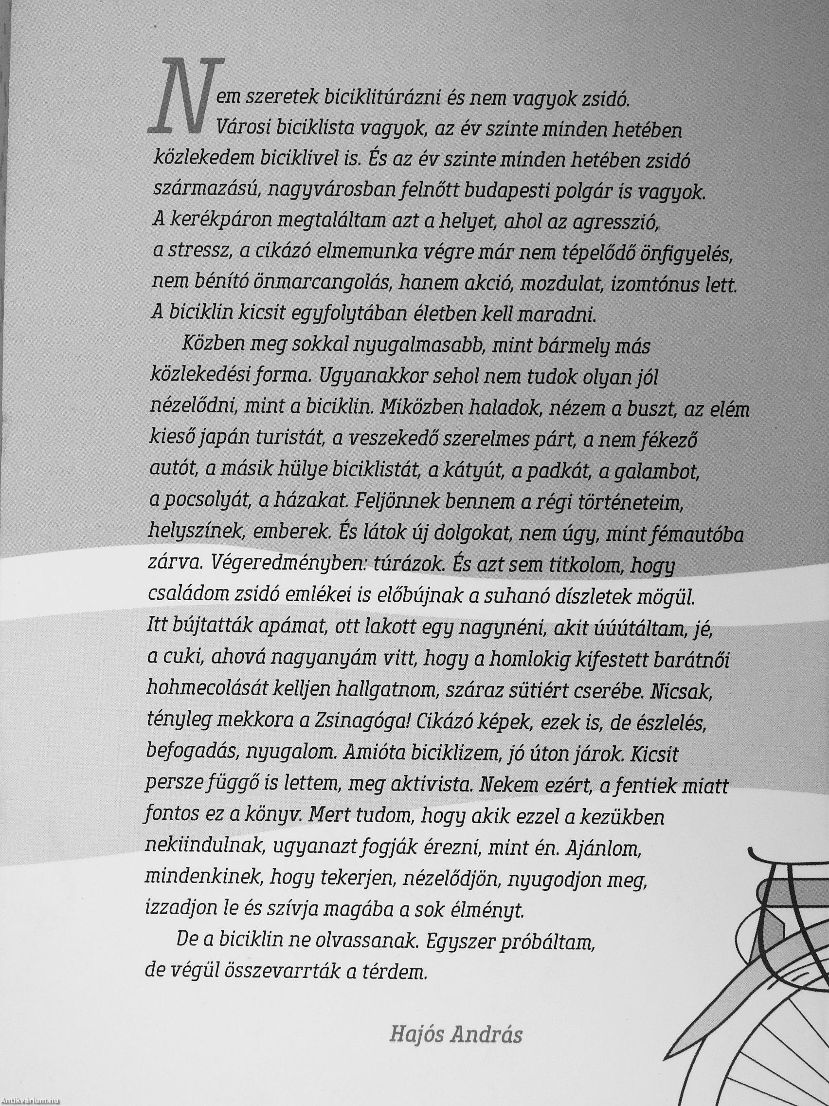 Közben meg sokkal nyugalmasabb, mint bármely más közlekedési forma. Ugyanakkor sehol nem tudok olyan jól nézelődni, mint a biciklin. Miközben haladok, nézem a buszt, az elém kieső japán turistát, a veszekedő szerelmes párt, a nem fékező autót, a másik hülye biciklistát, a kátyút, a padkát, a galambot, a pocsolyát, a házakat Feljönnek bennem a régi történeteim, helyszínek, emberek. És látok új dolgokat, nem úgy, mint fémautóba zárva. Végeredményben: túrázok. És azt sem titkolom, hogy családom zsidó emlékei is előbújnak a suhanó díszletek mögül. Itt bújtatták apámat, ott lakott egy nagynéni, akit úúútáltam, jé, a cuki, ahová nagyanyám vitt, hogy a homlokig kifestett barátnői hohmecolását kelljen hallgatnom, száraz sütiért cserébe. Nicsak, tényleg mekkora a Zsinagógai Cikázó képek, ezek is, de észlelés, befogadás, nyugalom. Amióta biciklizem, jó úton járok. Kicsit persze függő is lettem, meg aktivista. Nekem ezért, a fentiek miatt fontos ez a könyv. Mert tudom, hogy akik ezzel a kezükben nekiindulnak, ugyanazt fogják érezni, mint én. Ajánlom, mindenkinek, hogy tekerjen, nézelődjön, nyugodjon meg, izzadjon le és szívja magába a sok élményt