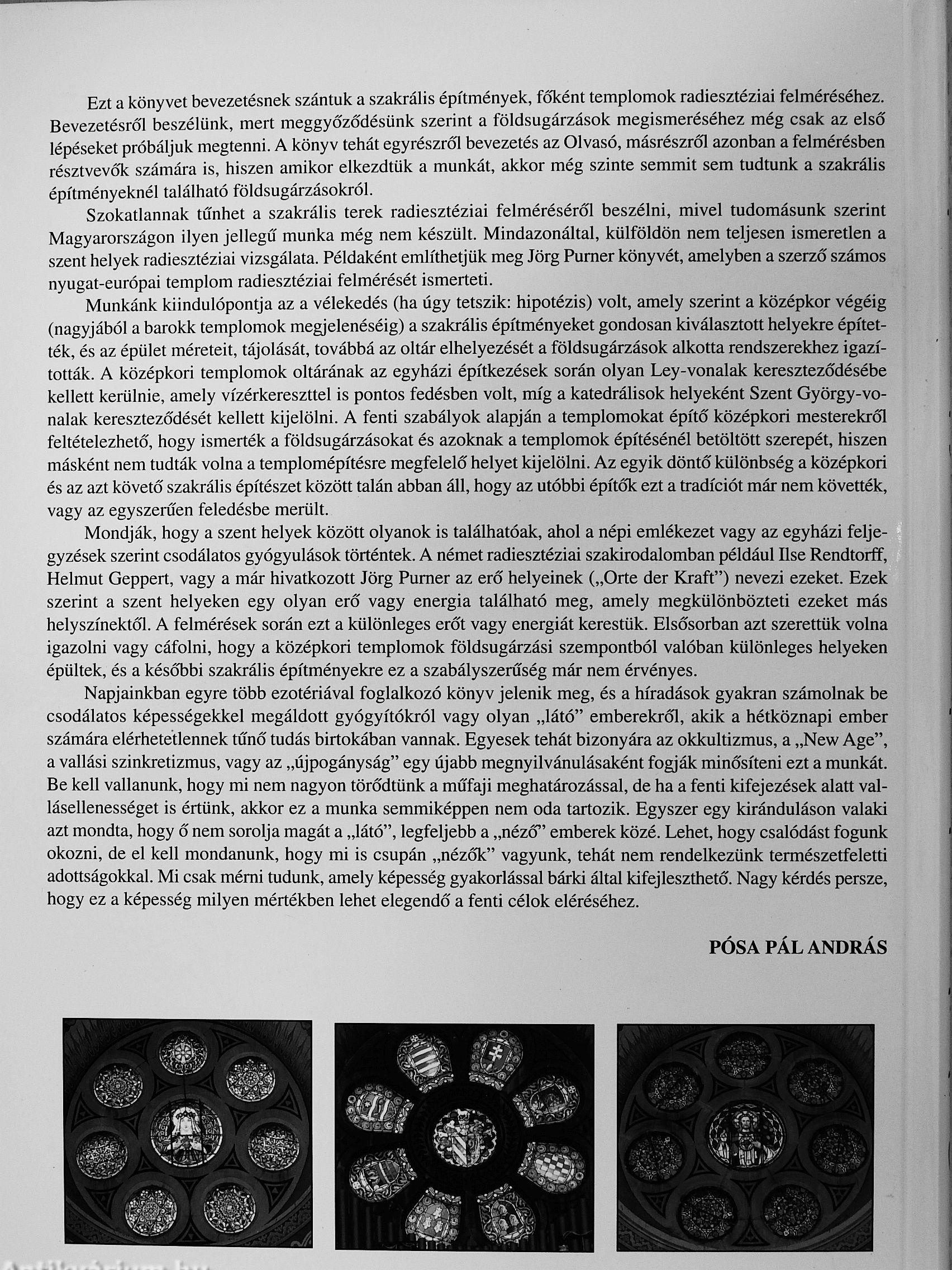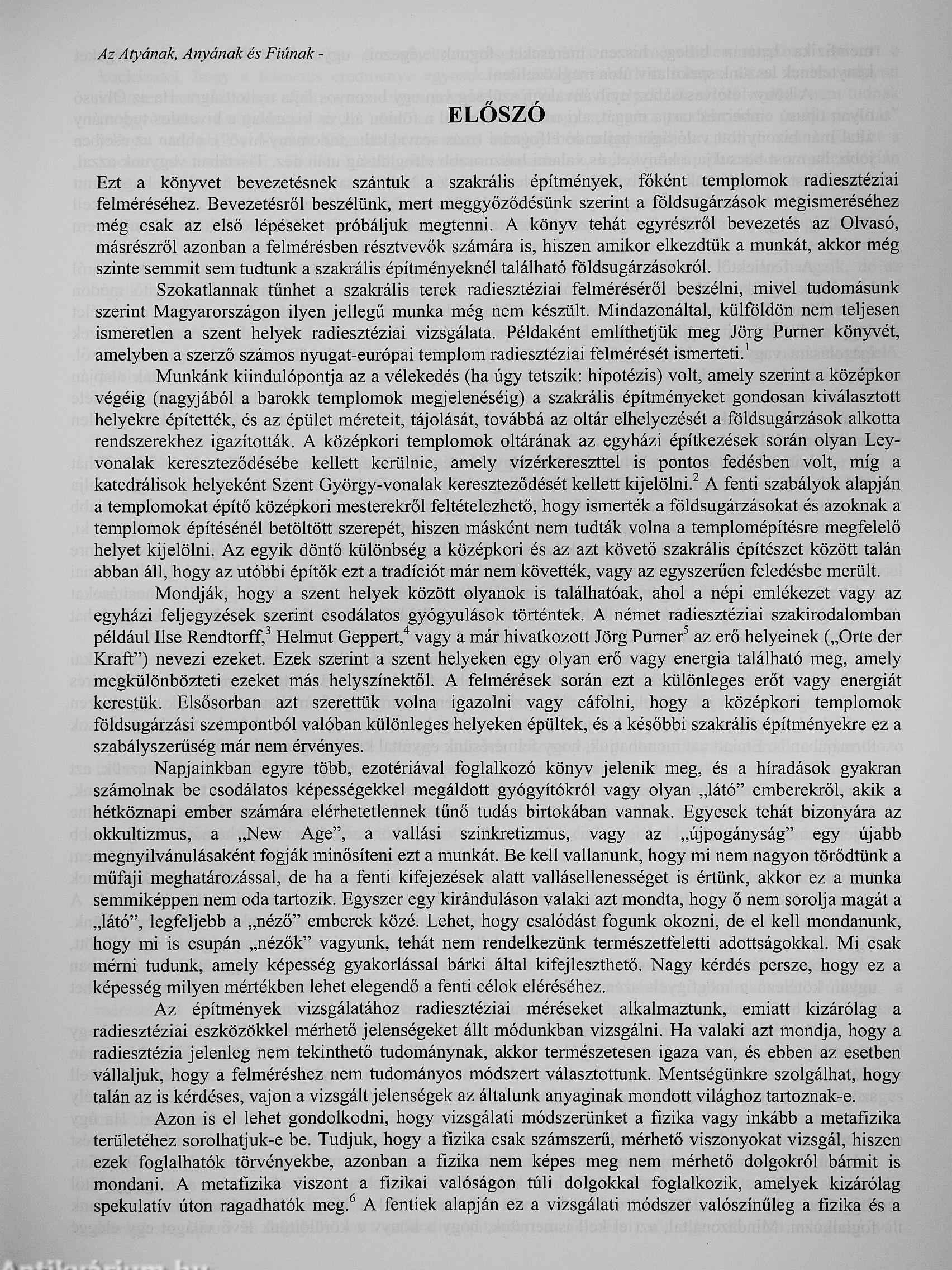 Ezt a könyvet bevezetésnek szántuk a szakrális építmények, főként templomok radiesztéziai felméréséhez. Bevezetésről beszélünk, mert meggyőződésünk szerint a földsugárzások megismeréséhez még csak az első lépéseket próbáljuk megtenni. A könyv tehát egyrészről bevezetés az Olvasó, másrészről azonban a felmérésben résztvevóTc számára is, hiszen amikor elkezdtük a munkát, akkor még szinte semmit sem tudtunk a szakrális építményeknél található földsugárzásokról.