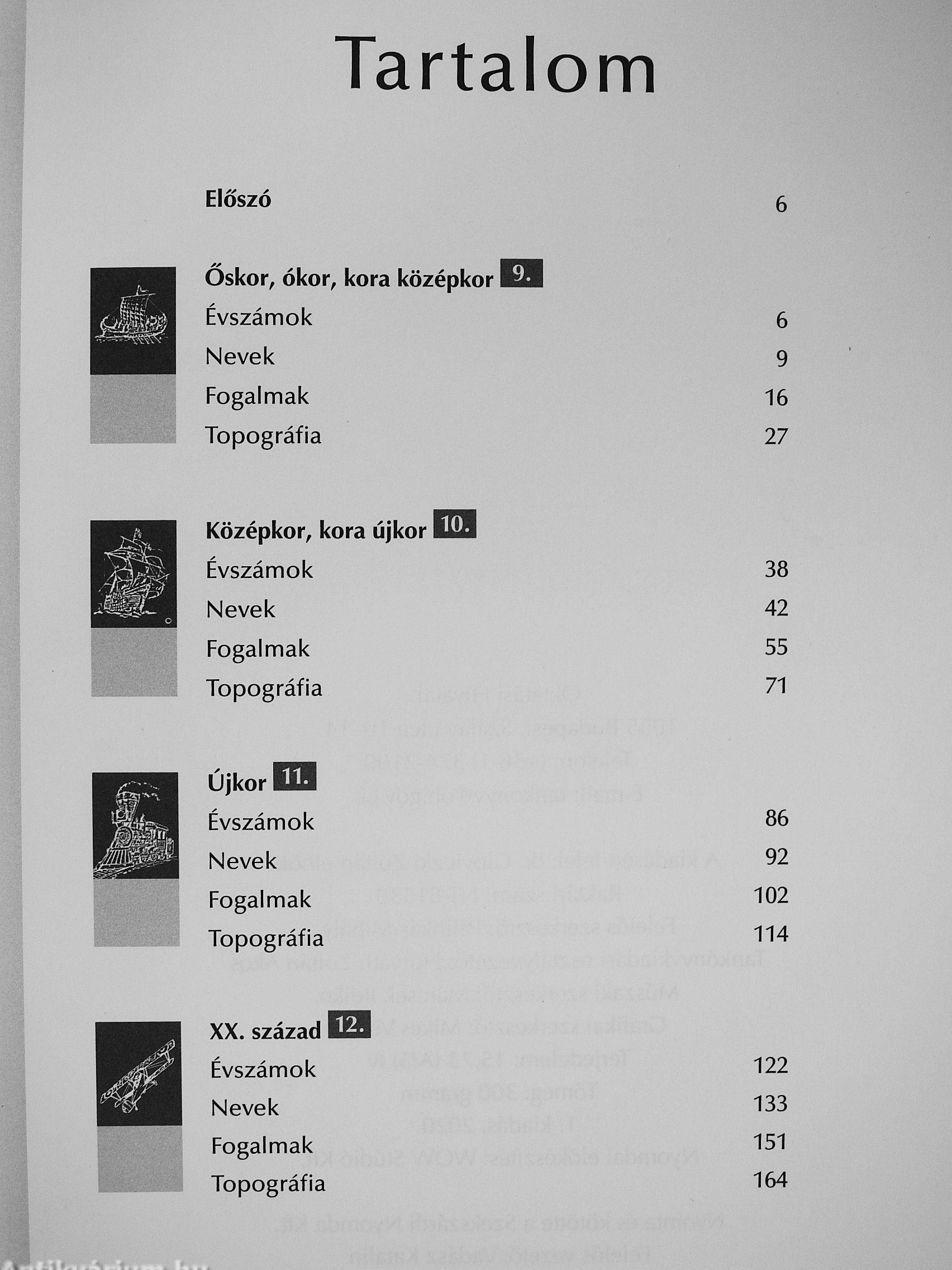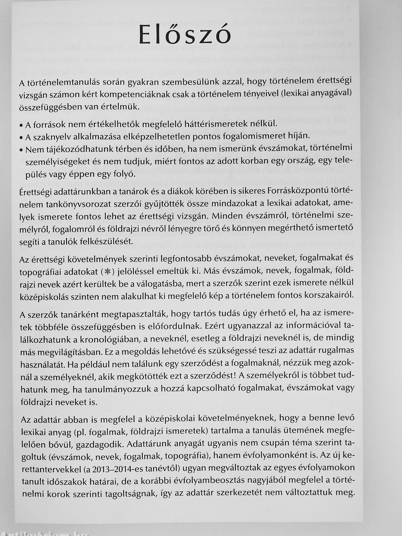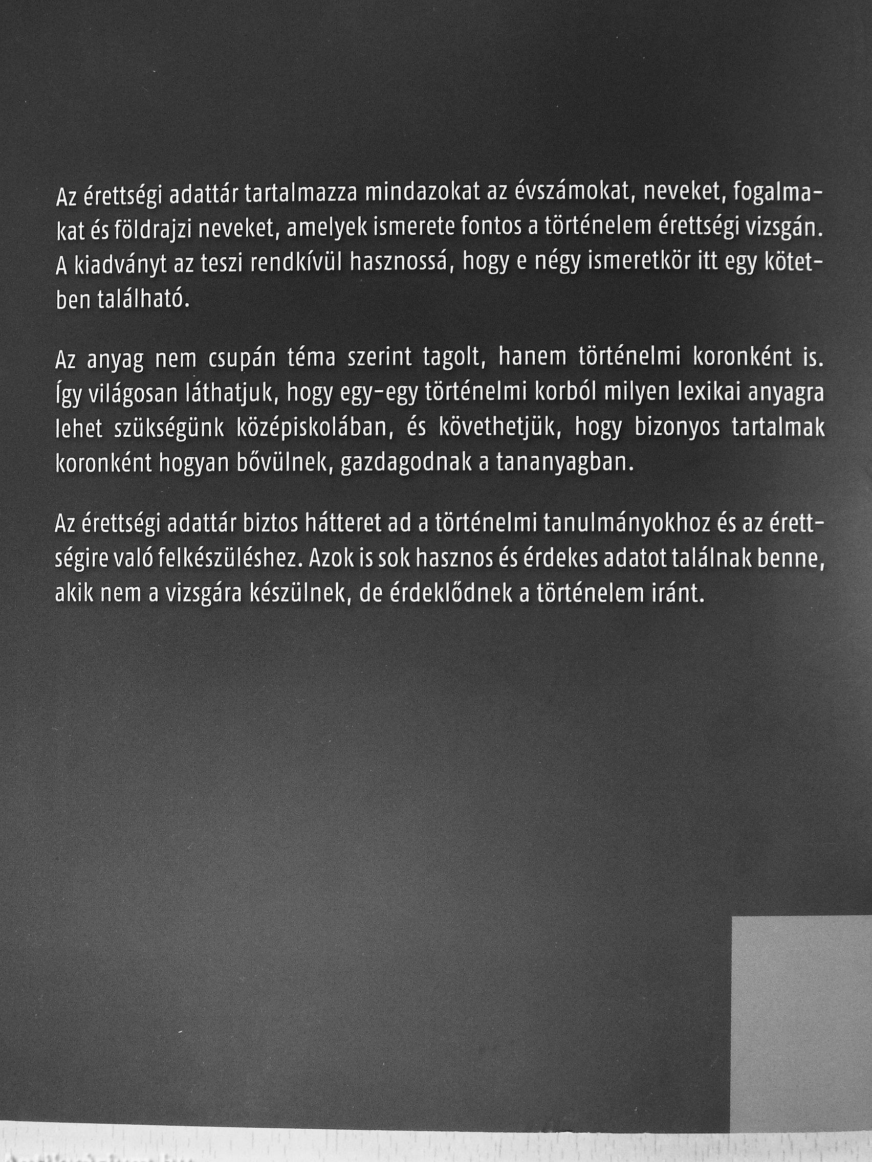 Az érettségi adattár tartalmazza mindazokat az évszámol(at, nevelhet, fogalma-l(at és földrajzi neveket, amelyek ismerete fontos a történelem érettségi vizsgán. A kiadványt az teszi rendkívül hasznossá, hogy e négy ismeretkör itt egy kötetben található.