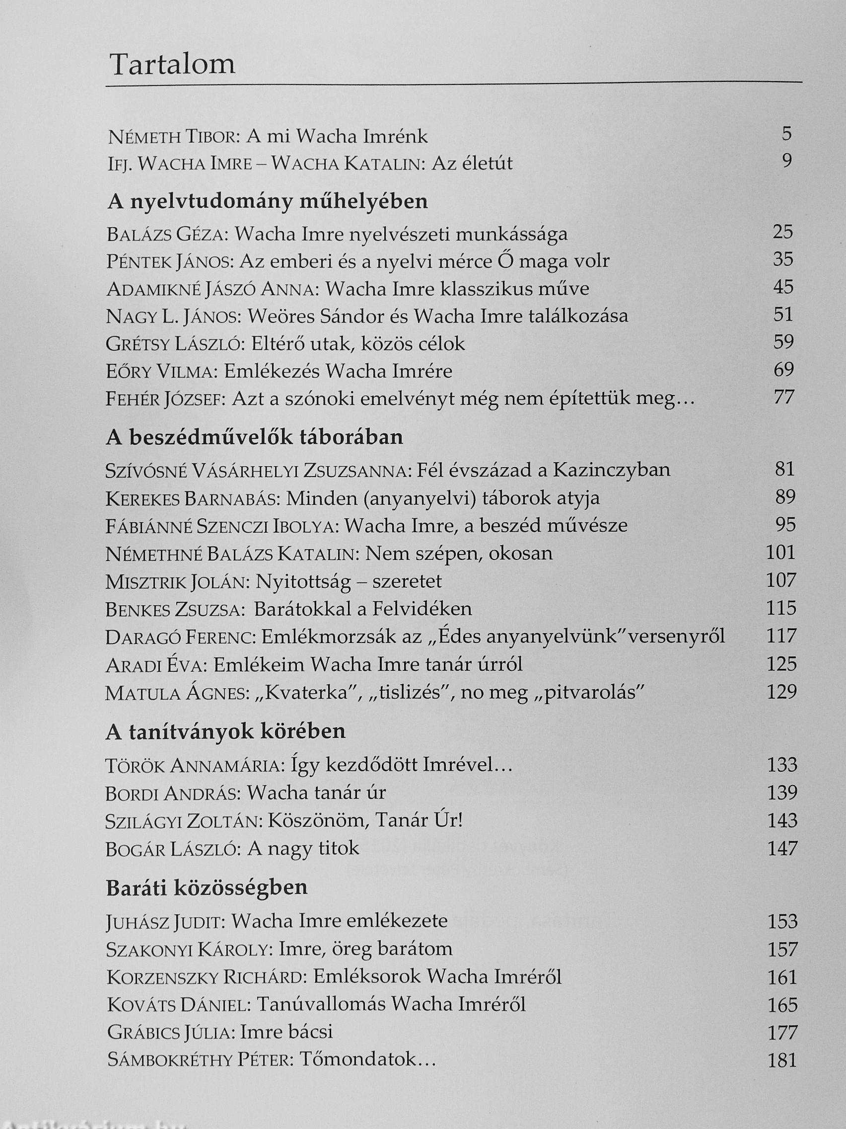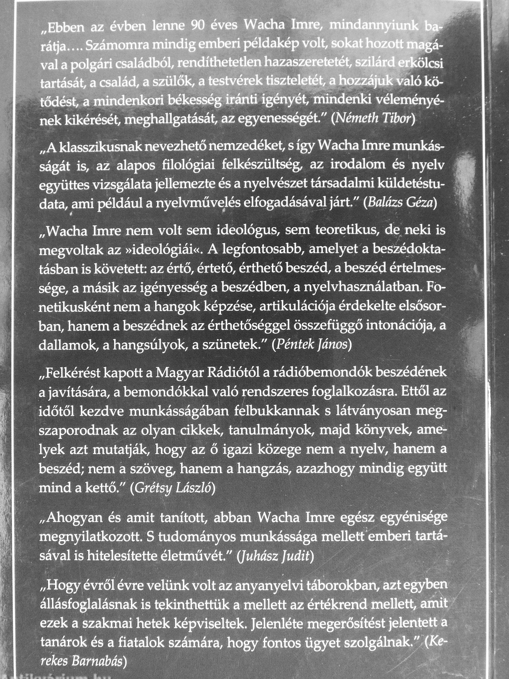 „Wacha Imre nem volt sem ideológus, sem teoretikus, de neki is megvoltak az »ideológiái«. A legfontosabb, amelyet a beszédoktatásban is követett: az értő, értető, érthető beszéd, a beszéd értelmes-sége, a másik az igényesség a beszédben, a nyelvhasználatban. Fonetikusként nem a hangok képzése, artikulációja érdekelte elsősorban, hanem a beszédnek az érthetőséggel összefüggő intonációja, a dallamok, a...