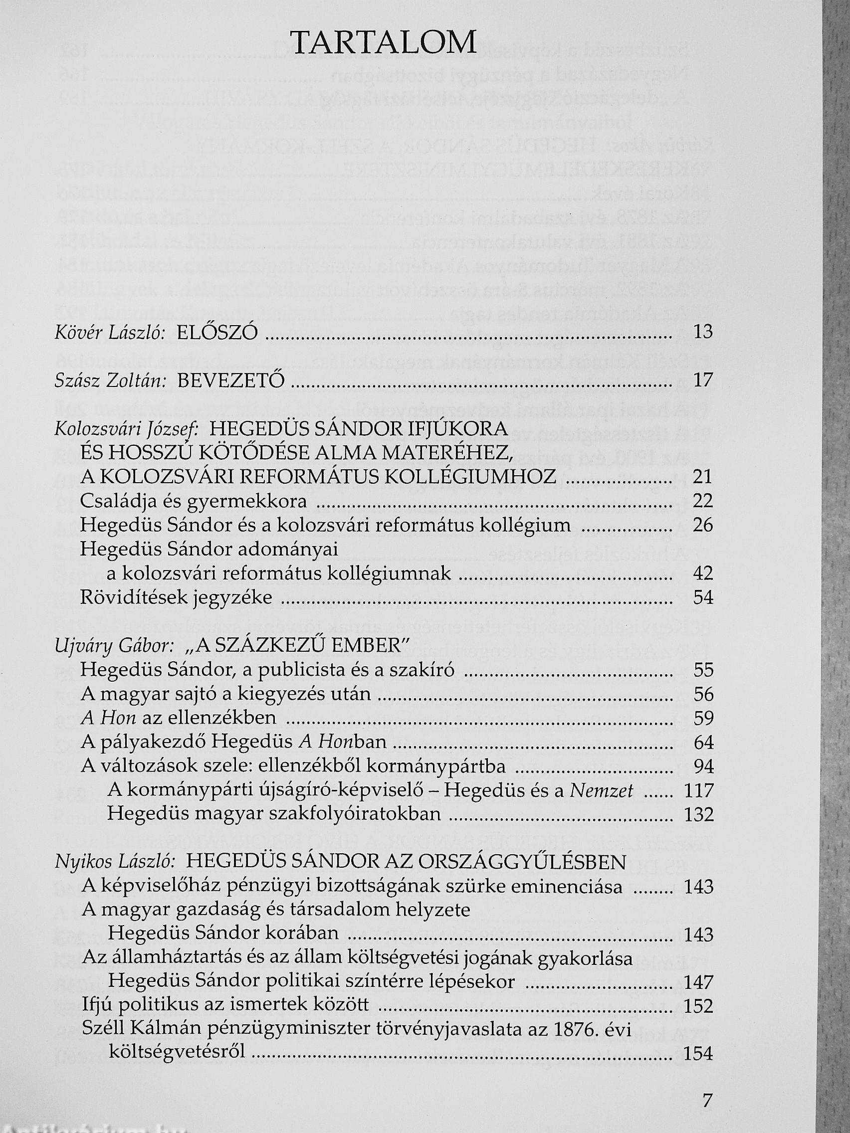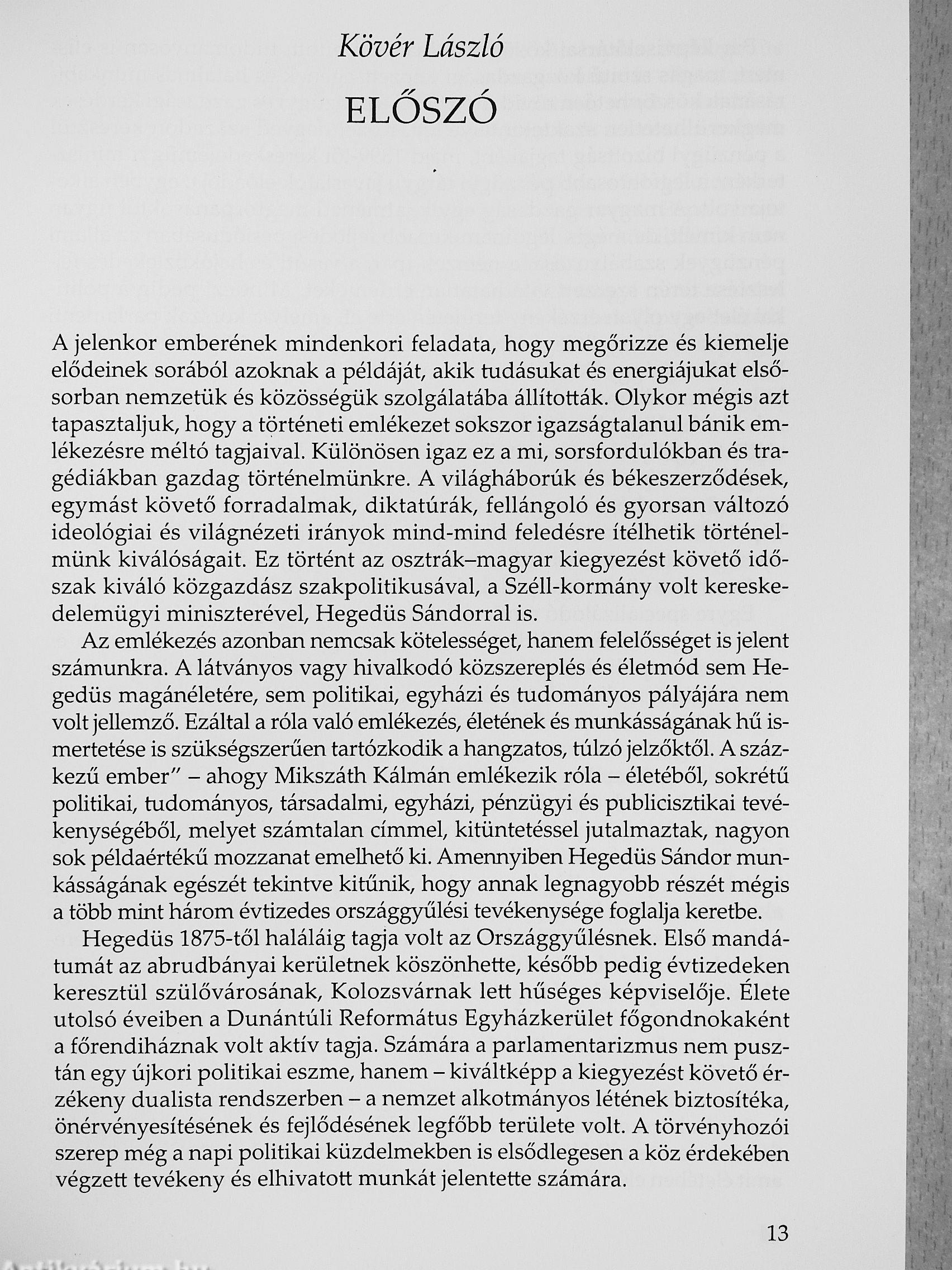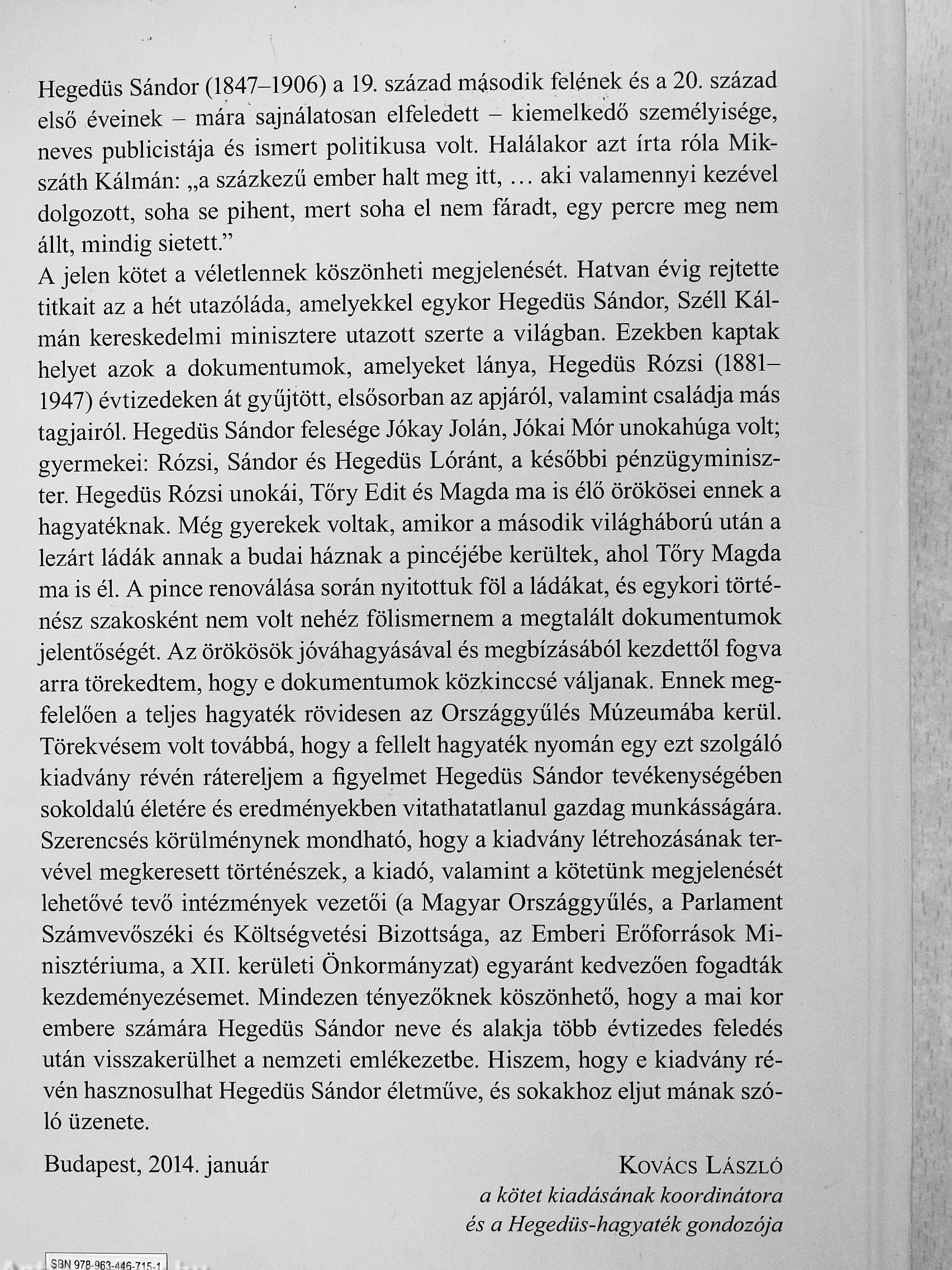 A jelen kötet a véletlennek köszönheti megjelenését. Hatvan évig rejtette titkait az a hét utazóláda, amelyekkel egykor Hegedűs Sándor, Széli Kálmán kereskedelmi minisztere utazott szerte a világban. Ezekben kaptak helyet azok a dokumentumok, amelyeket lánya. Hegedűs Rózsi (1881-1947) évtizedeken át gyűjtött, elsősorban az apjáról, valamint családja más tagjairól. Hegedűs Sándor felesége Jókay Jolán, Jókai Mór unokahúga volt; gyermekei: Rózsi, Sándor és Hegedűs Lóránt, a későbbi pénzügyminiszter Hegedűs Rózsi unokái, Töry Edit és Magda ma is élö örökösei ennek a hagyatéknak. Még gyerekek voltak, amikor a második világháború után a lezárt ládák annak a budai háznak a pincéjébe kerültek, ahol Töry Magda ma is él. A pince renoválása során nyitottuk föl a ládákat, és egykori történész szakosként nem volt nehéz fölismernem a megtalált dokumentumok jelentőségét. Az örökösök jóváhagyásával és megbízásából kezdettől fogva arra törekedtem, hogy e dokumentumok közkinccsé váljanak. Ennek megfelelően a teljes hagyaték rövidesen az Országgyűlés Múzeumába kerül. Törekvésem volt továbbá, hogy a fellelt hagyaték nyomán egy ezt szolgáló kiadvány révén rátereljem a figyelmet Hegedűs Sándor tevékenységében sokoldalú életére és eredményekben vitathatatlanul gazdag munkásságára. Szerencsés körülménynek mondható, hogy a kiadvány létrehozásának tervével megkeresett történészek, a kiadó, valamint a kötetünk megjelenését lehetővé tevő intézmények vezetői (a Magyar Országgyűlés, a Parlament Számvevőszéki és Költségvetési Bizottsága, az Emberi Erőforrások Minisztériuma, a XIL kerületi Önkormányzat) egyaránt kedvezően fogadták kezdeményezésemet. Mindezen tényezőknek köszönhető, hogy a mai kor embere számára Hegedűs Sándor neve és alakja több évtizedes feledés után visszakerülhet a nemzeti emlékezetbe. Hiszem, hogy e kiadvány révén hasznosulhat Hegedűs Sándor életmüve, és sokakhoz eljut mának szóló üzenete.